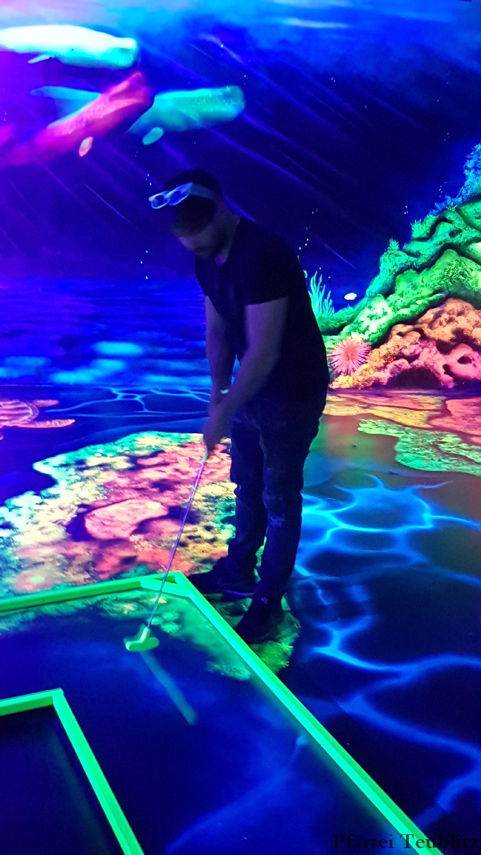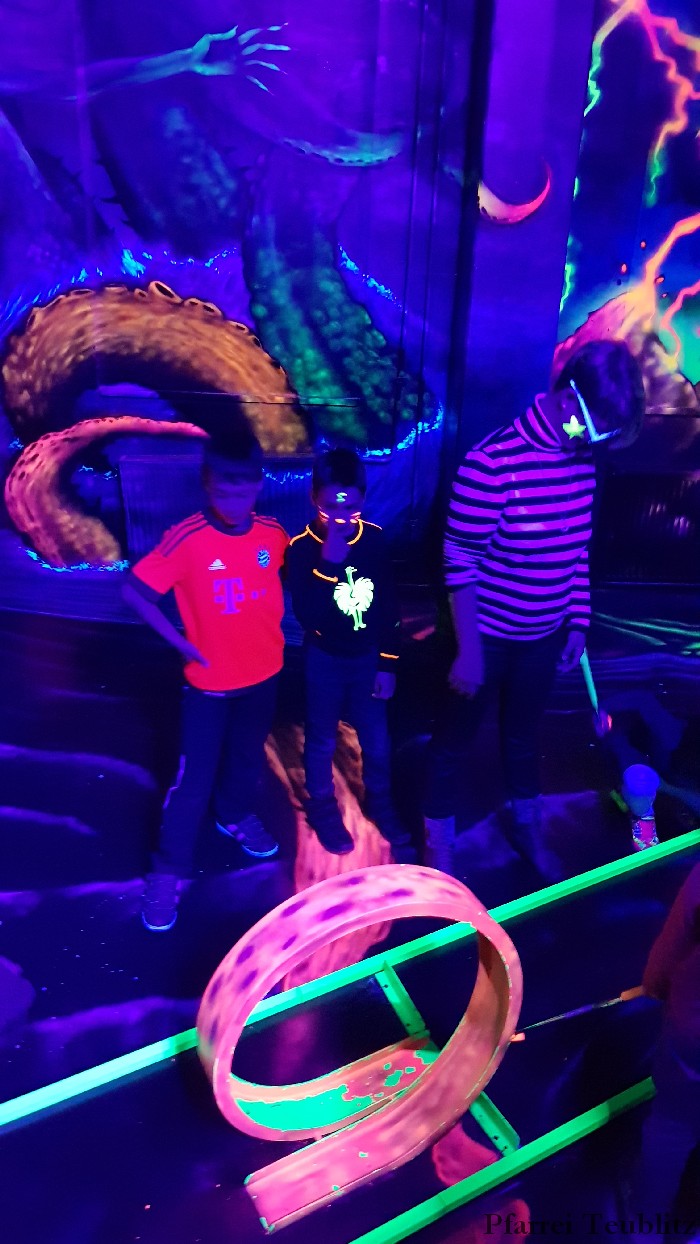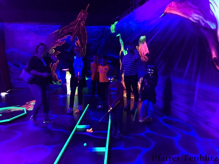 Zwei Wochen später waren dann fast alle mit dabei, als es zum 3D-Minigolf ging. Gleich mit vier, teilweise sehr großen Gruppen ging man an den Start. Damit die Spieler beim mystischen Schwarzlicht in der Halle noch „stylischer“ rüber kommen, wurde vorher noch mit greller Farbe geschminkt. Mit Golfbällen, Schlägern und 3D-Brillen ausgestattet spielten die Teams sich durch die 18 Minigolfbahnen. Dabei wurden viele fantastische Themenwelten „erforscht“, wie z. B. der Weltraum, der Dschungel oder die Tiefsee.