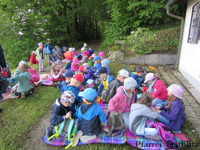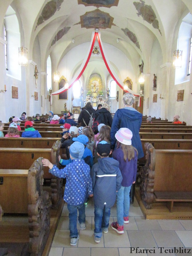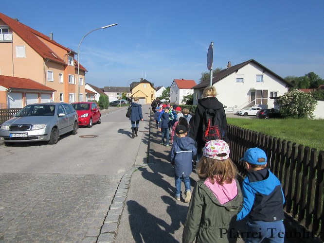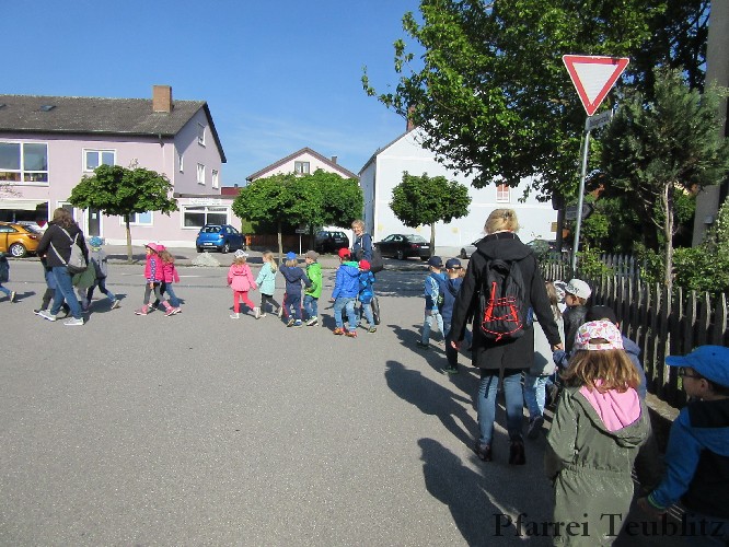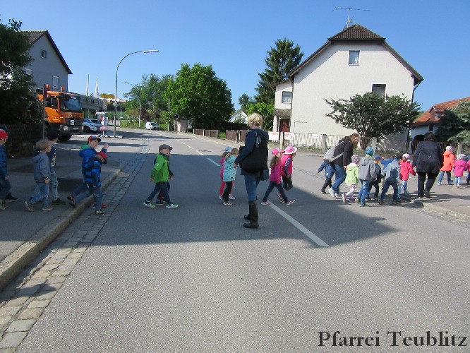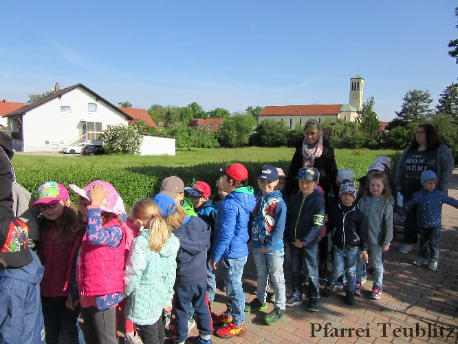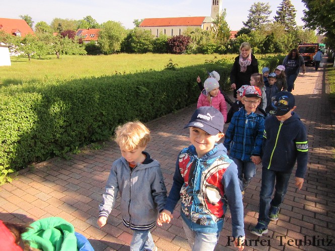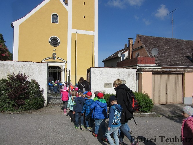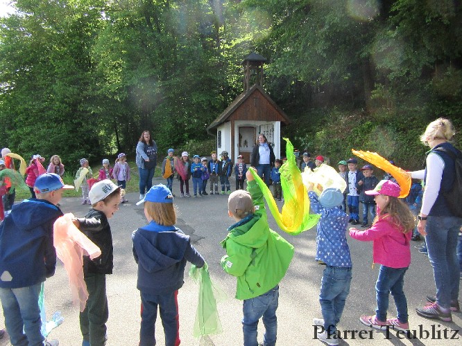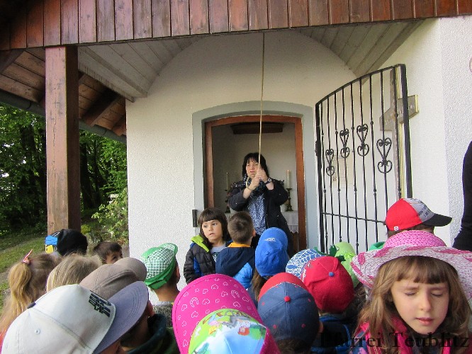 Der Monat Mai ist bekannt für seine Wallfahrten und Bittgänge. Wieder einmal machten sich die Kinder der Kindergartengruppen „Gabriel“ und „Franziskus“ mit ihren Leiterinnen auf zur großen Wallfahrt nach Saltendorf. In der Marienkirche dort staunten die Kinder über den Erzengel Gabriel, der in einem Deckenbild der Kirche groß abgebildet ist, wie er Maria die Botschaft bringt, dass sie Jesus, den Sohn Gottes, gebären soll. Danach marschierten die Kleinen zur Franziskuskappelle. Dort wurde gebetet, gesungen und getanzt, so wie es auch der heilige Franziskus immer getan hat. Dazu wurde auch die Glocke der Kapelle geläutet.