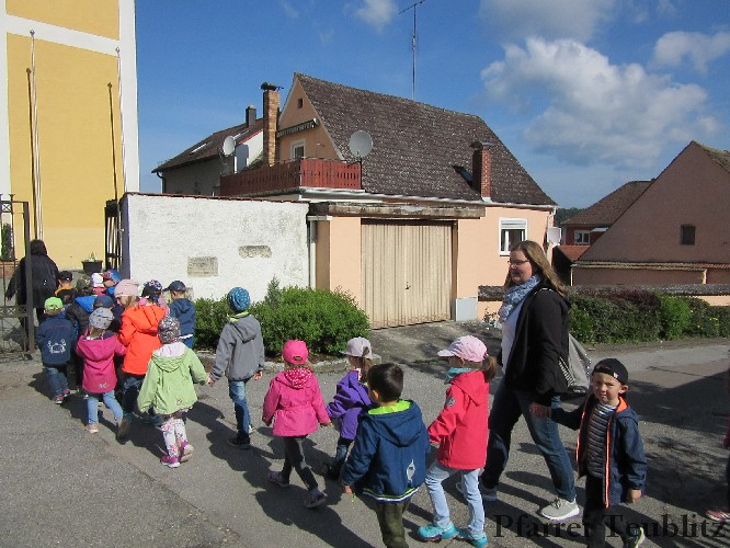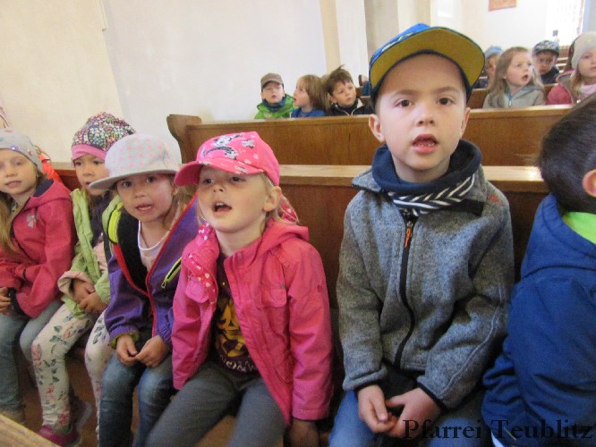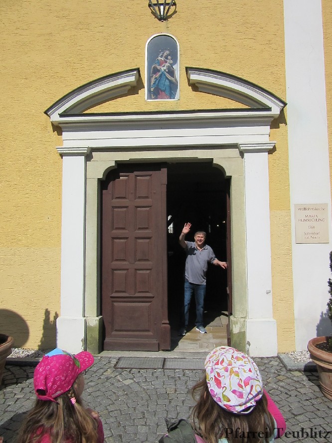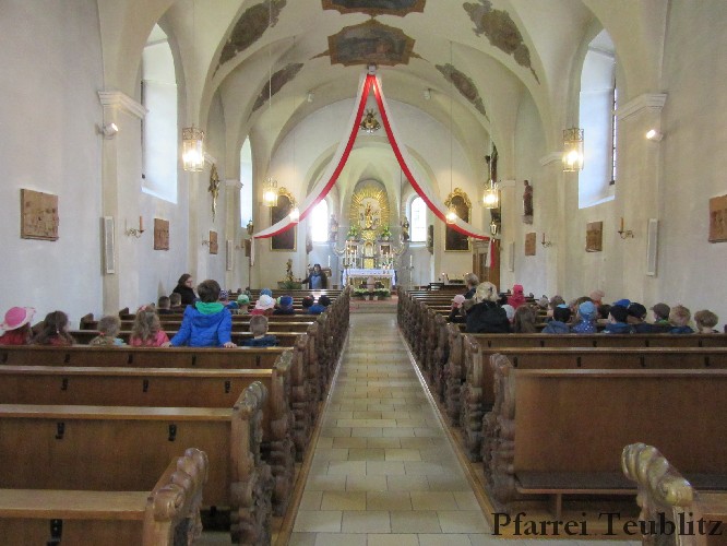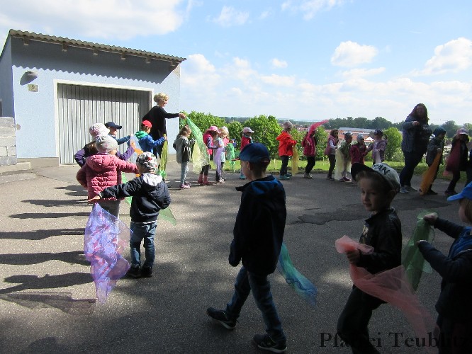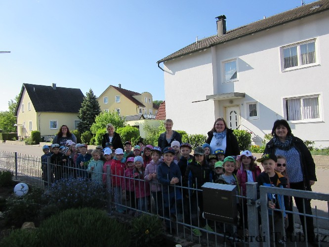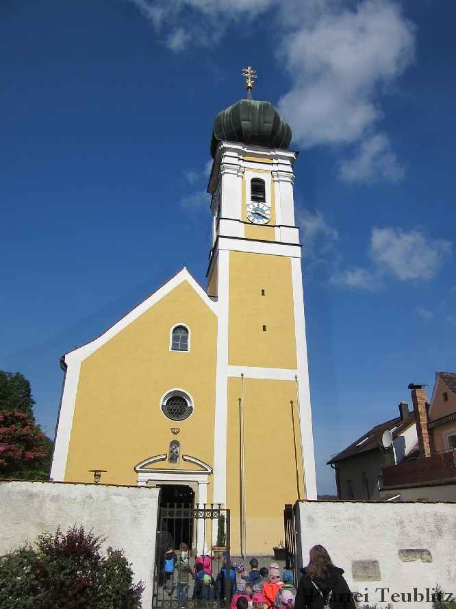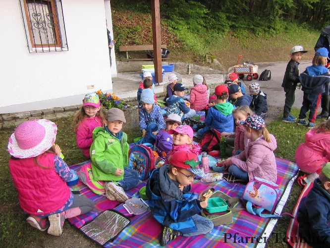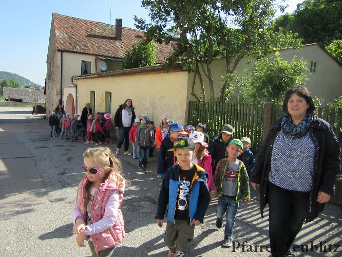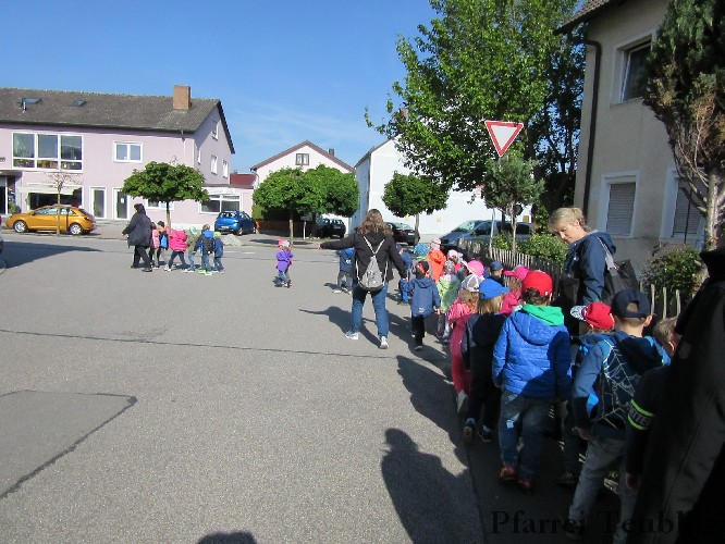 Der Monat Mai ist bekannt für seine Wallfahrten und Bittgänge. Wieder einmal machten sich die Kinder der Kindergartengruppen „Gabriel“ und „Franziskus“ mit ihren Leiterinnen auf zur großen Wallfahrt nach Saltendorf. In der Marienkirche dort staunten die Kinder über den Erzengel Gabriel, der in einem Deckenbild der Kirche groß abgebildet ist, wie er Maria die Botschaft bringt, dass sie Jesus, den Sohn Gottes, gebären soll. Danach marschierten die Kleinen zur Franziskuskappelle. Dort wurde gebetet, gesungen und getanzt, so wie es auch der heilige Franziskus immer getan hat. Dazu wurde auch die Glocke der Kapelle geläutet.