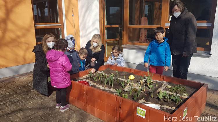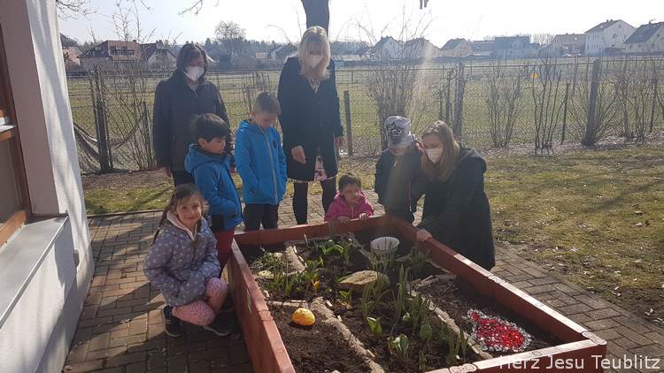 In ökumenischer Verbundenheit gestalteten die Kindergärtnerinnen einen spirituellen Pflanzgarten mit den Kindern. Die ganze Fastenzeit hindurch wurden das Hochbeet von den Kinder bepflanz und gestaltet. Im scheinbar leblosen Beet wuchsen über die Wochen blühende Pflanzen. „Die Kinder können sinnlich begreifen, dass nach dem Tod das Leben wartet.“, erzählt Kindergärtnerin Monika Böhm.