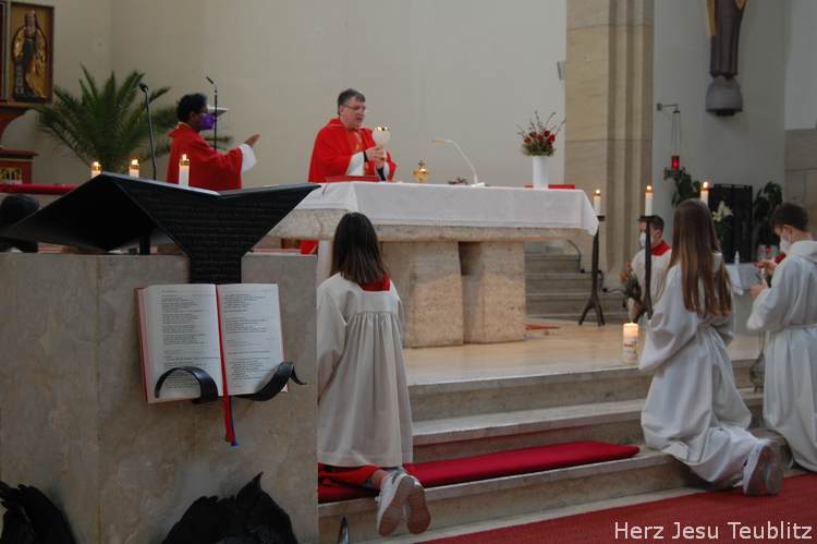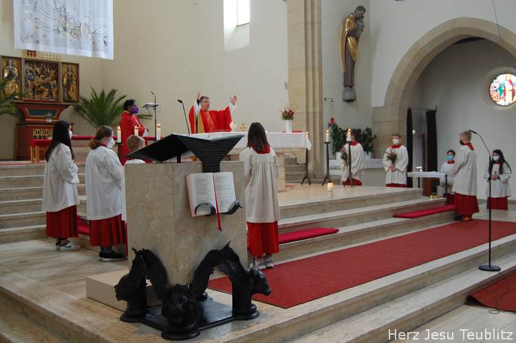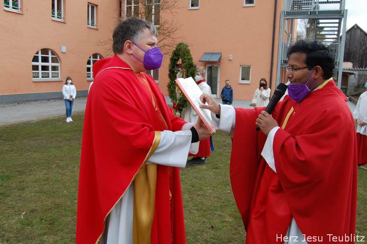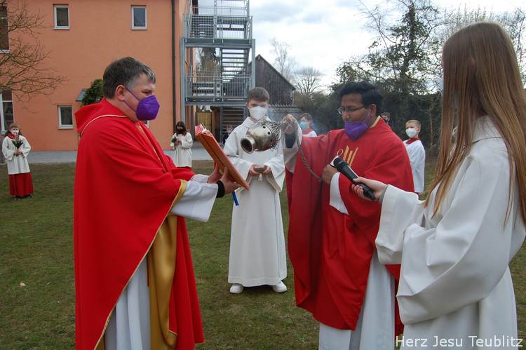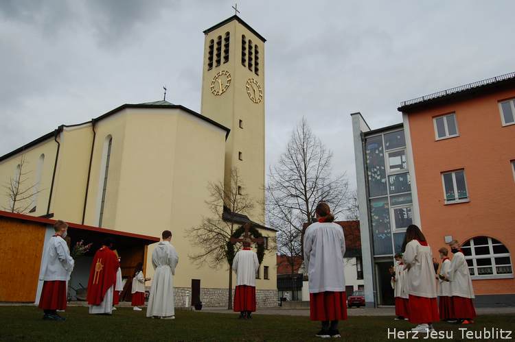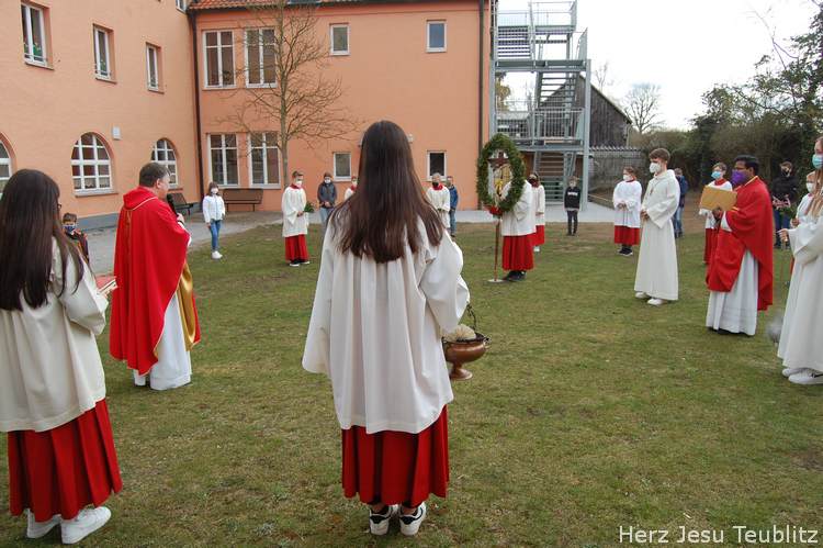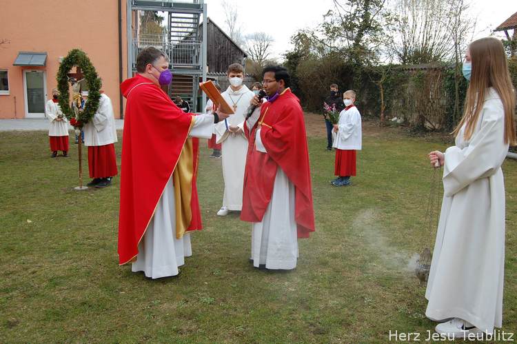 Feierlich wurde in Teublitz die Heilige Woche, die Karwoche, eröffnet. Bei den Gottesdiensten am Palmsonntag wurden Palmbuschen gesegnet und das Evangelium vom Einzug Jesu in Jerusalem verkündet. Dafür versammelten sich die liturgischen Dienste im Pfarrgarten, um genügend Abstand halten zu können.