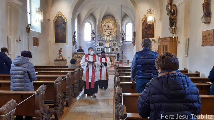 Am Karfreitag Vormittag betete die Pfarrgemeinde Herz Jesu den Kreuzweg um 9 Uhr in der altehrwürdigen Wallfahrtskirche zu Saltendorf. Viele Gläubige hatten sich versammelt, um dem Leiden des Herrn zu gedenken und mit ihm den Kreuzweg zu gehen. Um 10 Uhr wurde der Kreuzweg vor dem Altenheim gebetet. Dazu versammelten sich die Bewohnenden auf den Balkonen und hinter den Fenstern.
