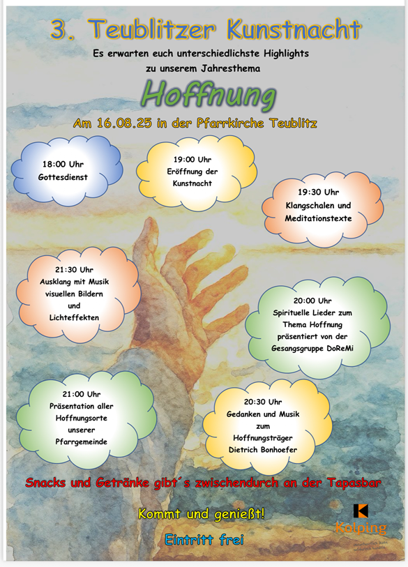 Am Samstag, den 16.8.2025 wurde die 3. Teublitzer Kunstnacht mit einem Gottesdienst in der Pfarrkirche Teublitz eröffnet. Schon zu Beginn verwies Pfarrer Lucas Lobmeier die Besucher auf das Jahresthema der Pfarrei: „Hoffnung“. Das Heilige Jahr 2025 steht unter dem Motto „Pilger der Hoffnung“. Dies war Inspiration auch in Teublitz Zeichen der Hoffnung zu setzen. Einige Veranstaltungen wie „Machs mal anders“ und eine „Hoffnungsmeditation“ fanden schon statt.