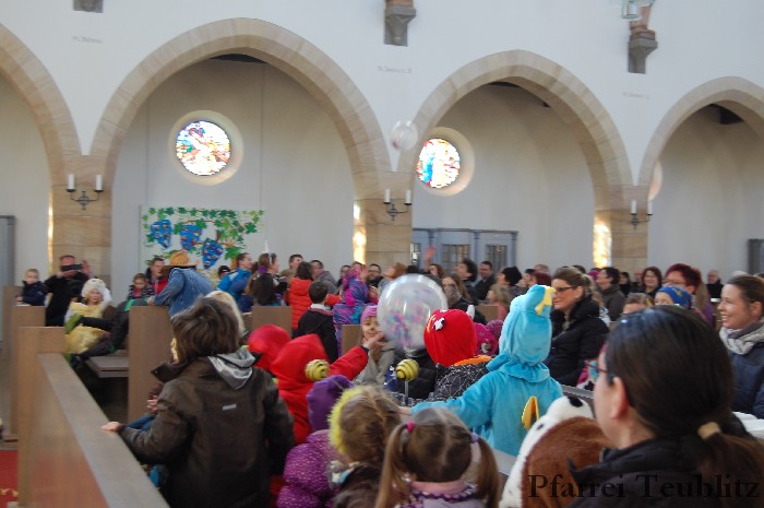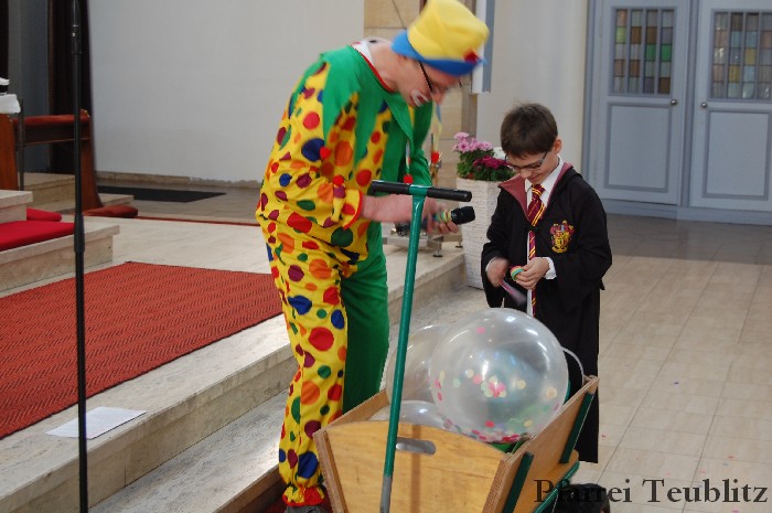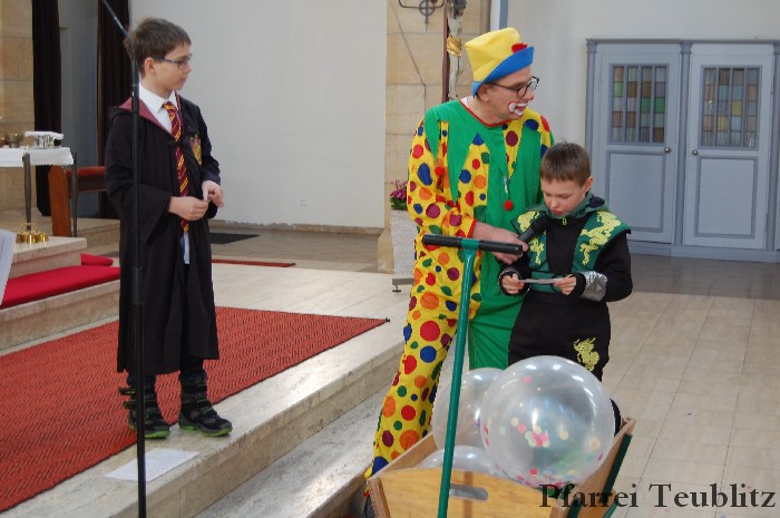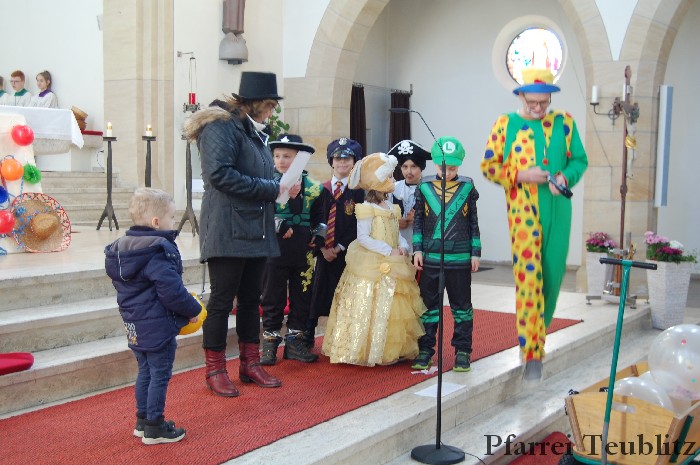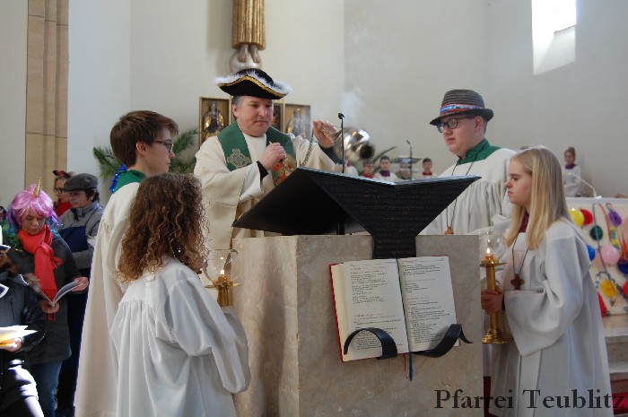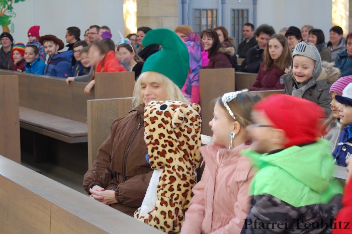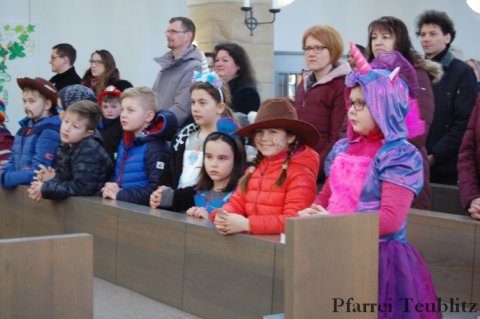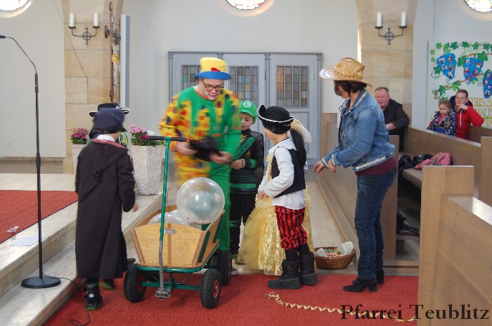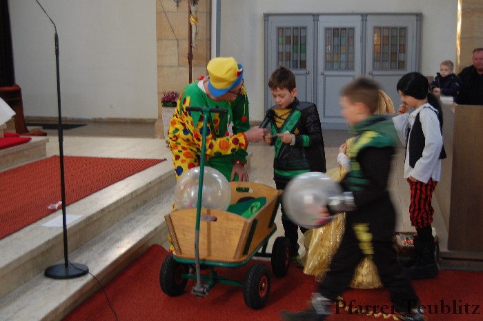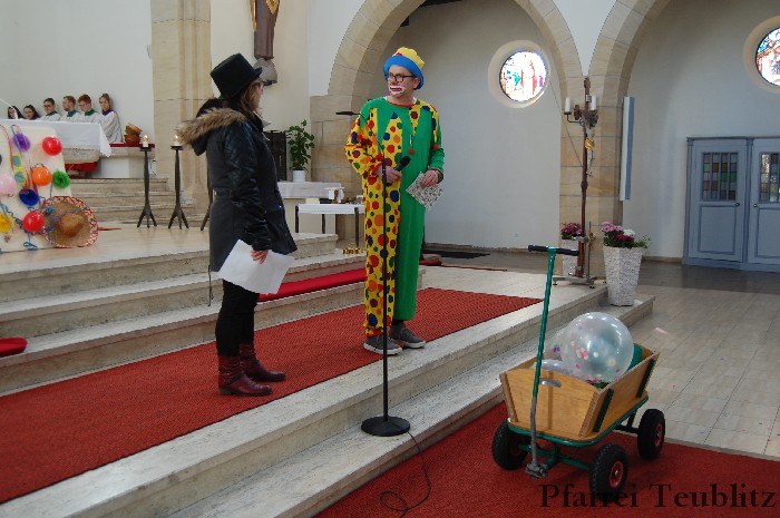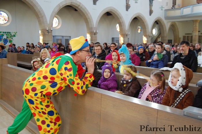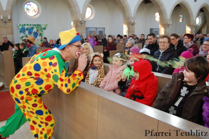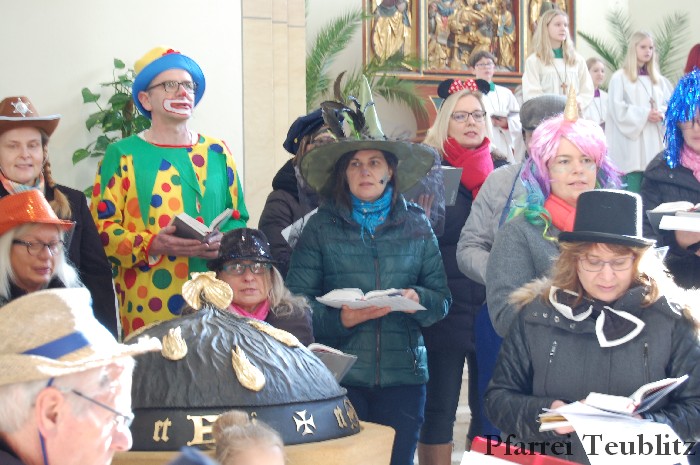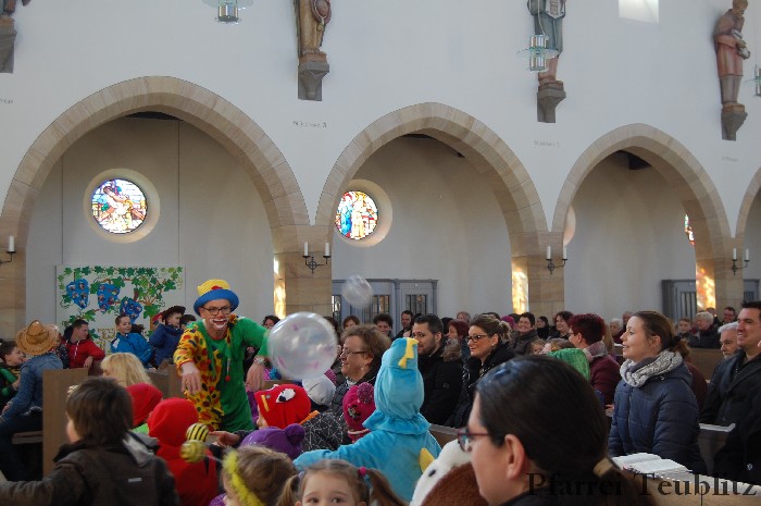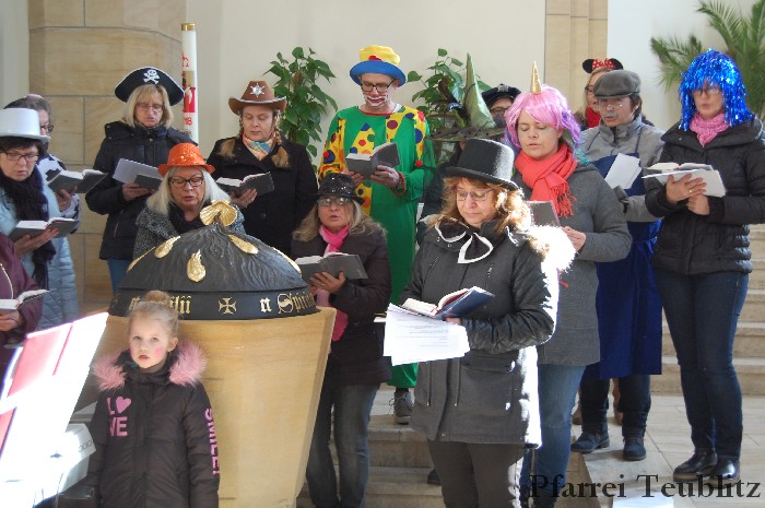Lustig und beschwingt ging es am 17. Februar im Familiengottesdienst zu. Denn die Kinder kamen verkleidet zum Familiengottesdienst in die Herz Jesu Kirche nach Teublitz. Das Familiengottesdienst-Team hatte sogar einen Clown engagiert, der den Kindern die Frohbotschaft Jesu Christi auslegte. Besonders freuten sich auch den Gottesdienst die Kinder des Teublitzer Kindergartens. Gemeinsam mit ihren Kindergärtnerinnen sangen sie einige Lieder. Musikalisch gestaltet wurde der Gottesdienst vom Gemeindechor unter Leitung von Dagmar Gawinoski, der im Wechsel mit der Kirchengemeinde sang.