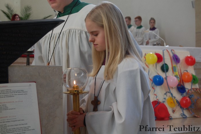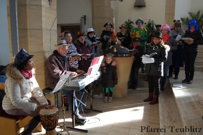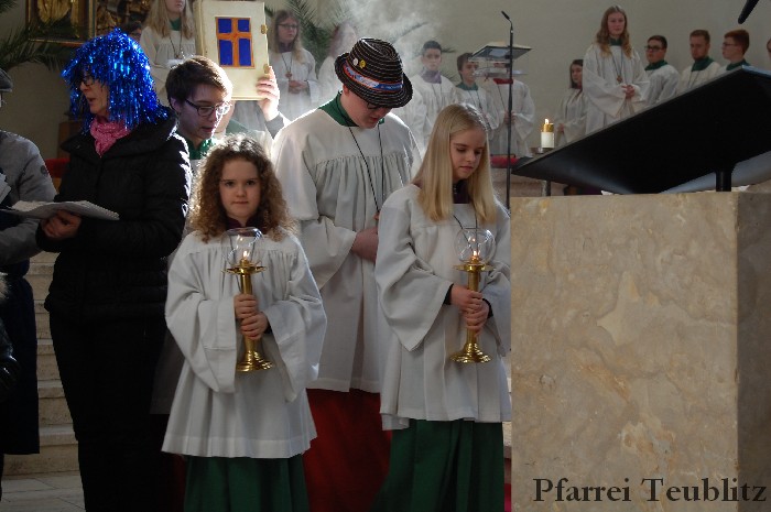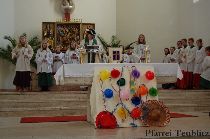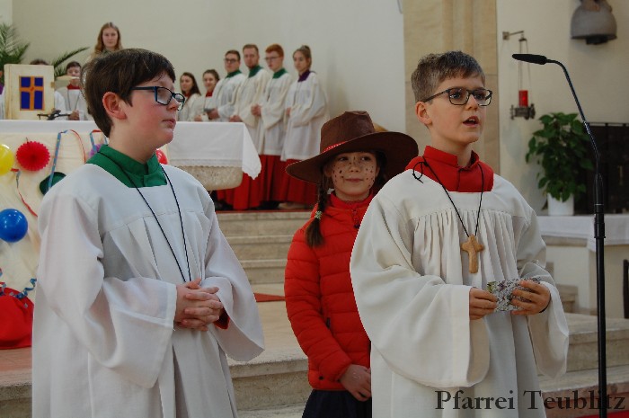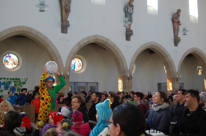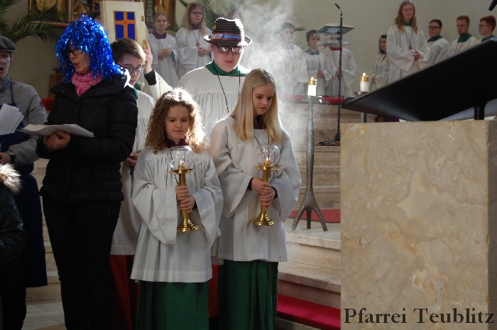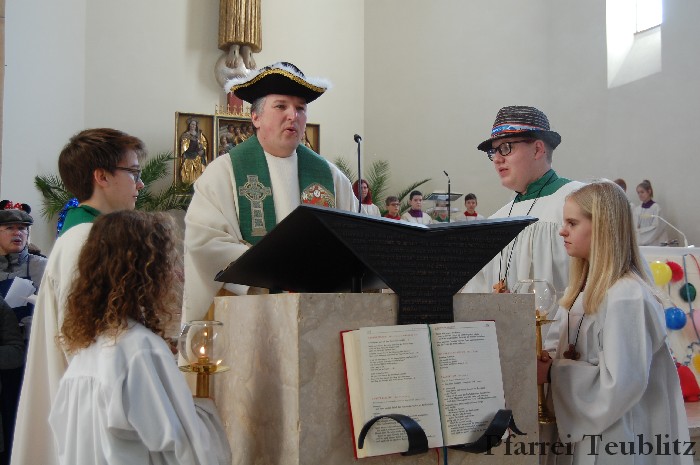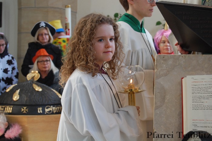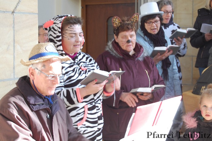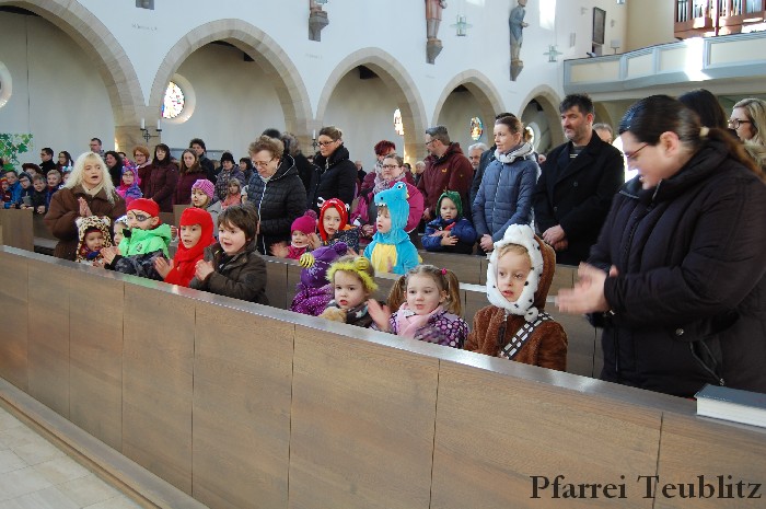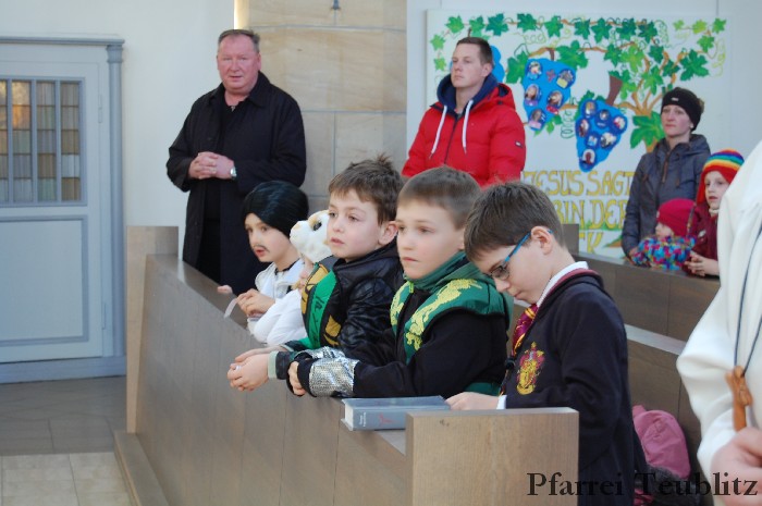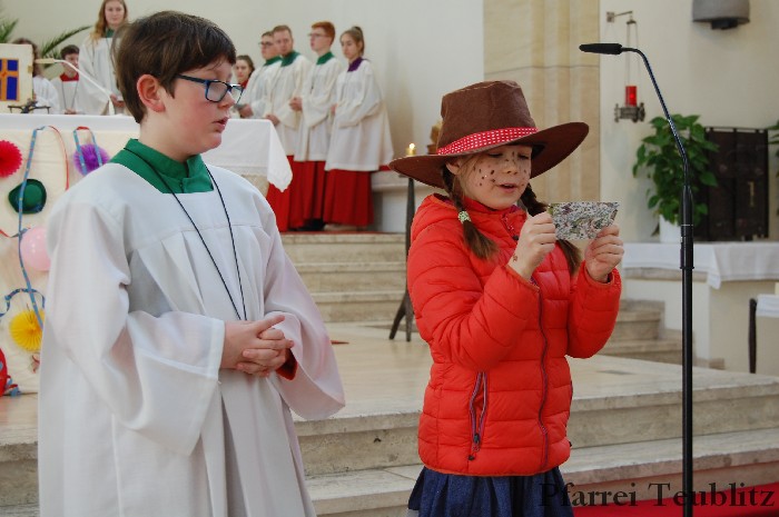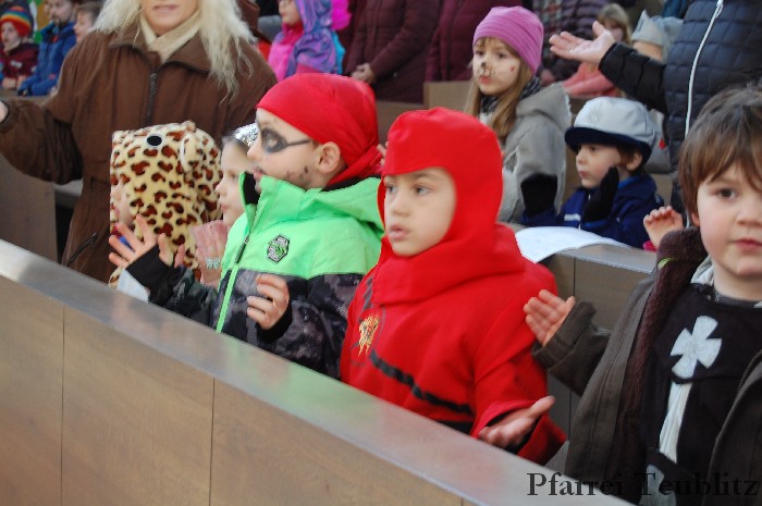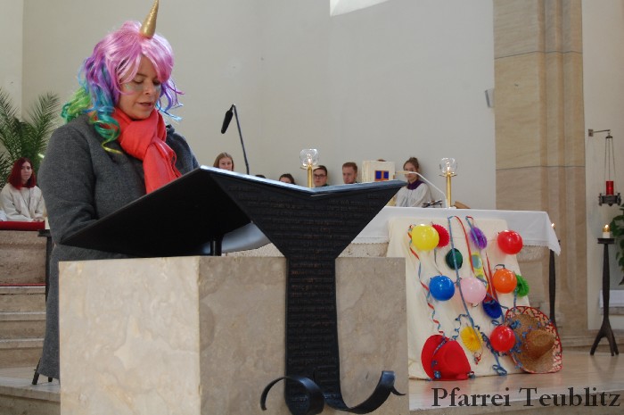 Lustig und beschwingt ging es am 17. Februar im Familiengottesdienst zu. Denn die Kinder kamen verkleidet zum Familiengottesdienst in die Herz Jesu Kirche nach Teublitz. Das Familiengottesdienst-Team hatte sogar einen Clown engagiert, der den Kindern die Frohbotschaft Jesu Christi auslegte. Besonders freuten sich auch den Gottesdienst die Kinder des Teublitzer Kindergartens. Gemeinsam mit ihren Kindergärtnerinnen sangen sie einige Lieder. Musikalisch gestaltet wurde der Gottesdienst vom Gemeindechor unter Leitung von Dagmar Gawinoski, der im Wechsel mit der Kirchengemeinde sang.