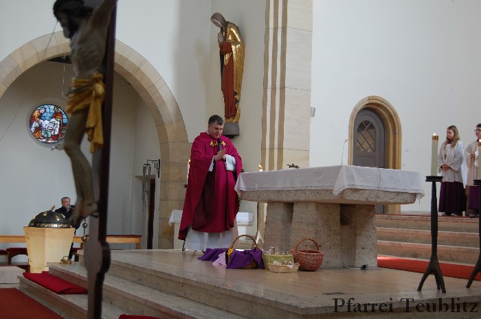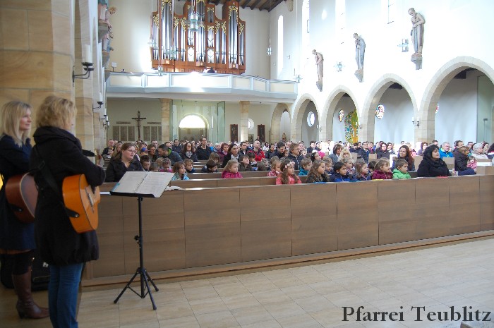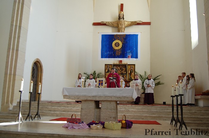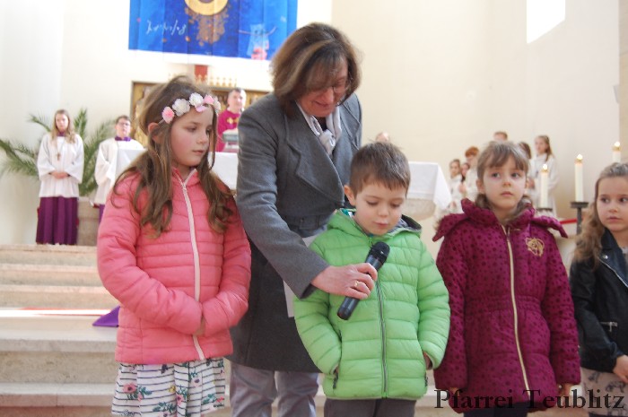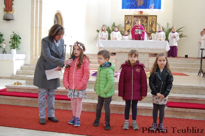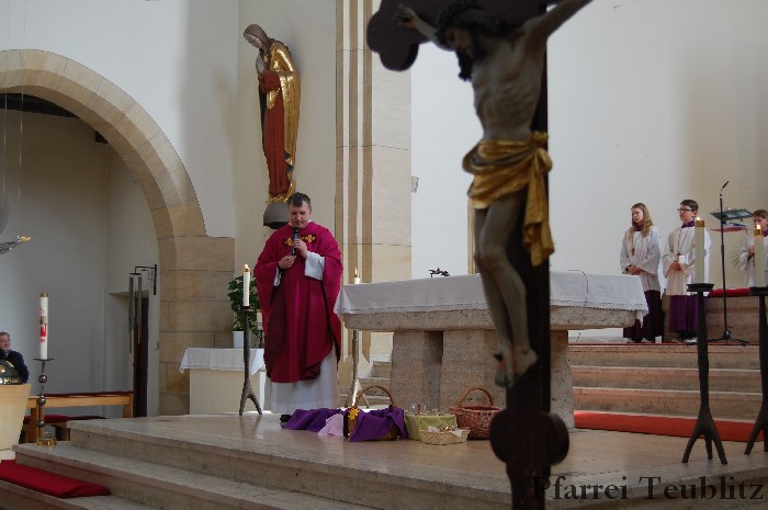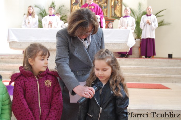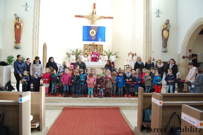Gemeinsam mit der Pfarrgemeinde feierten die Kinder- und Krippenkindern einen schönen Familiengottesdienst. Dabei sangen und beteten die Kinder zur Freude für die Gottesdienstgemeinde und zur Ehre Gottes mit. In seiner Predigt erklärte Pfarrer Hirmer den Kindern aber auch den Erwachsenen, warum das Kreuz zwei Balken hat. „Der eine Balken, von oben nach unten, verbindet Gott und die Menschen. Der andere die Menschen untereinander.“