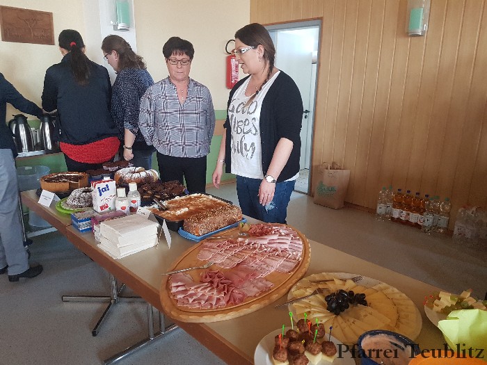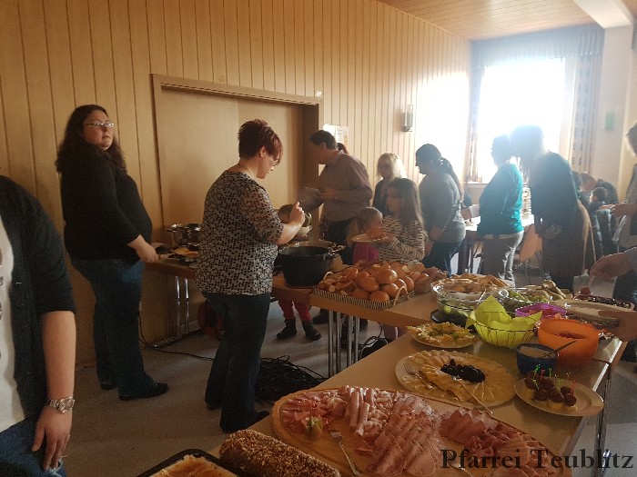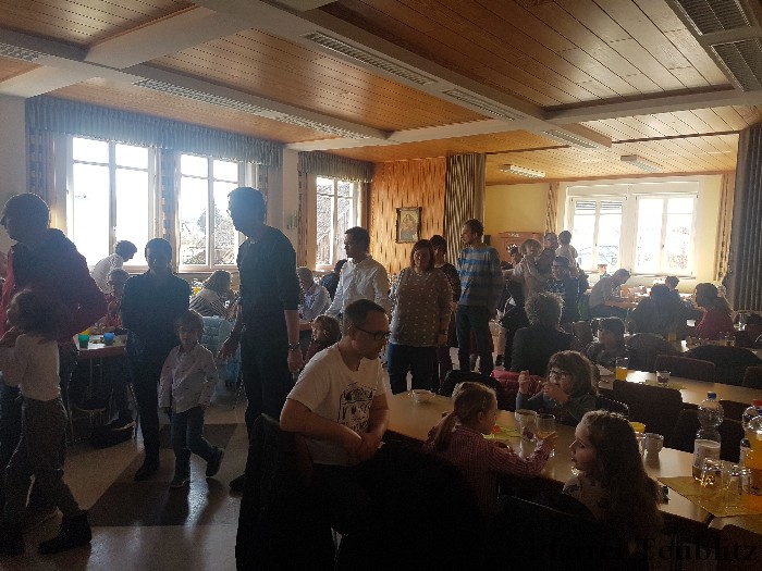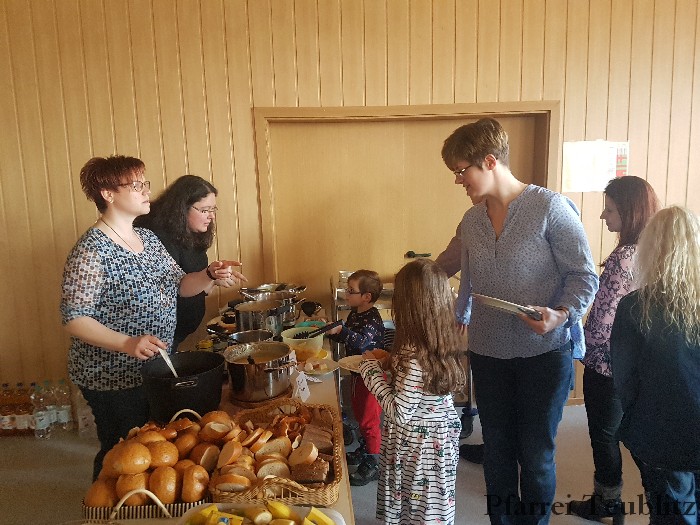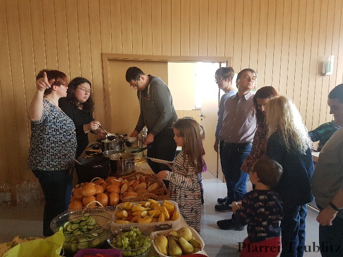 Nach dem Gottesdienst zogen die Familien der Kindergartenkinder in den Pfarrsaal weiter. Dort warte der Elternbeirat schon mit einem großen Buffet zum mittäglichen Brunch. Passend zur Fastenzeit wurden fünf verschiedenen Suppen angeboten, die reißenden Absatz fanden.