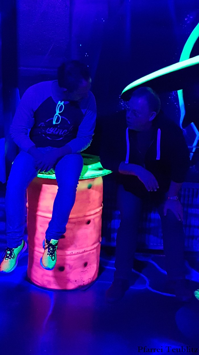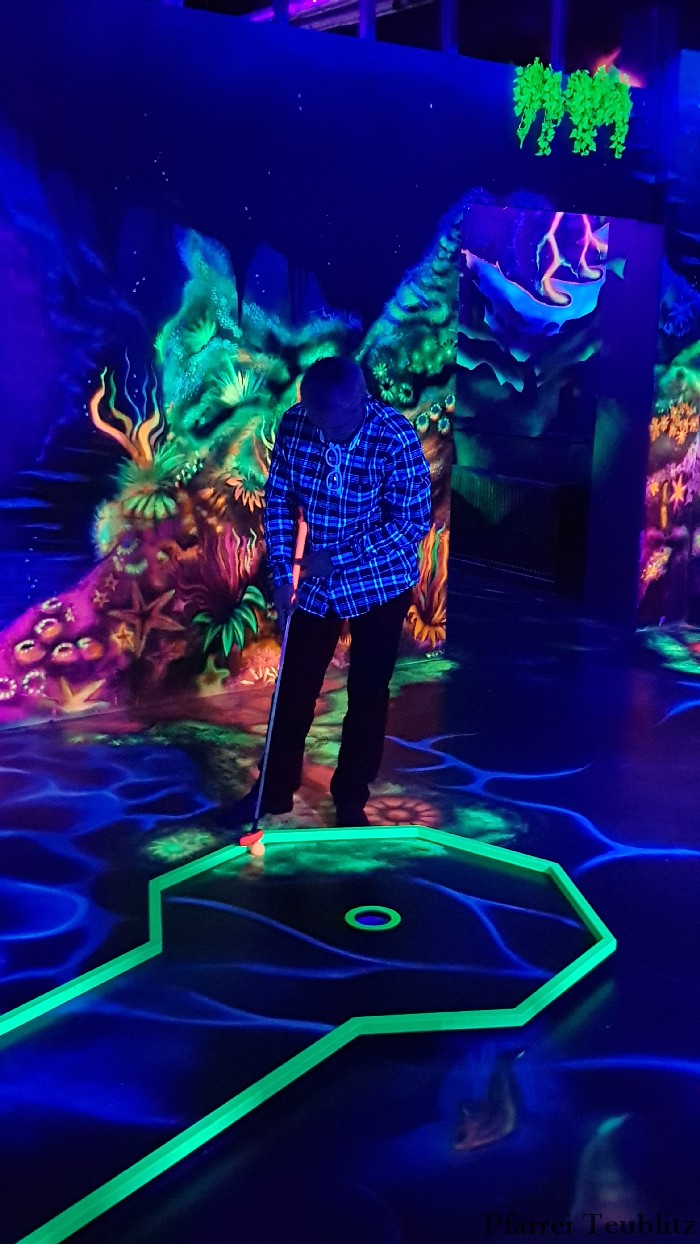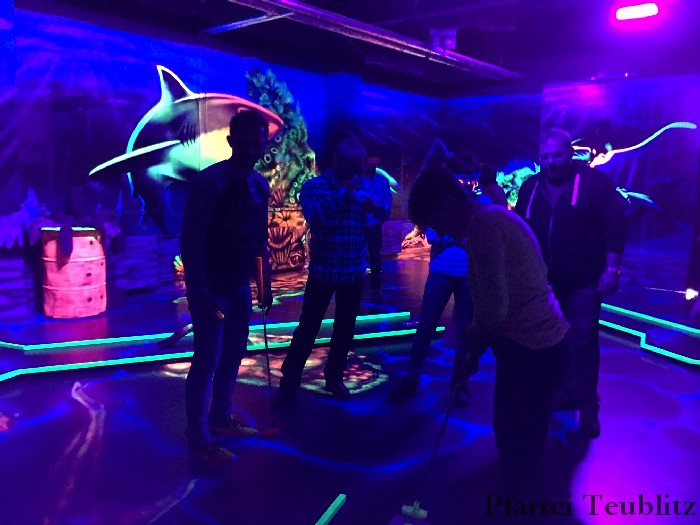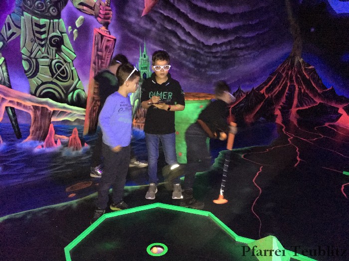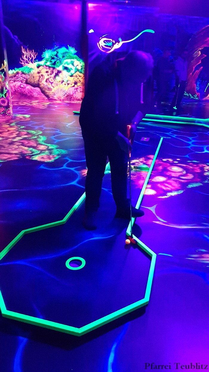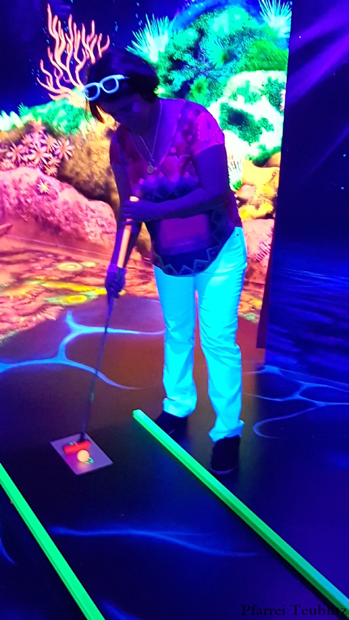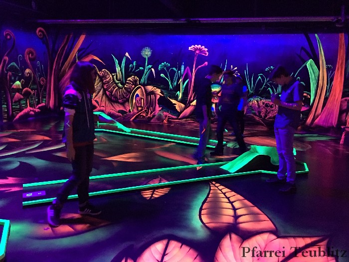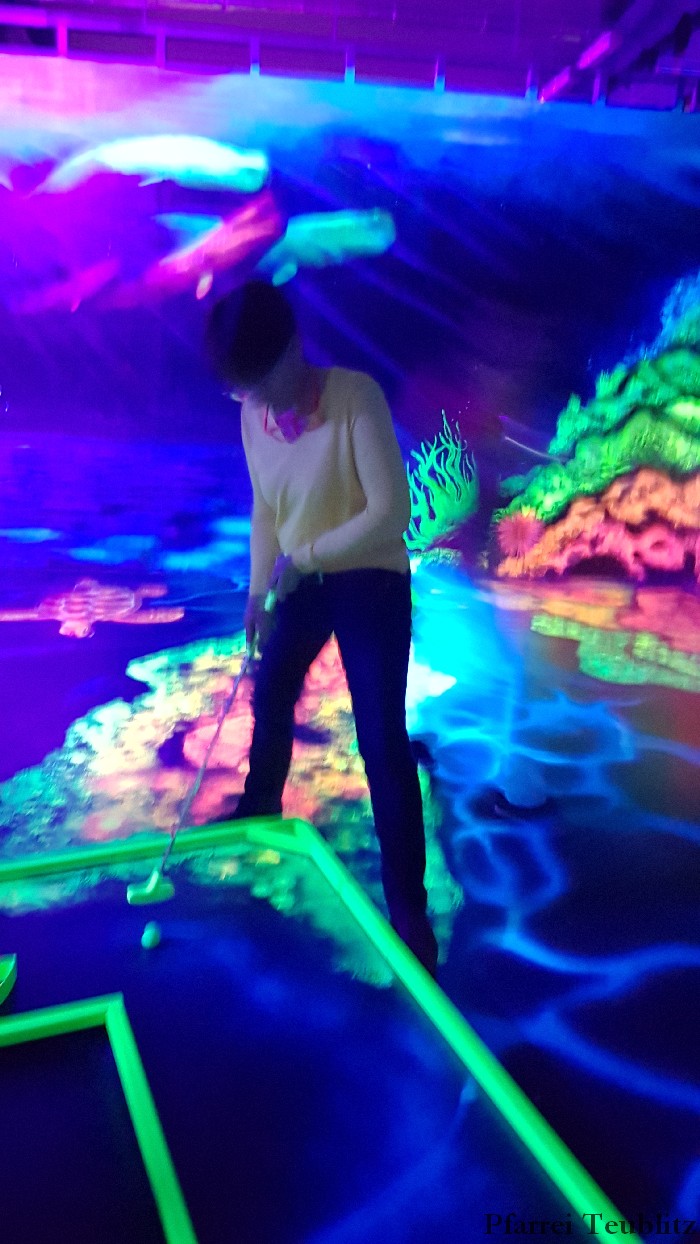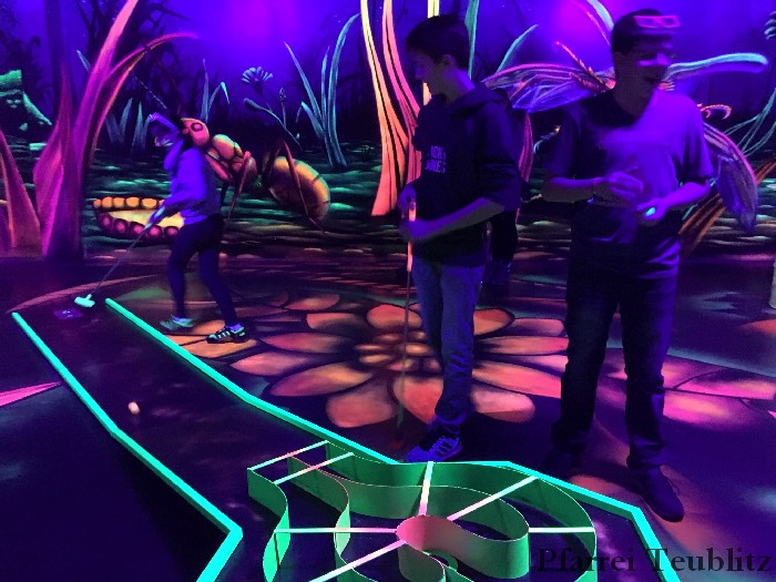 Zwei Wochen später waren dann fast alle mit dabei, als es zum 3D-Minigolf ging. Gleich mit vier, teilweise sehr großen Gruppen ging man an den Start. Damit die Spieler beim mystischen Schwarzlicht in der Halle noch „stylischer“ rüber kommen, wurde vorher noch mit greller Farbe geschminkt. Mit Golfbällen, Schlägern und 3D-Brillen ausgestattet spielten die Teams sich durch die 18 Minigolfbahnen. Dabei wurden viele fantastische Themenwelten „erforscht“, wie z. B. der Weltraum, der Dschungel oder die Tiefsee.