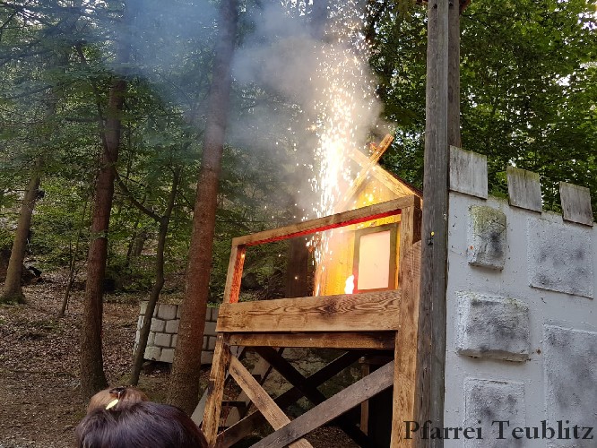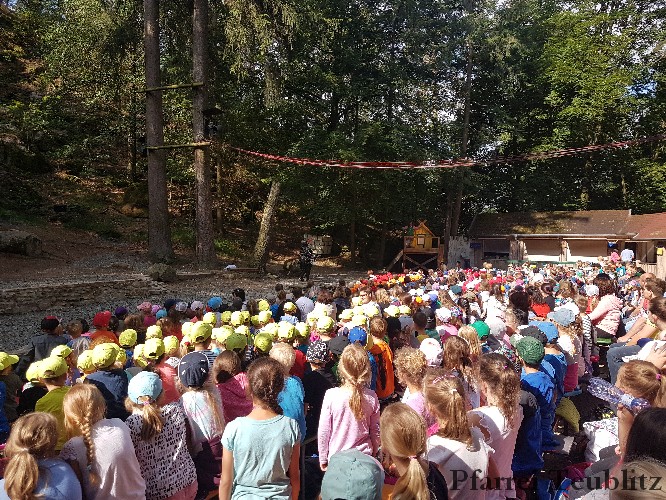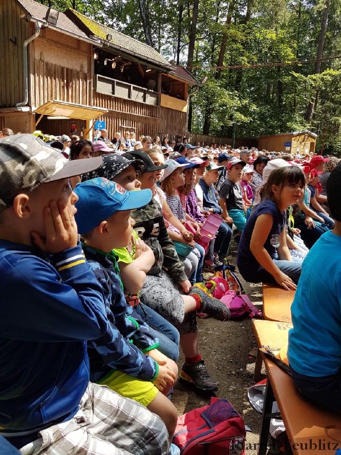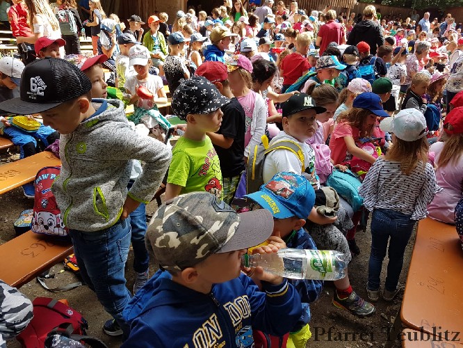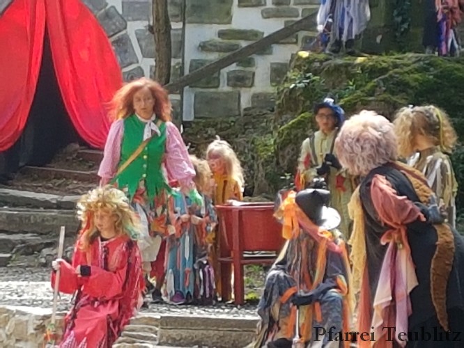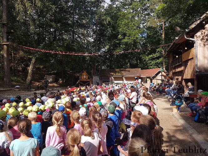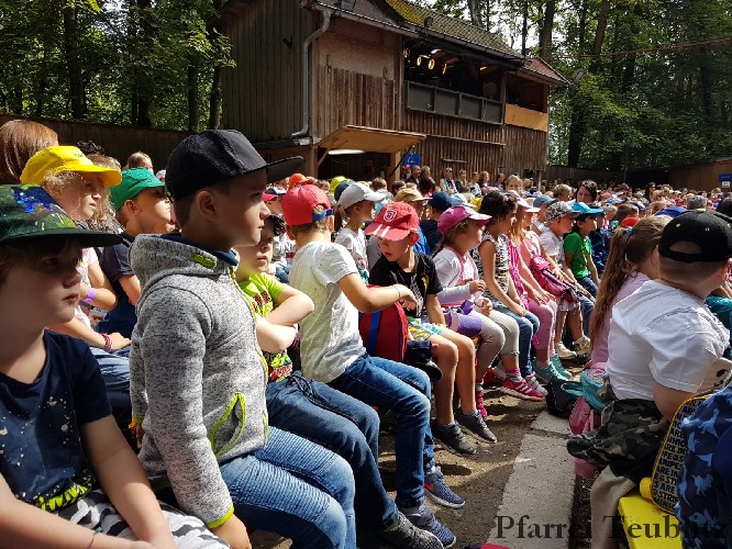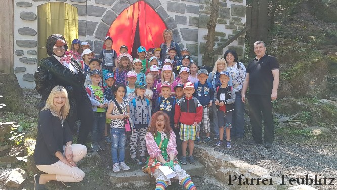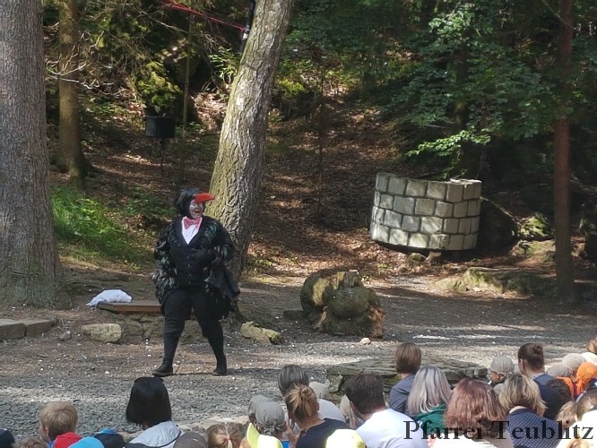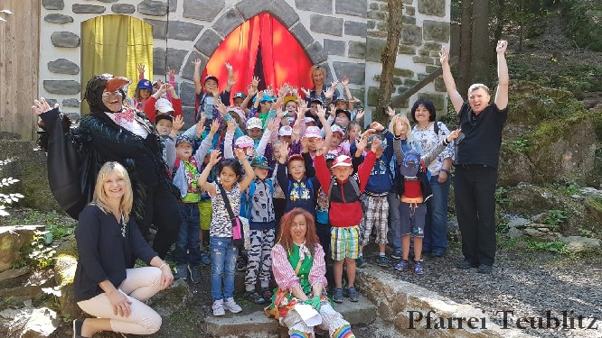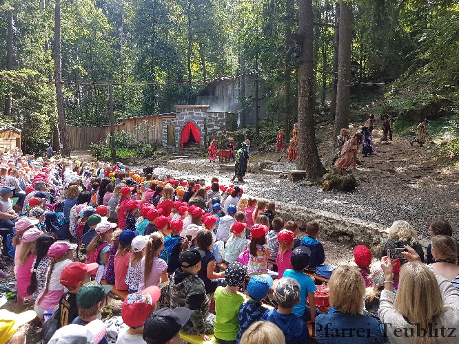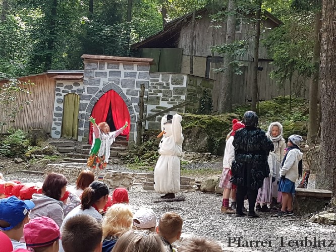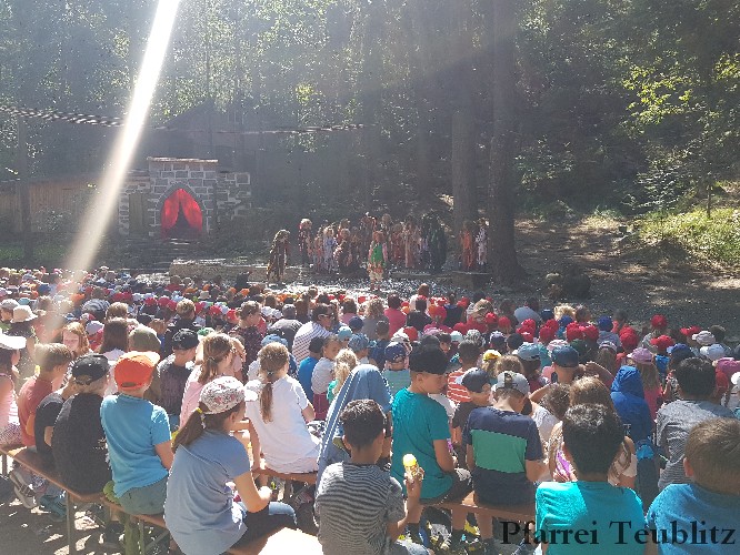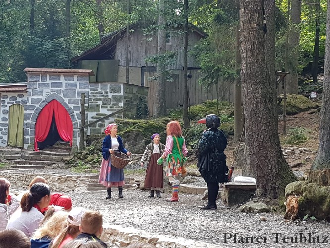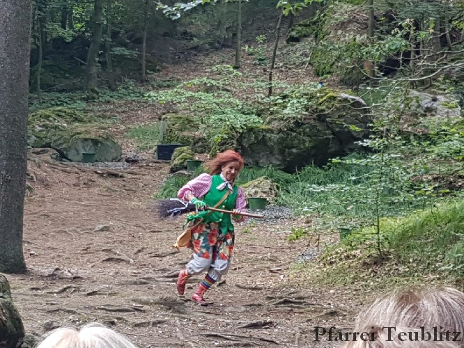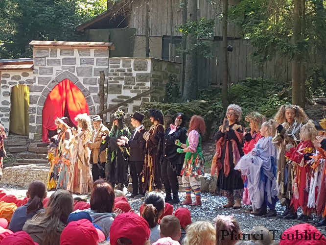 Die 33 Vorschulkinder des Kindergartens Herz Jesu Teublitz fuhren am 16. Juli 2019 zur Waldbühne in Fuhrt im Wald und sahen das Theaterstück „die kleine Hexe“. Das gleichnamige Kinderbuch von Otfried Preußler aus dem Jahr 1957 lieferte die Vorlage zu dieser Aufführung.