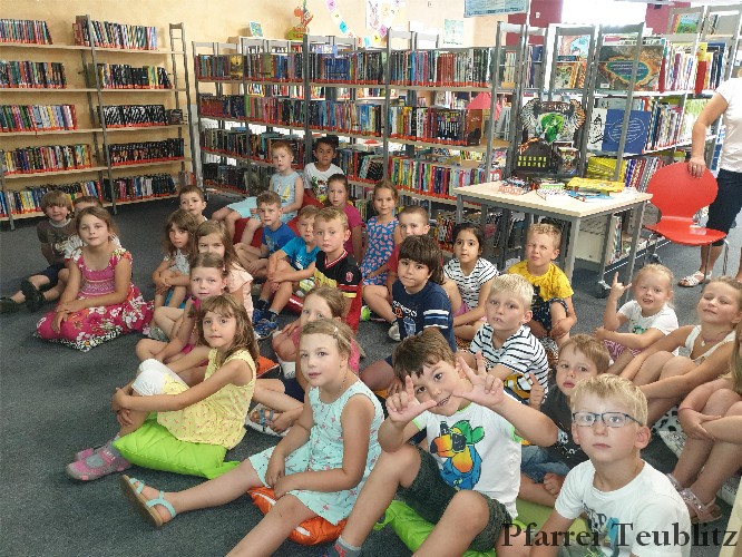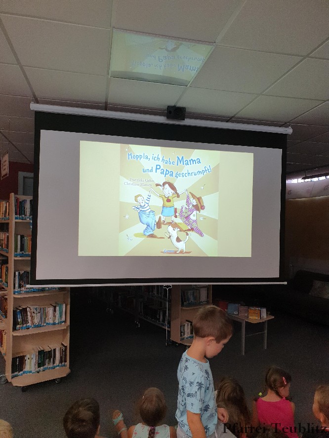 Ende Juli besuchten die Vorschulkinder des Kindergartens Herz-Jesu mit Ihren Erzieherinnen Iris Gansler und Andrea Ziechaus die Bücherei in Teublitz. Frau Emmert und Frau Pielmeier begrüßten im Namen der Stadtbücherei Teublitz die jungen Gäste zusammen mit Ihren Gruppenleiterinnen. Ein Highlight für die Kinder war das Kinderbuchkino „Hoppla, ich habe Mama und Papa geschrumpft.“ Die Kinder hatten dabei viel Spaß und anschließend genügend Zeit verschiedene Spiele auszuprobieren und in den Büchern zu stöbern.