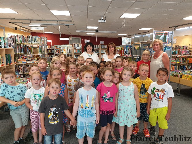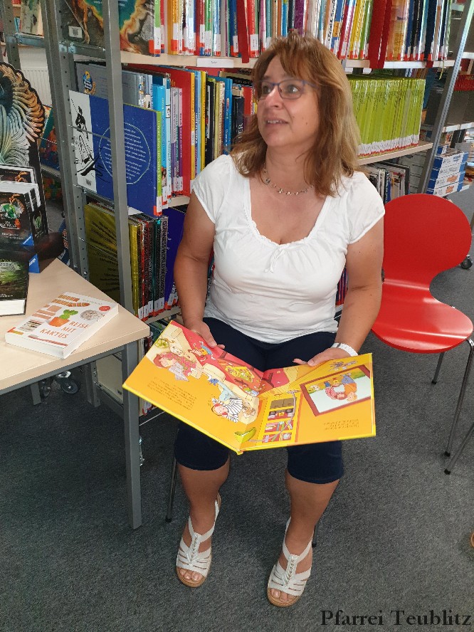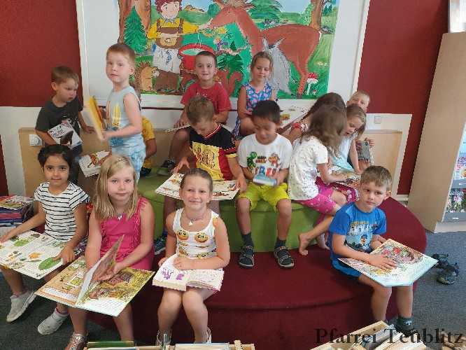 Vorlesen bzw. „die Vorbereitung auf das Lesen“ ist im katholischen Kinderhaus Herz Jesu ein wichtiger Bestandteil der pädagogischen Arbeit. „Vorlesen ist in unserem Kindergarten-Alltag sehr wichtig und die Grundlage für eine gute Lesekompetenz. Es wird der Wortschatz erweitert und die Konzentrationsfähigkeit gesteigert, das Vorstellungsvermögen erhöht und die Kreativität gefördert. Durch Geschichten lernen Kinder außerdem sich in andere Menschen hineinzuversetzen. Neben der Förderung der sozialen und emotionalen Kompetenzen werden die kognitiven Fähigkeiten gestärkt. Die Phantasie der Kinder wird mit Hilfe der Geschichte aktiviert“, erklärte Andrea Ziechaus das pädagogische Konzept, das nicht nur hinter dem Besuch in der Teublitzer Bücherei steckt. Ziel ist es die Neugier der Kinder auf das Lesen zu wecken. Denn voll Neugier und Begeisterung sollen die Kinder ab Herbst in die Schule gehen, um dort Lesen und Schreiben zu erlernen. So bietet das katholische Kinderhaus Herz Jesu Teublitz die optimale Vorbereitung der Kinder auf „den Ernst des Lebens“.