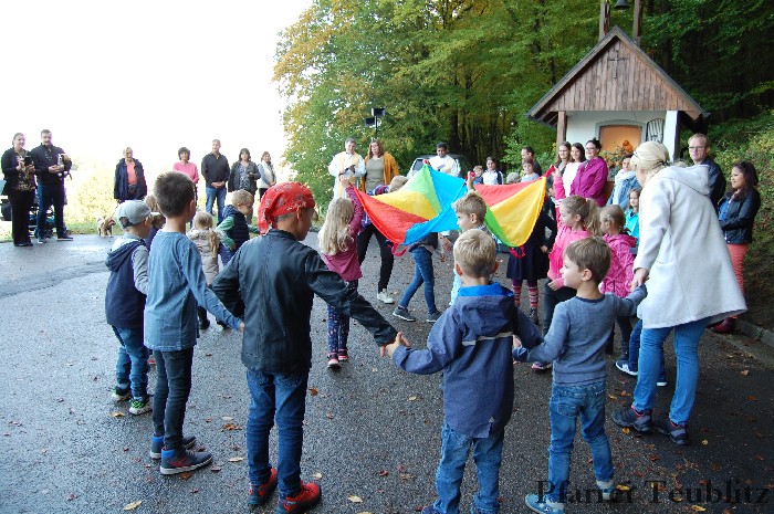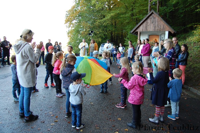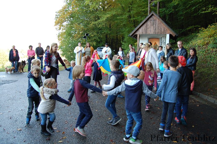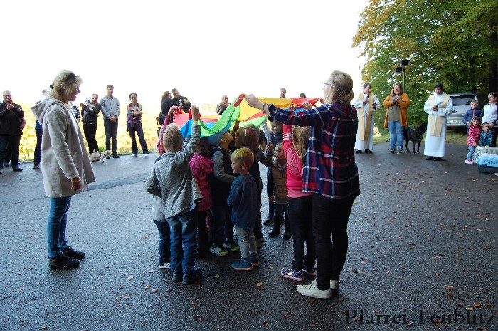 In einem weiten Kreis hatten sich vor der Franziskuskapelle die Mensch und Tier versammelt. In den Kyrie-Rufen wurde Gott für die wunderbare Schöpfung gepriesen. Zum Lobpreis tanzen die Kindergartenkinder zum Sonnengesang, den der Franz von Assisi gedichtet hat.