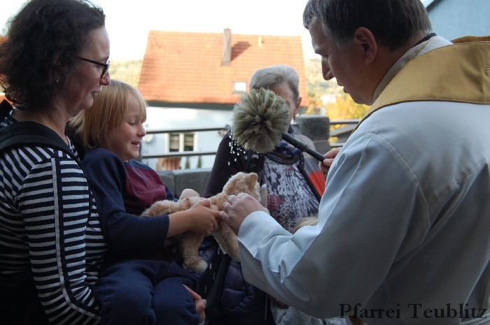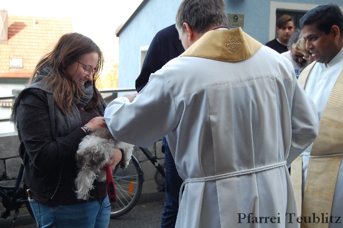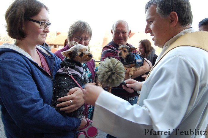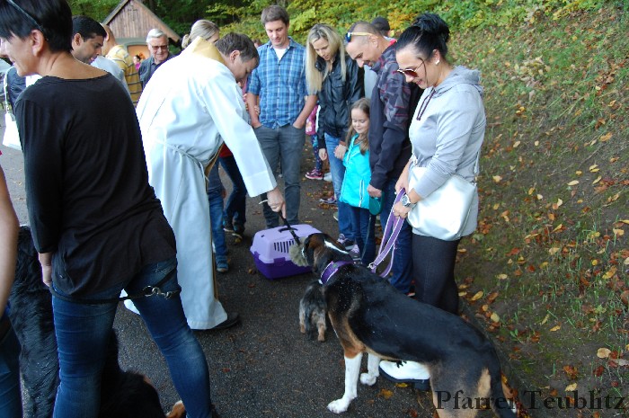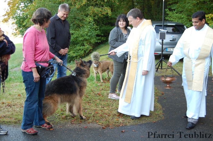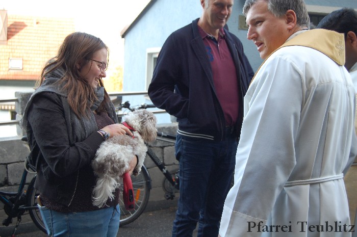Höhepunkt der Feier war jedoch der Tiersegen. Pfarrer Hirmer und Pfarrvikar P. John gingen zu jedem Tier und segneten es mit Weihwasser und Segensgestus.