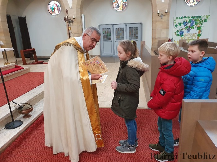 Anfang Februar wurde den Kommunionkindern während des Sonntagsgottesdienstes das Vaterunser überreicht. Für den erkrankten Pfarrer Michael Hirmer übergab Diakon Heinrich Neumüller einen besonders gestalteten Papierbogen, auf dem das Vaterunser in vielen Sprachen zu lesen war.