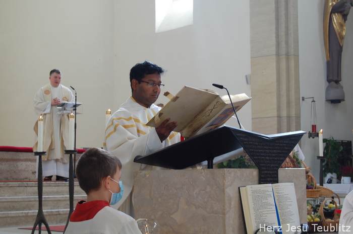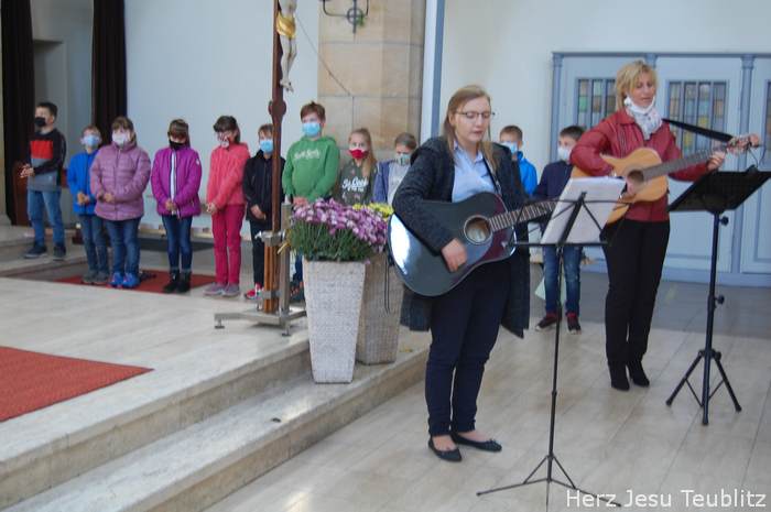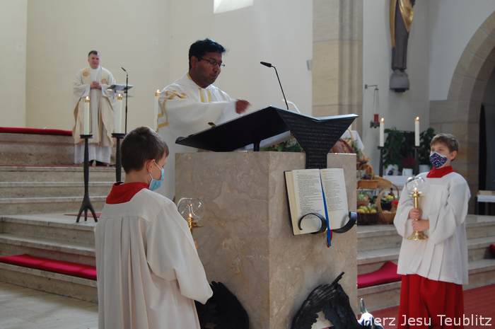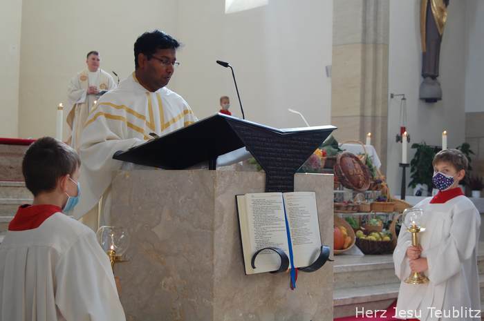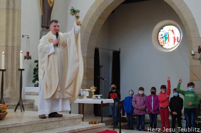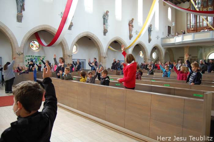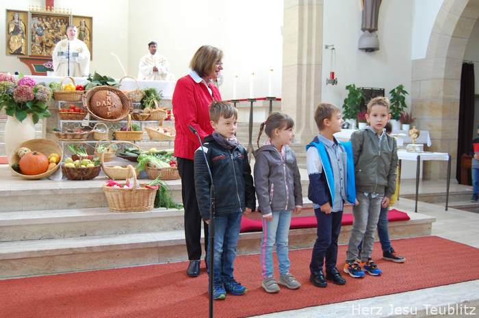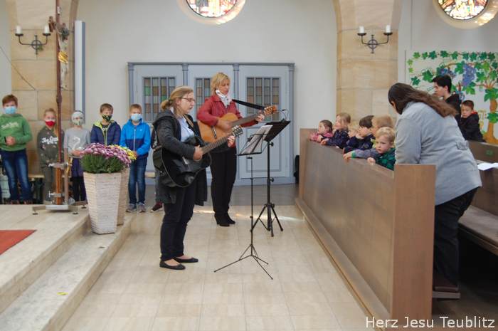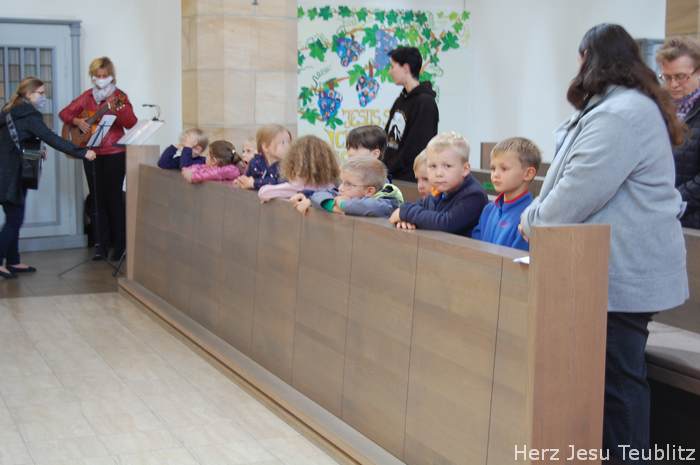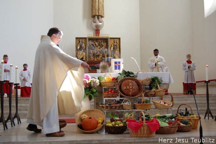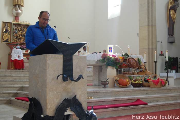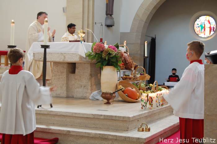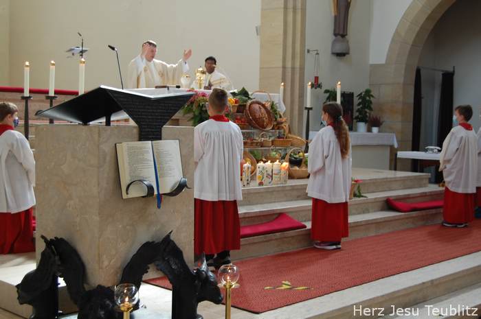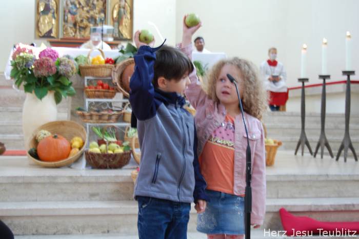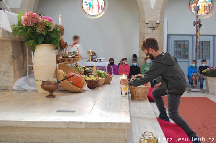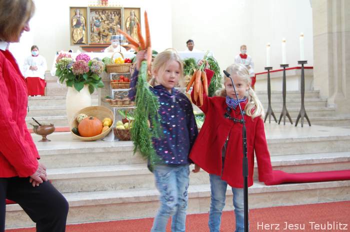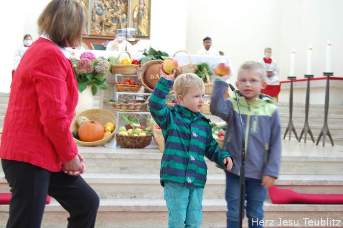 Den Familiengottesdienst am Erntedanksonntag gestalten traditionell die Kinder des katholischen Kinderhauses Herz Jesu. Im Jahr 2020 war dies jedoch nicht so einfach, weil auch hier die besonderen Vorgaben zum Schutz gegen den Corona-Virus galten. Dennoch waren die getrennt sitzenden Kinder voll Begeisterung mit dabei, als zu Beginn des Gottesdienstes Pfarrer Michael Hirmer frage, was man für Obst und Gemüse man am Erntedankaltar finden konnte.