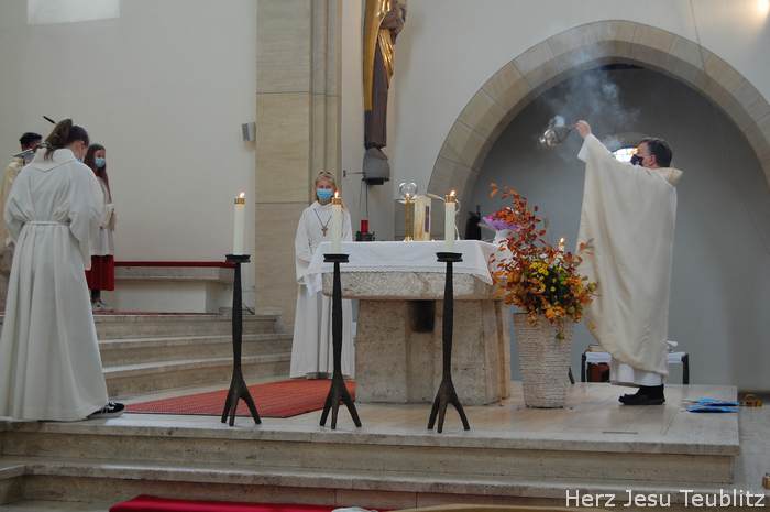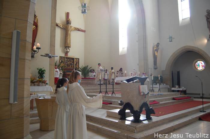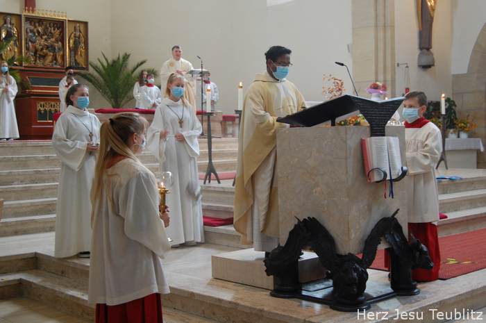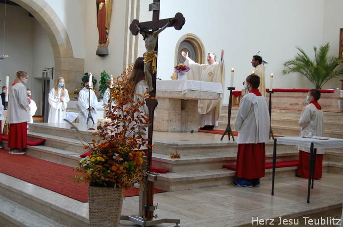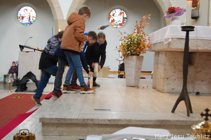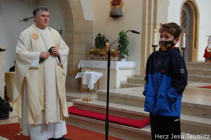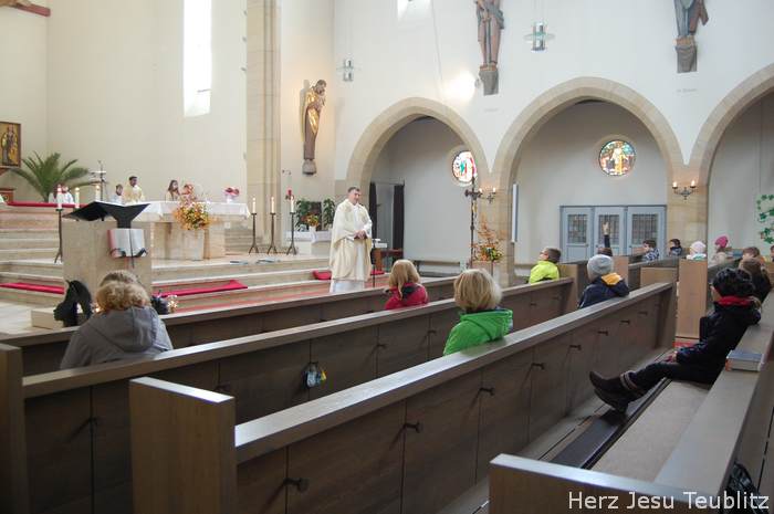 Mit dem Lied „Zum Geburtstag viel Glück“, eröffnete der Pfarrer den Gottesdienst, „Denn genau heute vor 90 Jahren ist unsere Kirche durch den Bischof geweiht worden. Die hat also heute praktisch als Gotteshaus Geburtstag.“ In seiner Predigt erinnerte der Geistliche, dass die „Lebendigen Steine“ in der Kirche viel wichtiger sind, als Gebäude aus Stein oder Beton. „Auch ihr, liebe Kommunionkinder, sind Teil der Kirche. Auch ihr seid lebendige Steine.“