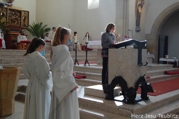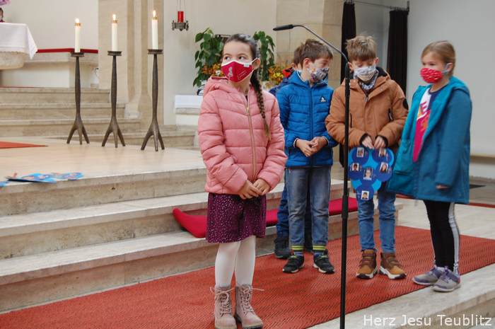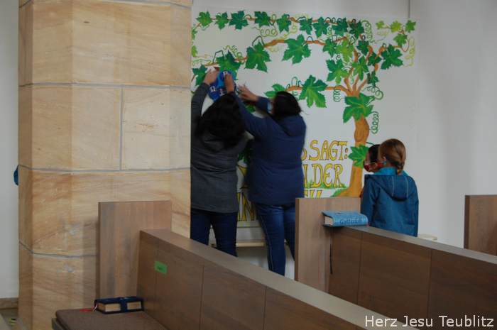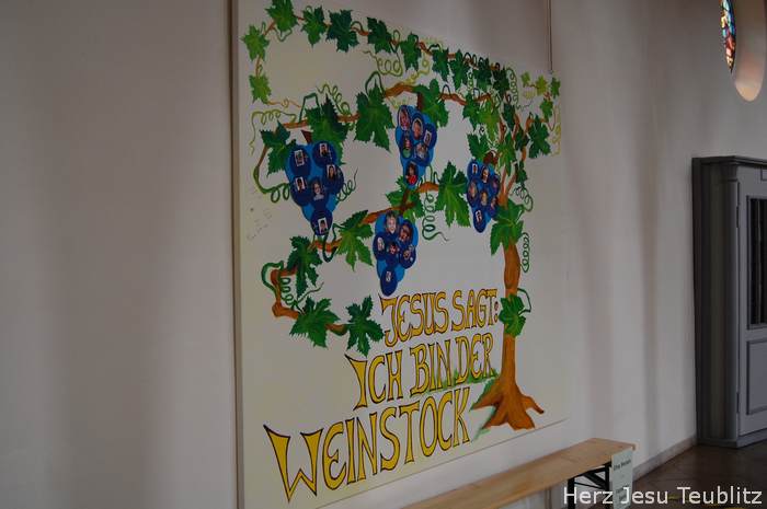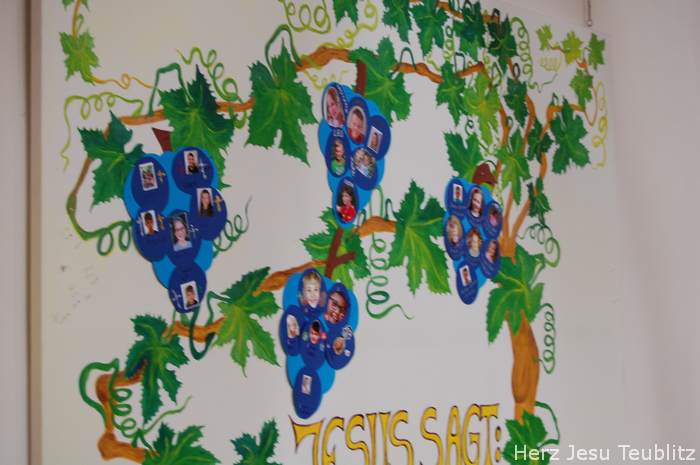 Am Ende der Predigt stellten sich die Kommunionkinder vor, sagten ihren Namen und welches Hobby sie haben. Als Zeichen dafür, dass die sie zu Christus gehören, haben die Kinder in den Tischgruppenstunden eine Weintraube gestaltet. Als Trauben sind dort die Fotos der Kinder zu sehen. Die Weintrauben wurde an einem großem Plakat mit Jesus-Zitat mit Jesus-Zitat angebracht: „Ich bin der Weinstock, ihr seid die Reben.“