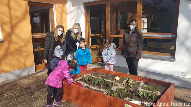 In ökumenischer Verbundenheit gestalteten die Kindergärtnerinnen einen spirituellen Pflanzgarten mit den Kindern. Die ganze Fastenzeit hindurch wurden das Hochbeet von den Kinder bepflanz und gestaltet. Im scheinbar leblosen Beet wuchsen über die Wochen blühende Pflanzen. „Die Kinder können sinnlich begreifen, dass nach dem Tod das Leben wartet.“, erzählt Kindergärtnerin Monika Böhm.