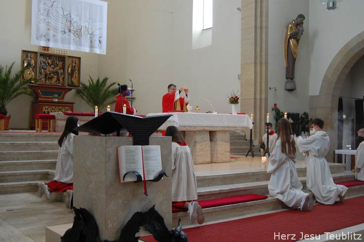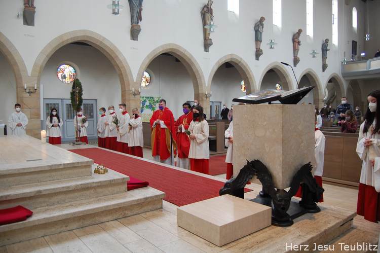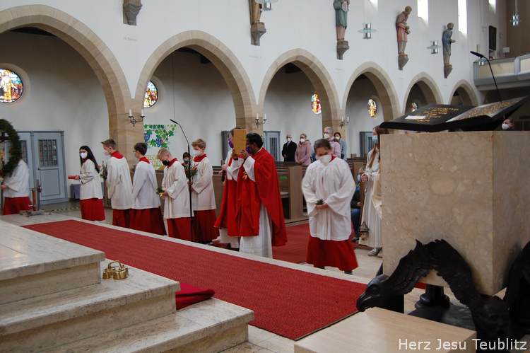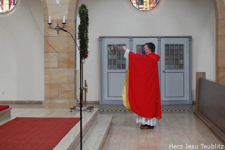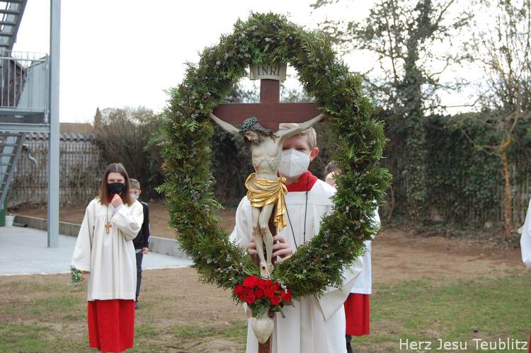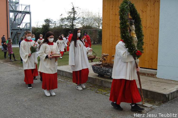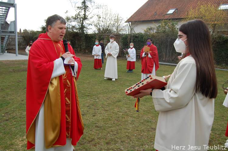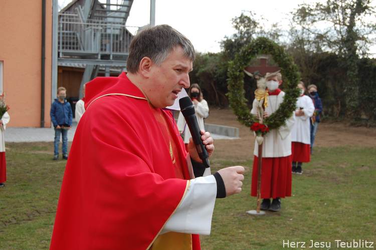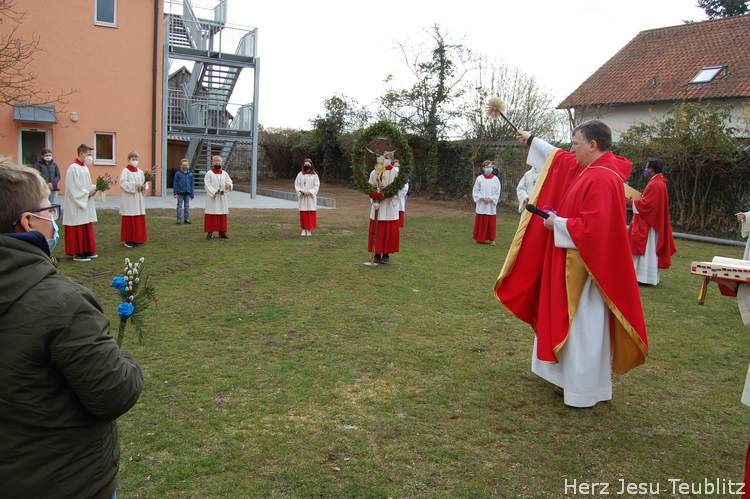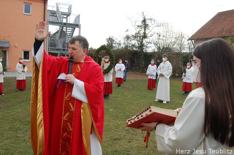Feierlich wurde in Teublitz die Heilige Woche, die Karwoche, eröffnet. Bei den Gottesdiensten am Palmsonntag wurden Palmbuschen gesegnet und das Evangelium vom Einzug Jesu in Jerusalem verkündet. Dafür versammelten sich die liturgischen Dienste im Pfarrgarten, um genügend Abstand halten zu können.