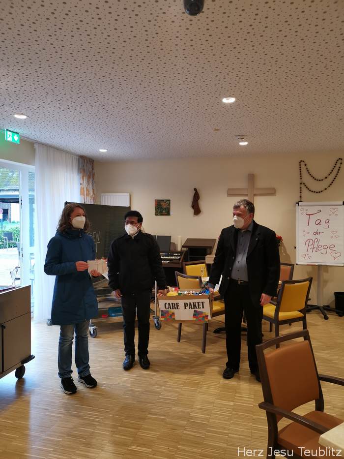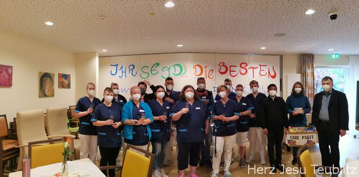 Der 12. Mai ist ein besonderer Tag. Zumindest für alle jene, die in pflegenden Berufen arbeiten. Denn am 12. Mai wird der internationale „Tag der Pflege“ begangen. Die nahmen die Geistlichen von Teublitz zum Anlass, sich bei den Pflegekräften zu bedankten. Pfarrerin Hanna Stahl und ihre katholischen Kollegen Pfarrer Michael Hirmer und Kaplan William Akkala überreichten im Seniorenheim Dankeskarten und ein ganz besonderes Paket.