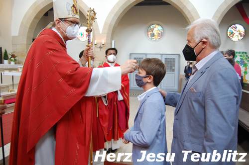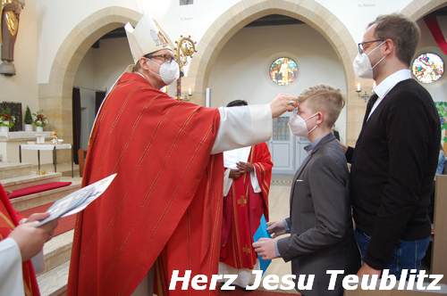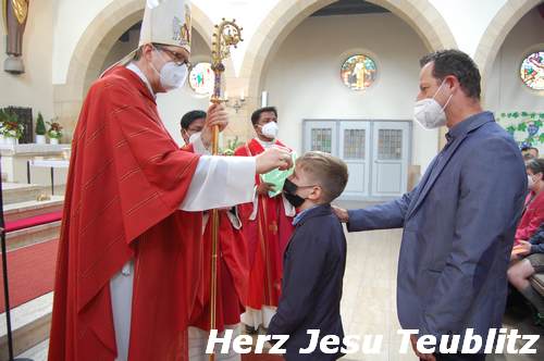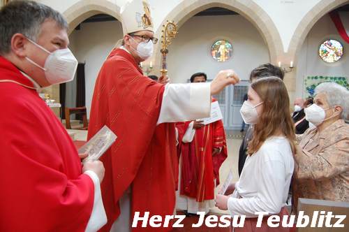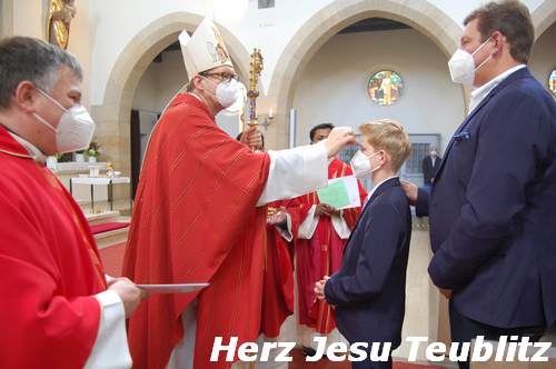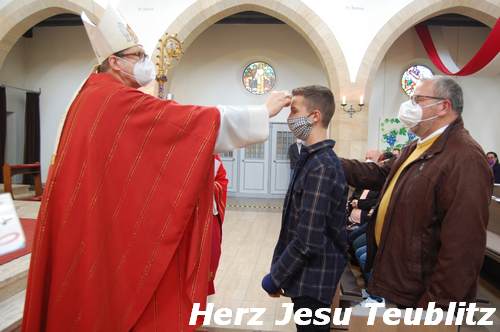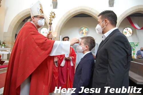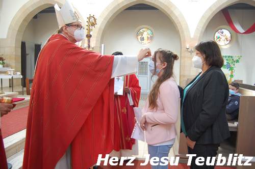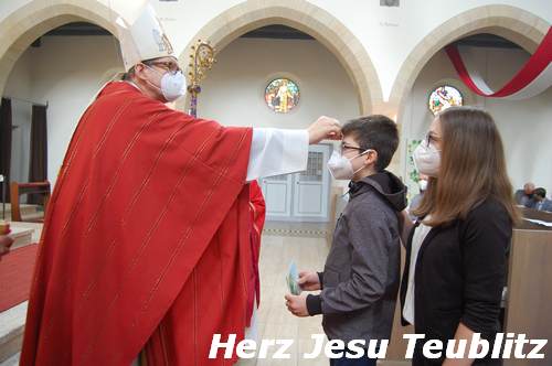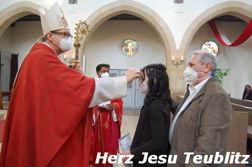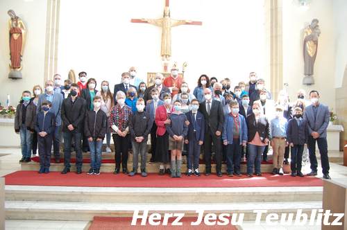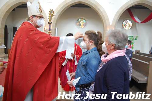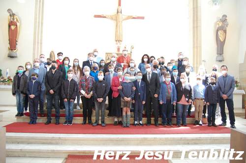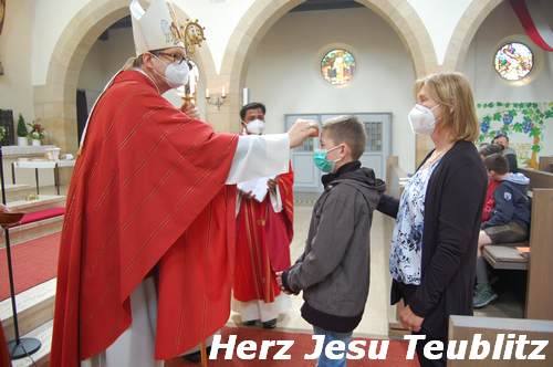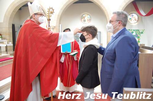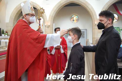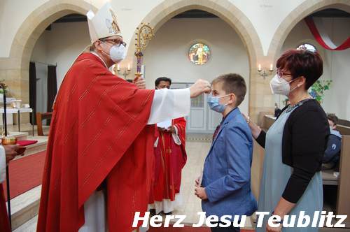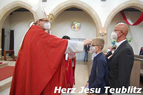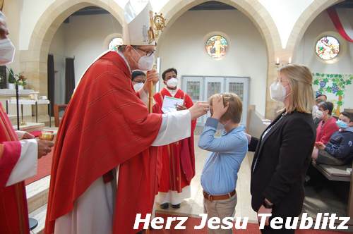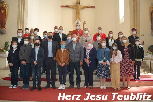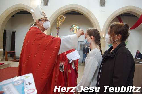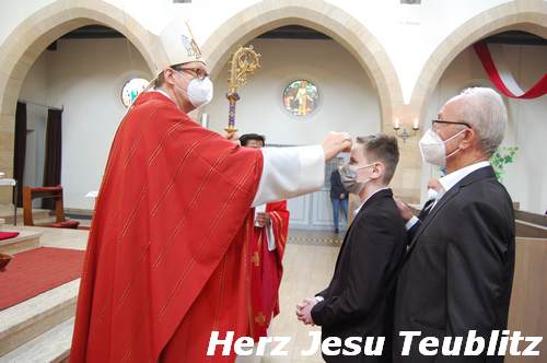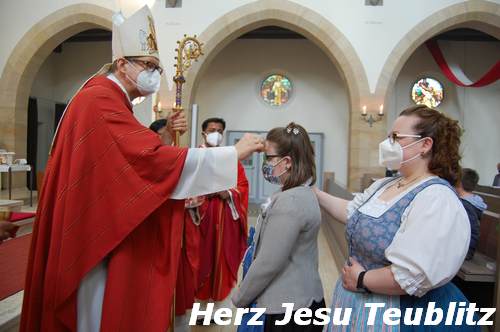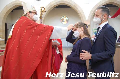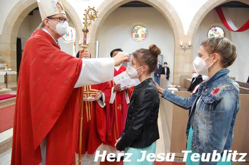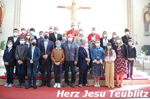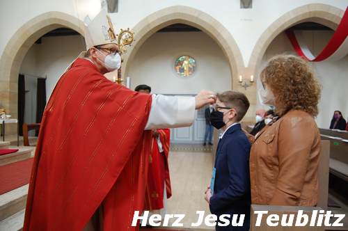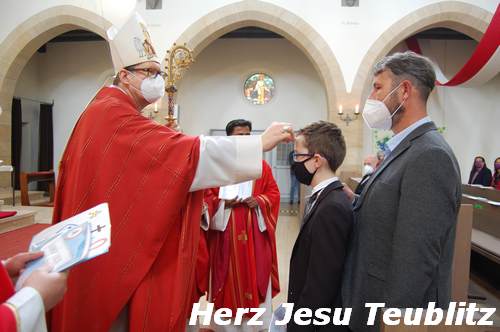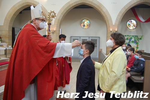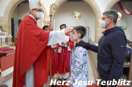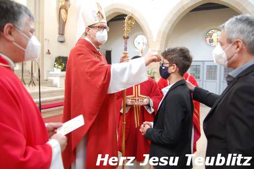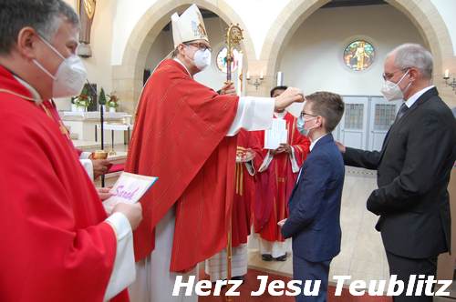 Im Auftrag des Regensburger Bischofs Dr. Rudolf Voderholzer spendete vergangenen Montagvormittag Weihbischof Dr. Josef Graf 43 Jugendlichen aus der Pfarreiengemeinschaft Katzdorf-Premberg und 28 Jugendlichen aus der Pfarrei Herz-Jesu Teublitz das Sakrament der Firmung in der Herz-Jesu-Kirche in Teublitz. Coronabedingt fanden vormittags zwei Firmgottesdienste statt. Gefeiert wurde der Firmgottesdienst durch Weihbischof Dr. Josef Graf in Konzelebration mit Pfarrer Michael Hirmer (Teublitz), Pfarrkaplan William Akkala (Teublitz), Pater Sijo (Katzdorf) und Diakon Heinrich Neumüller. In seiner Festpredigt forderte Weihbischof Graf die Firmlinge auf, den Glauben mitzunehmen auf ihren weiteren Lebensweg.