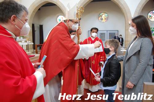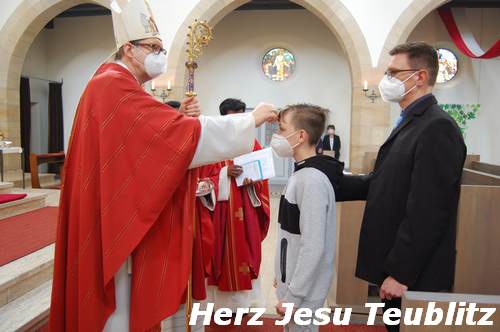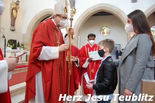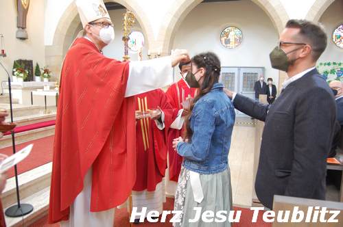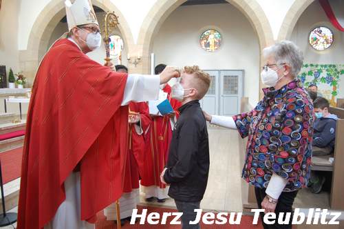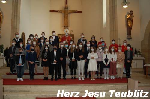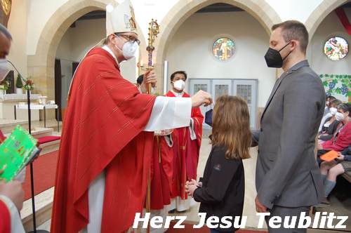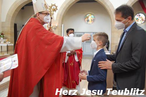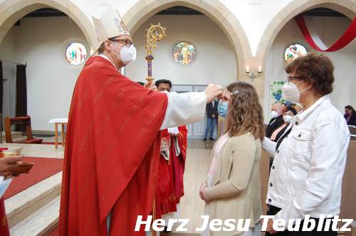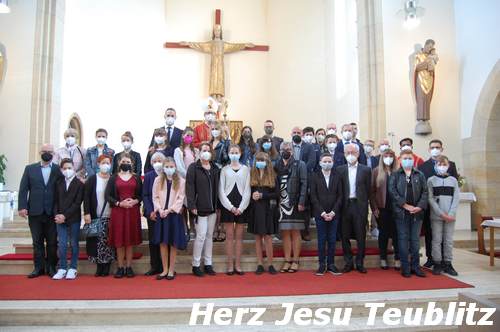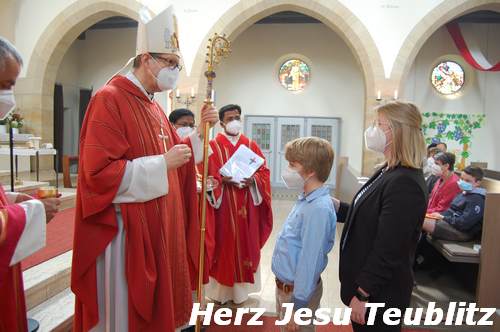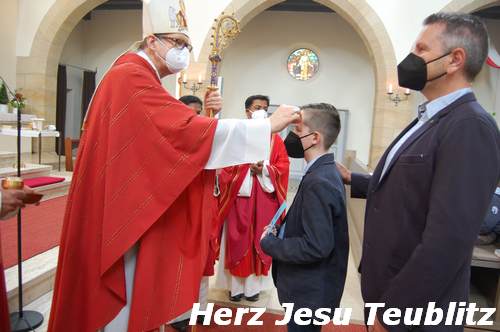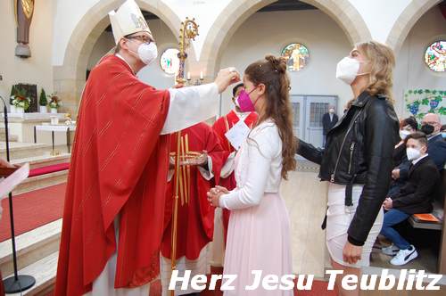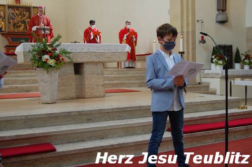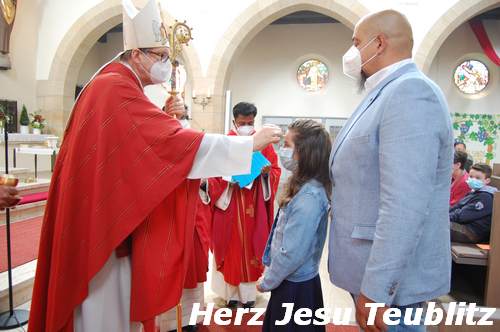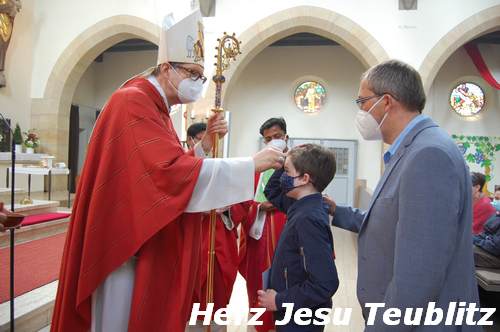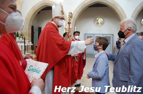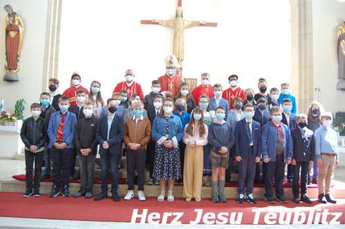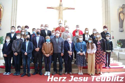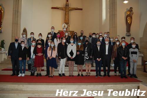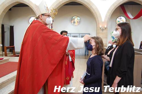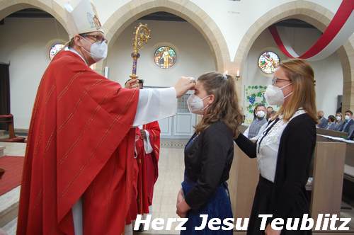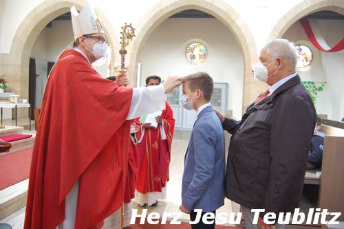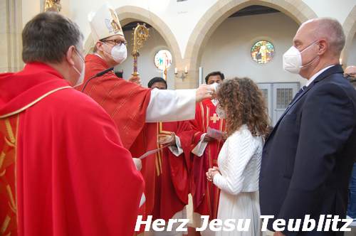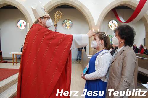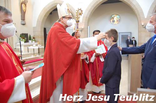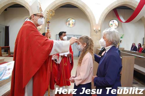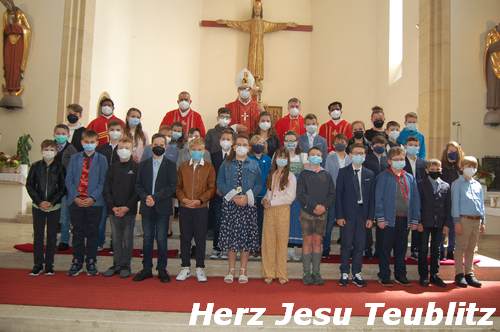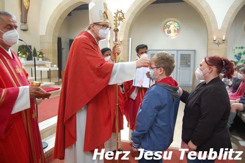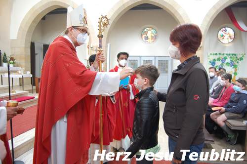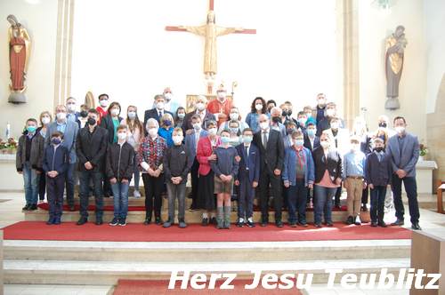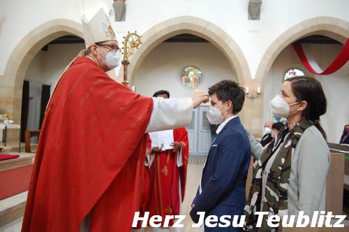 Im Auftrag des Regensburger Bischofs Dr. Rudolf Voderholzer spendete vergangenen Montagvormittag Weihbischof Dr. Josef Graf 43 Jugendlichen aus der Pfarreiengemeinschaft Katzdorf-Premberg und 28 Jugendlichen aus der Pfarrei Herz-Jesu Teublitz das Sakrament der Firmung in der Herz-Jesu-Kirche in Teublitz. Coronabedingt fanden vormittags zwei Firmgottesdienste statt. Gefeiert wurde der Firmgottesdienst durch Weihbischof Dr. Josef Graf in Konzelebration mit Pfarrer Michael Hirmer (Teublitz), Pfarrkaplan William Akkala (Teublitz), Pater Sijo (Katzdorf) und Diakon Heinrich Neumüller. In seiner Festpredigt forderte Weihbischof Graf die Firmlinge auf, den Glauben mitzunehmen auf ihren weiteren Lebensweg.