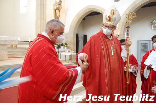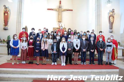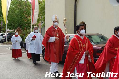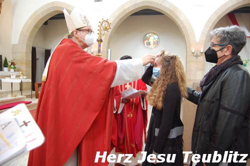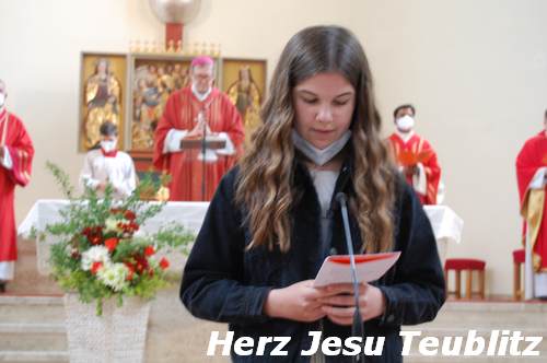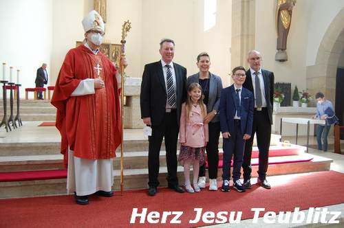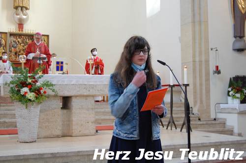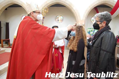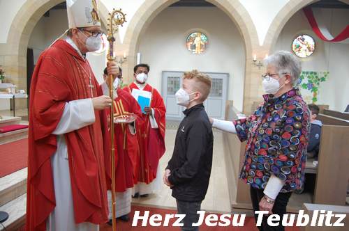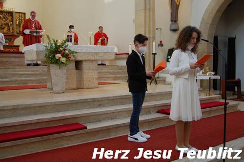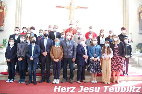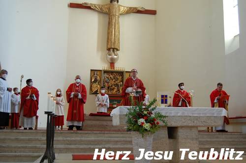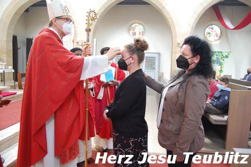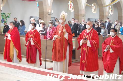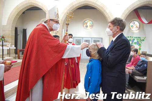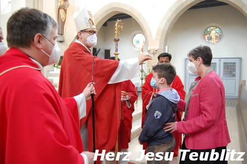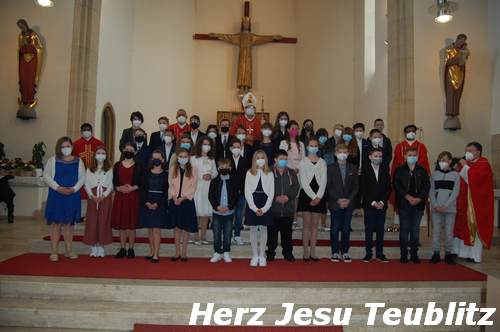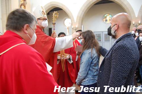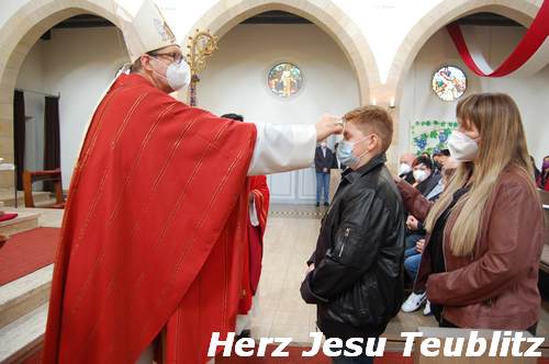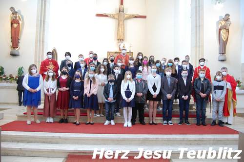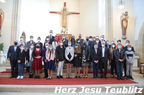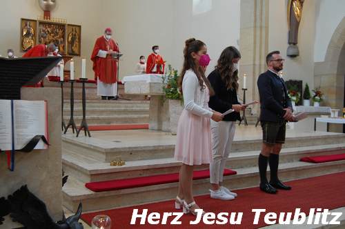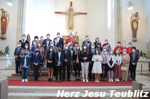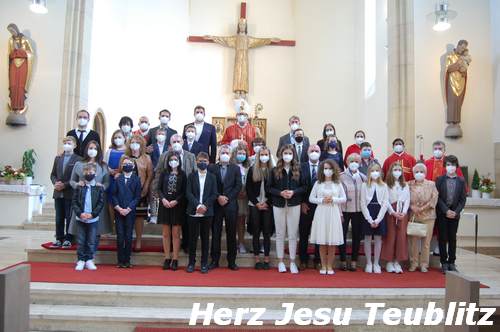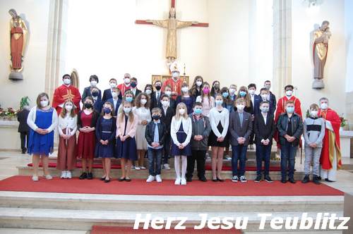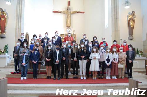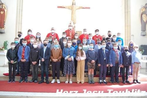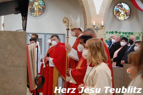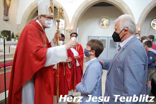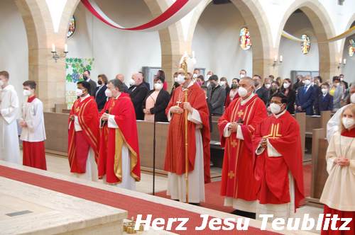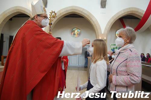Im Auftrag des Regensburger Bischofs Dr. Rudolf Voderholzer spendete vergangenen Montagvormittag Weihbischof Dr. Josef Graf 43 Jugendlichen aus der Pfarreiengemeinschaft Katzdorf-Premberg und 28 Jugendlichen aus der Pfarrei Herz-Jesu Teublitz das Sakrament der Firmung in der Herz-Jesu-Kirche in Teublitz. Coronabedingt fanden vormittags zwei Firmgottesdienste statt. Gefeiert wurde der Firmgottesdienst durch Weihbischof Dr. Josef Graf in Konzelebration mit Pfarrer Michael Hirmer (Teublitz), Pfarrkaplan William Akkala (Teublitz), Pater Sijo (Katzdorf) und Diakon Heinrich Neumüller. In seiner Festpredigt forderte Weihbischof Graf die Firmlinge auf, den Glauben mitzunehmen auf ihren weiteren Lebensweg.