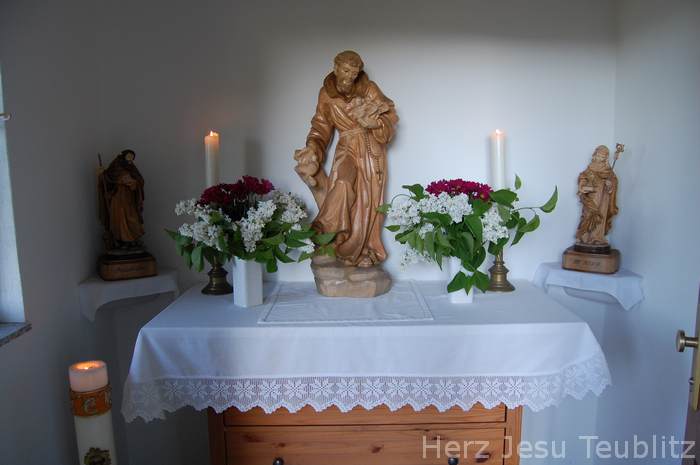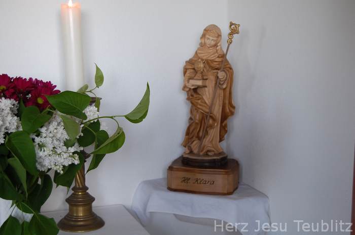 Zum Abschluss des „Marienmonats“ Mai traf sich vergangenen am Sonntagabend die Pfarrgemeinde zur letzten Maiandacht an der Franziskuskapelle am Fuße des Saltendorfer Berges. Verbunden damit war die Segnung zweier neuer Heiligenfiguren zur Verschönerung der Franziskuskapelle. Die Vorstandschaft und der Vereinsausschuss des Kapellenvereins, an der Spitze mit Lothar Ziechaus, gaben ihr Einverständnis für die Anschaffung der zwei geschnitzten Heiligenfiguren „Hl. Klara von Assisi“ und „Bruder Leo“. Schriftführerin Andrea Ziechaus schlug bereits vor einem Jahr vor, dem Hl. Franziskus zwei seiner bedeutendsten Gefährten an seine Seite in der Franziskuskapelle zu stellen. Die beiden Heiligenfiguren wurden von der Holzschnitzerin Ingeborg Hofmann aus Nittenau gefertigt, die bereits auch schon den Hl. Franziskus geschnitzt hatte.