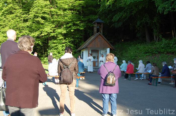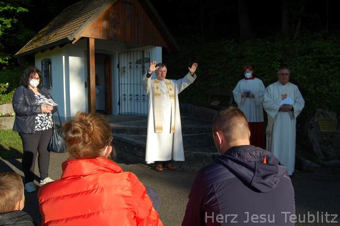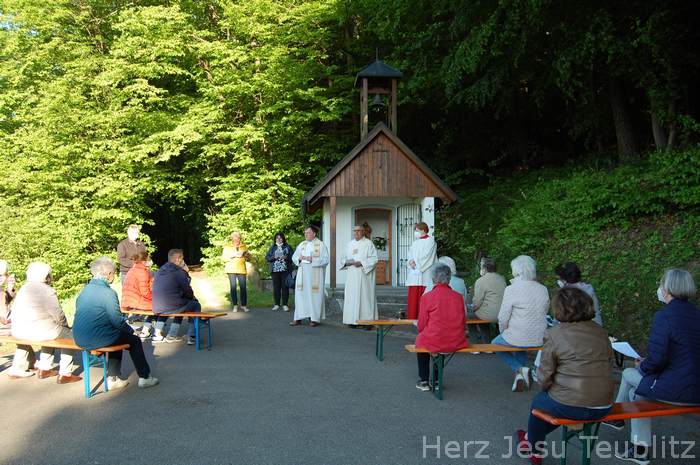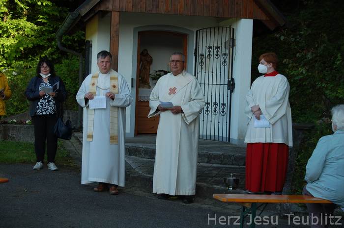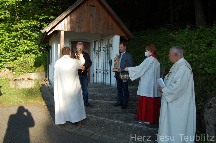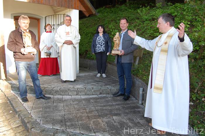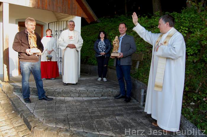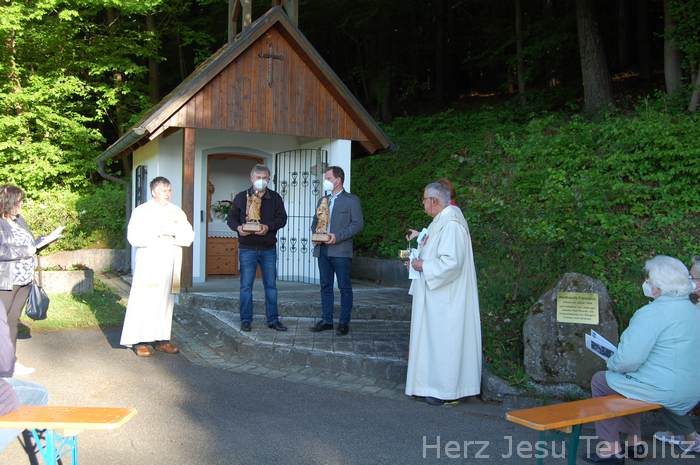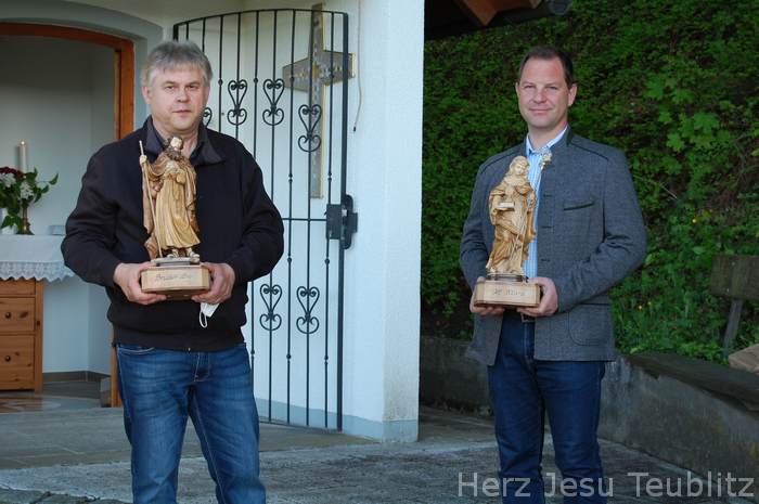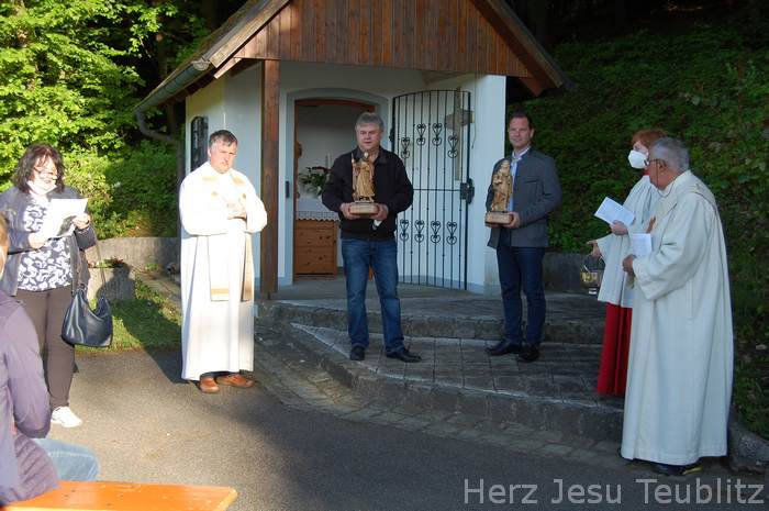 Pfarrer Michael Hirmer segnete zum Schluss der letzten Maiandacht in diesem Jahr die beiden Heiligenfiguren, die durch Kapellenvereinsvorsitzenden Lothar Ziechaus und Kirchenverwalter Matthias Obermeier getragen wurden. Pfarrer Hirmer lobte den Kapellenverein für diese hervorragende Idee, dem Hl. Franziskus zwei Weggefährten zur Seite zu stellen. Dank sagte er dem Verein für seine große Aktivität zur Erhaltung und Ausstattung der Franziskuskapelle in Saltendorf.