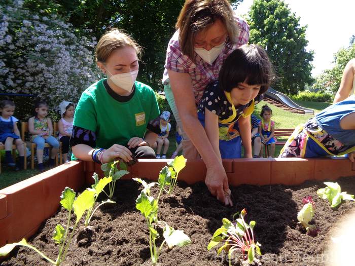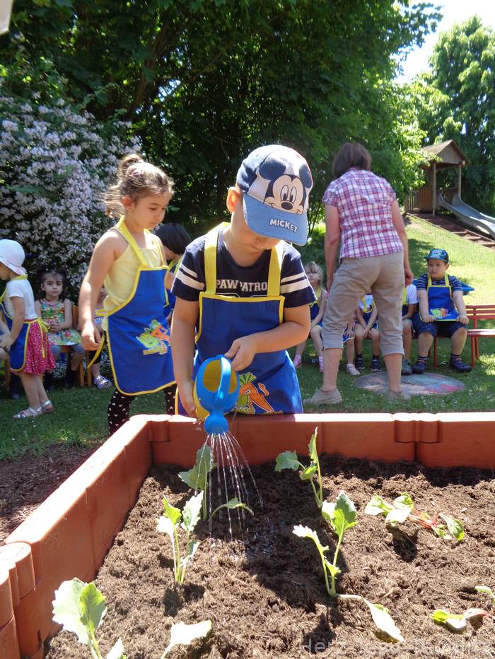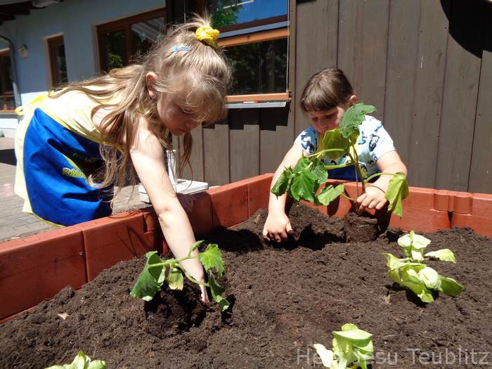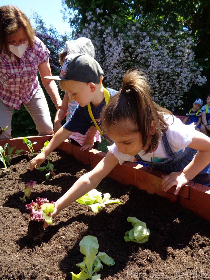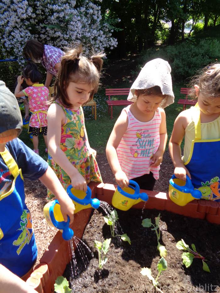 „Wir pflanzen und gießen und dann wachsen die gelben Rüben.“, erklärt eine dreijährige, während sie mit einer Gießkanne hantiert. Angeleitet durch Umweltpädagoginnen der EDEKA-Stiftung wurde jüngst sogar ein neues Hochbeet angelegt und von den Kindern bepflanzt. Dabei stellten sich die Kleinen die Frage, was es alles braucht, damit Gemüse wachsen kann. „Wasser, Erde, Sonne.“, wussten sofort die Vorschulkinder. Spielerisch wurde den Kinder gezeigt, was gute Erde ist und dass auf Steinen kein Salat wachsen kann. Das Spüren der Erde zischen den Fingern beim Einpflanzen der Schösslinge ist eine wichtige haptische Erfahrungswelt. „So schulen die Kinder ihre Sensorik und verbessern ihre Koordinationsfähigkeiten.“