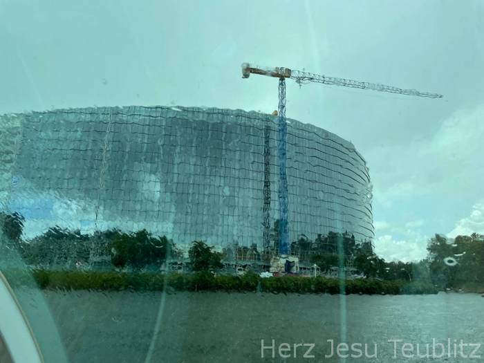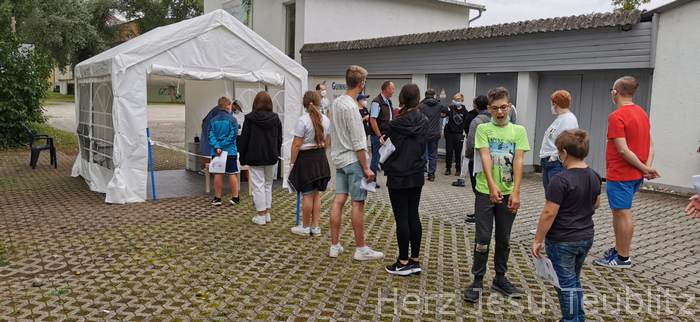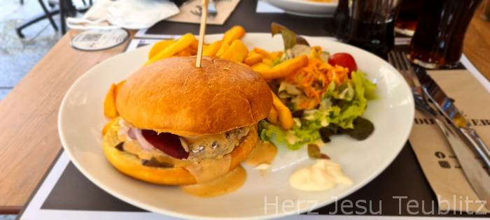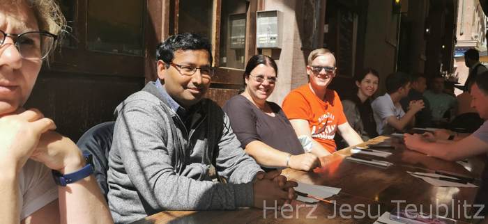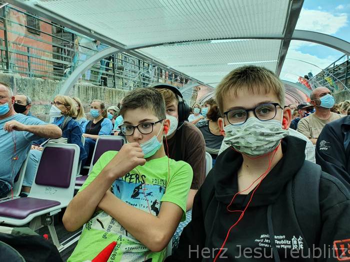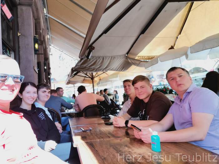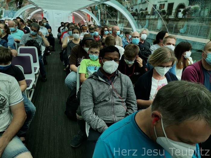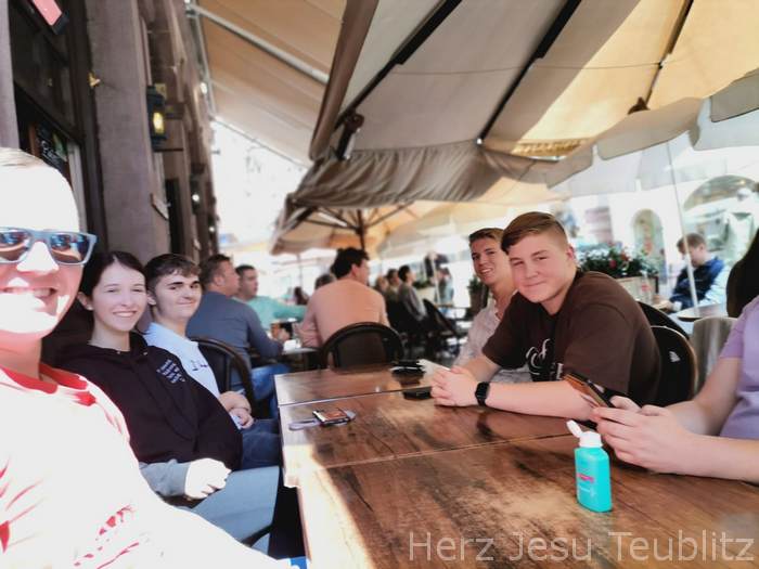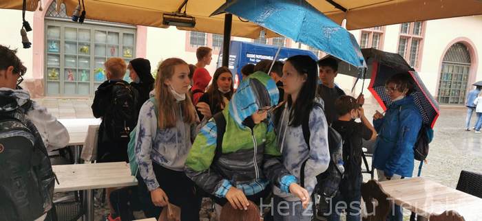 Platzregen Nr. 2 erwischte die Teublitzer Gruppe dann so richtig. Erst fand man noch Unterschlupf unter den großen Schirmen eines Restaurants – die Stimmung war super: es wurde gesungen und gelacht – doch dann zog der Pfarrer los: Durch den Regen, nass bis auf die Haut. Der Bus musste in einem bestimmten Zeitfenster erreicht werden.