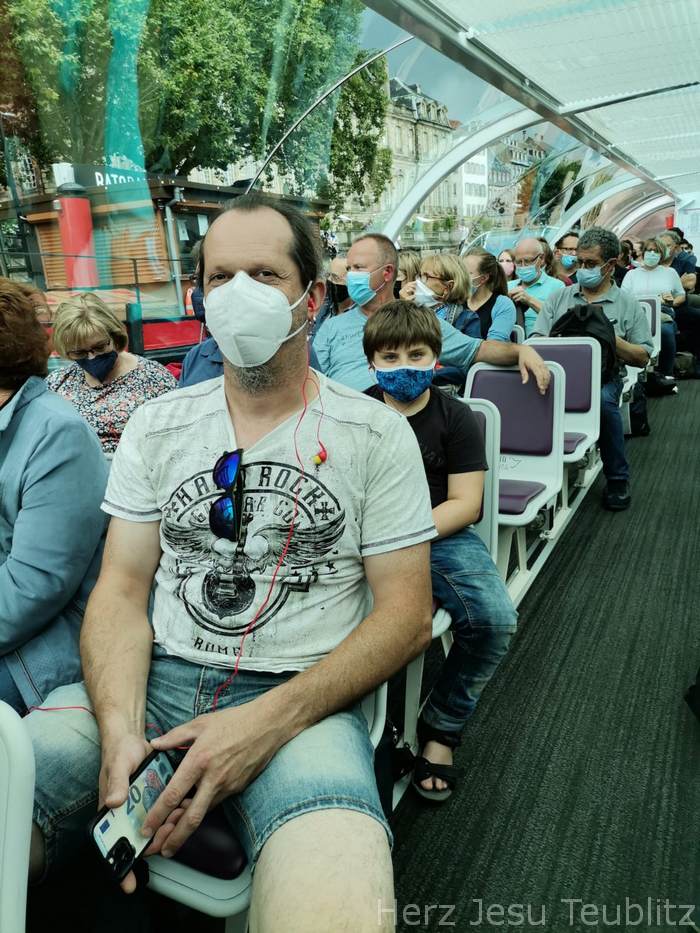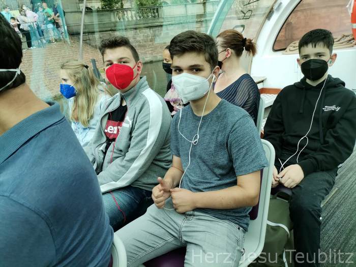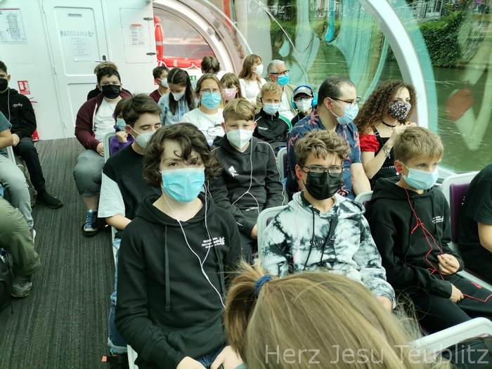 Platzregen Nr. 1 kam genau passend zur Schiffrundfahrt. Laut trommelte es auf das gewölbte Plexiglasdach des Ausflugsschiffes. Die historischen Häuser und das Parlamentsgebäude kamen dabei recht verschwommen rüber. Vom Regen völlig unbeeindruckt zeigte sich Benedikt, der den Schlaf der Gerechten schlief (oder gestern Nacht das Handy wieder nicht hat schlafen lassen). Am Ende der Schifffahrt wunderte sich Benedikt jedenfalls, warum die Straßen so nass waren. Denn just als die Teublitzer Minis anlandeten ließ der Regen nach. Trocken Fußes ging es zur Kathedrale, wo der Pfarrer deren spirituelle Bedeutung für die Menschen des Mittelalters und heute erklärte. Dann durften die Minis die Stadt selbst erkunden.