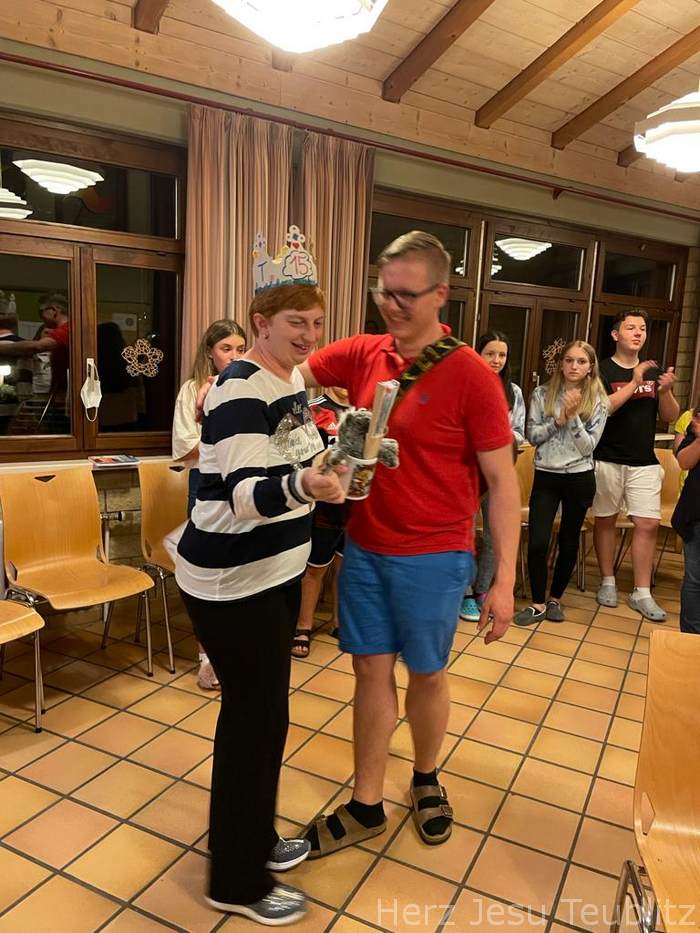 Der Tag endete bunt. Der Bunte Abend hat eine lange Tradition. Und immer mit dabei: Starmoderatorin Yvonne Mau. Genauer gesagt: zum 15. Mal. Dies musste groß gefeiert werden: Mit Krone, Lied und Urkunde. Doch vorher ließen sich die Ministranten so machen lustigen, spannenden und nervenaufreibenden Spiele und Aktionen einfallen. … es wurde gelacht und gesungen … was für ein schöner Abend …