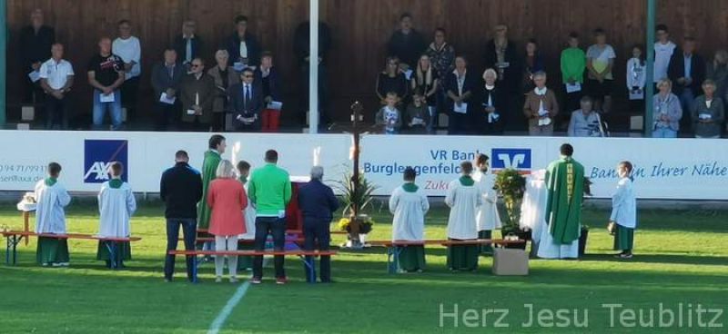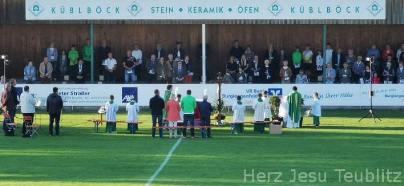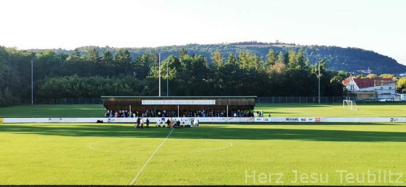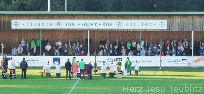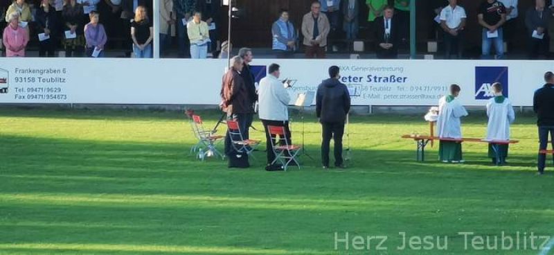 Im Rahmen der Feierlichkeiten zum 100jährigen Vereinsjubiläum des Sportclubs Teublitz feierte die Pfarrgemeinde den Sonntagsvorabendgottesdienst auf dem Fußballplatz. Pfarrer Michael Hirmer und Kaplan William Akkala standen gemeinsam der Eucharistiefeier vor. Die Lesungen und Fürbitten wurden von Mitgliedern des Sportclubs vorgetragen. Bei herrlichen Sonnenschein genossen die vielen Gläubigen, die auf der Tribüne saßen sichtlich die wunderbare Abendstimmung.