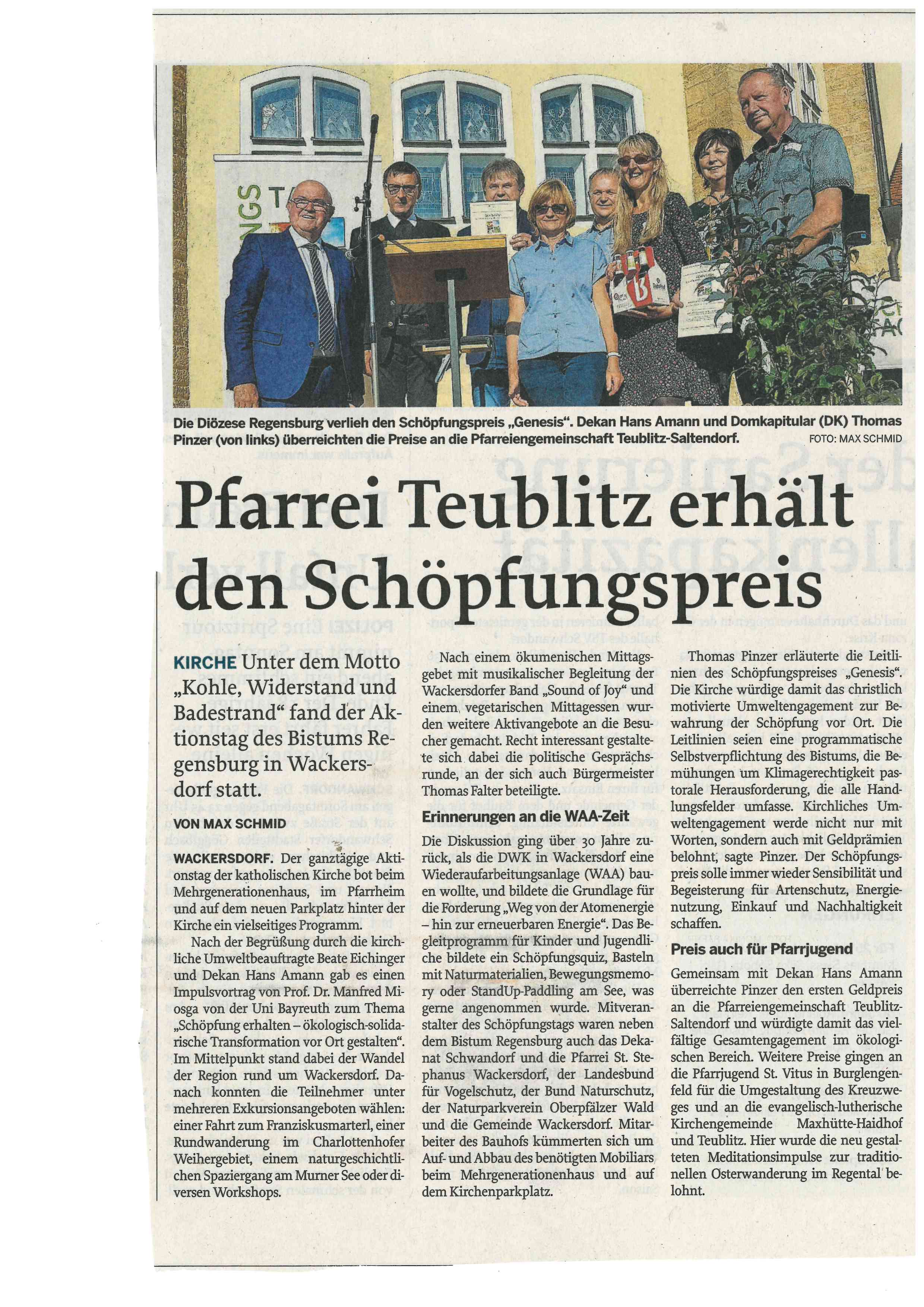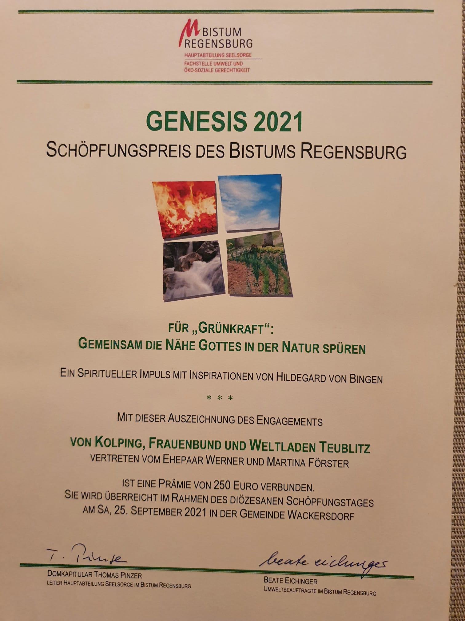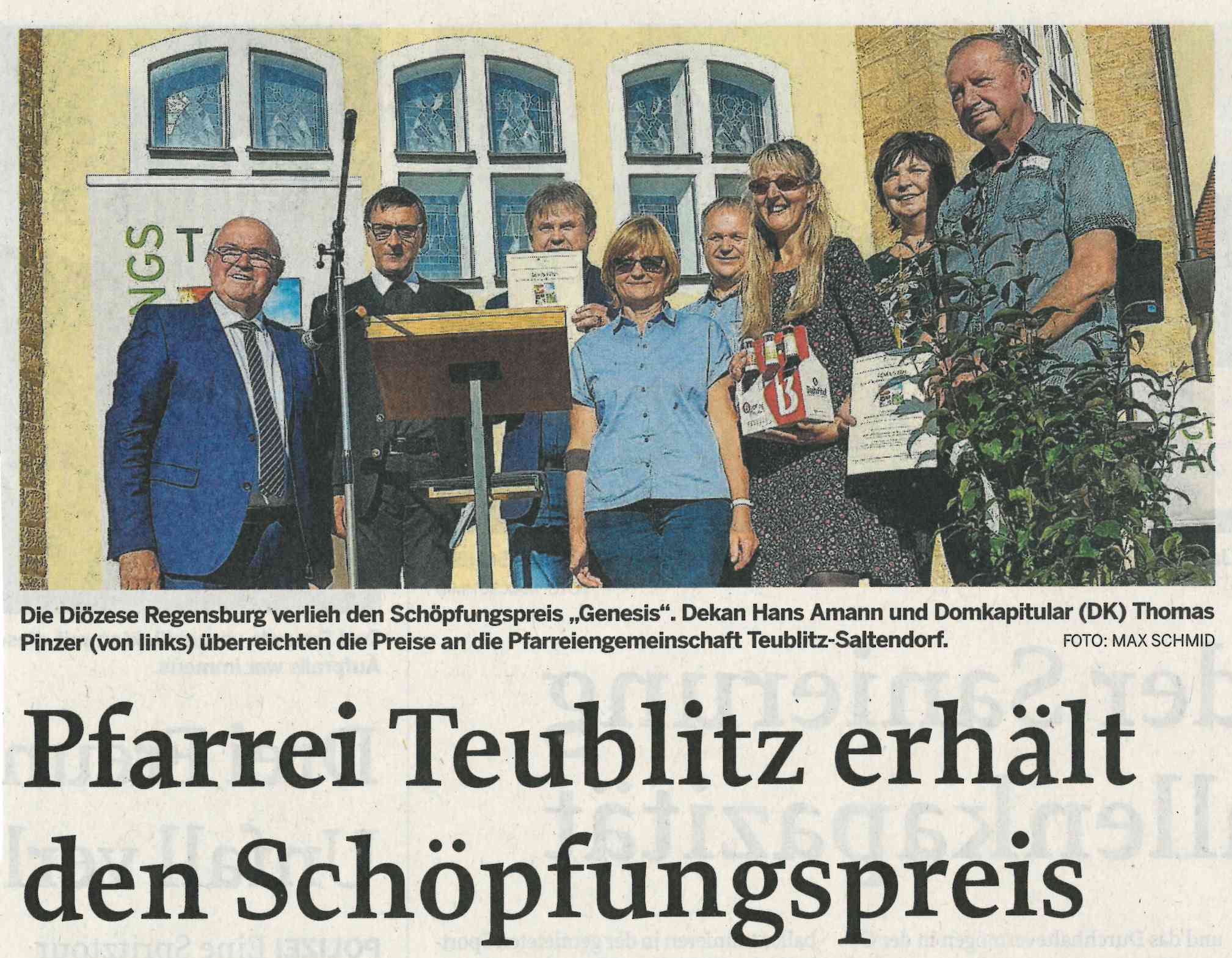 Mit sichtlich stolz geschwellter Brust nahmen die Abordnungen aus Teublitz und Saltendorf den Schöpfungspreis des Bistums Regensburg entgegen. Die Pfarrei Teublitz nahm mit zwei Projekten am Schöpfungspreis teil. Die Kirchenstiftung Saltendorf ging mit ihrem Meditationsweg ins Rennen, der die spirituelle Beziehung vom Schöpfergott inspirieren soll. Frauenbund, Kolpingsfamilie und Weltladen bewarben sich mit ihrem Hildegard-Jahresprojekt um den Schöpfungspreis des Bistums. Nach Vorbild der heiligen Hildegard von Bingen gab es hier verschiedenen Veranstaltungen, bei denen es um nachhaltige Ernährung oder die ökologische Gestaltung von Gärten ging. – siehe Berichte auf dieser Webseite – Den Preis für die Kirchenstiftung Saltendorf nahm Lothar Ziechaus (auf dem Pressefoto dritte von links) entgegen. Maria Münz, Uwe Störtebecker und das Ehepaar Martina und Werner Föster waren für den Frauenbund, die Kolpingsfamilie und dem Weltladen bei der Preisverleihung zugegen.