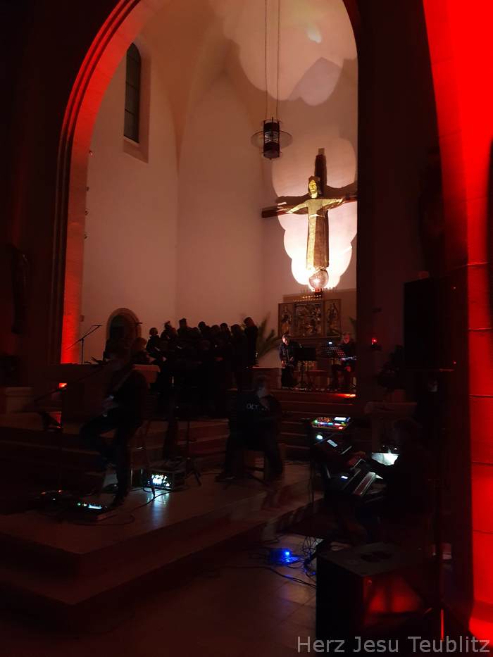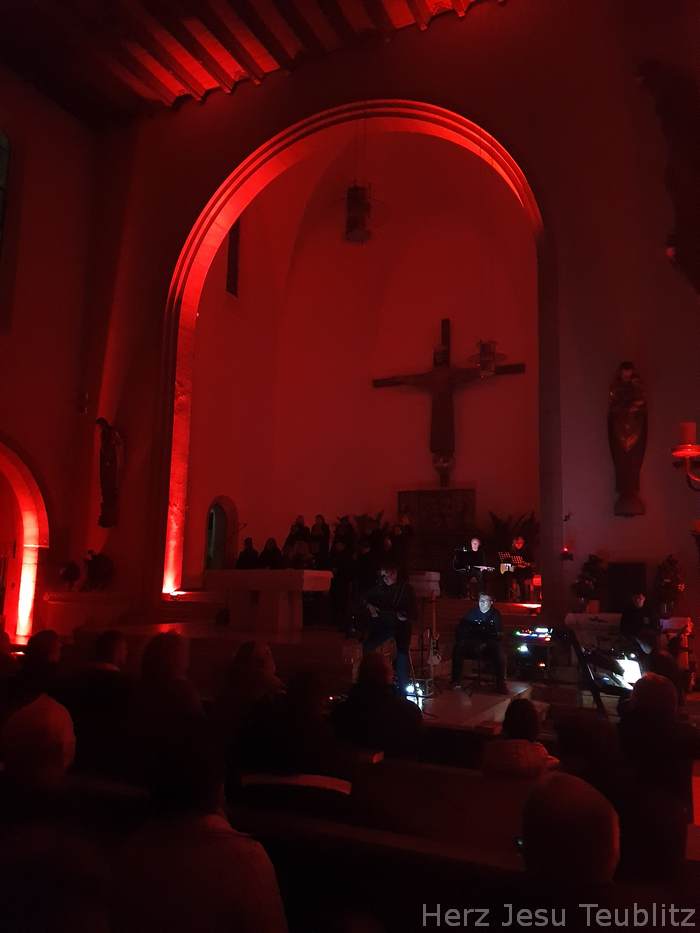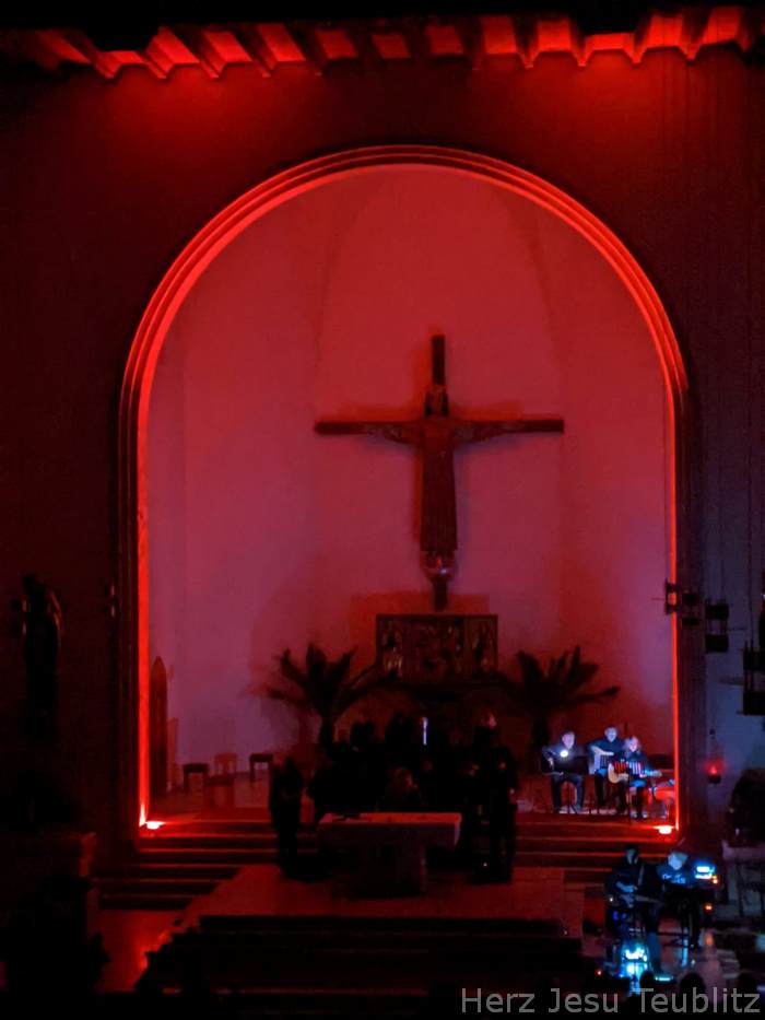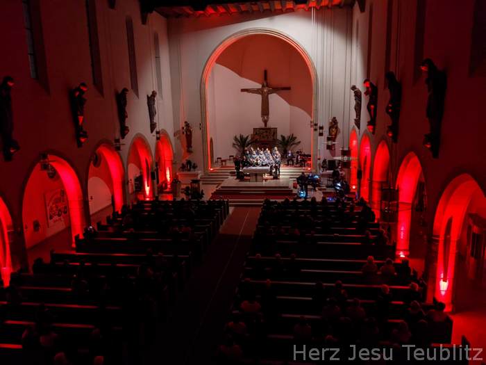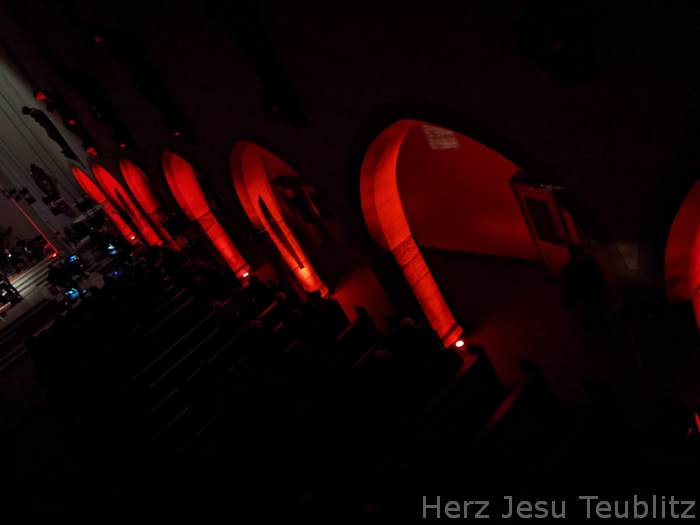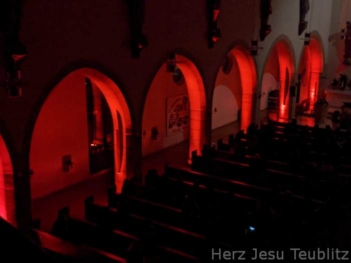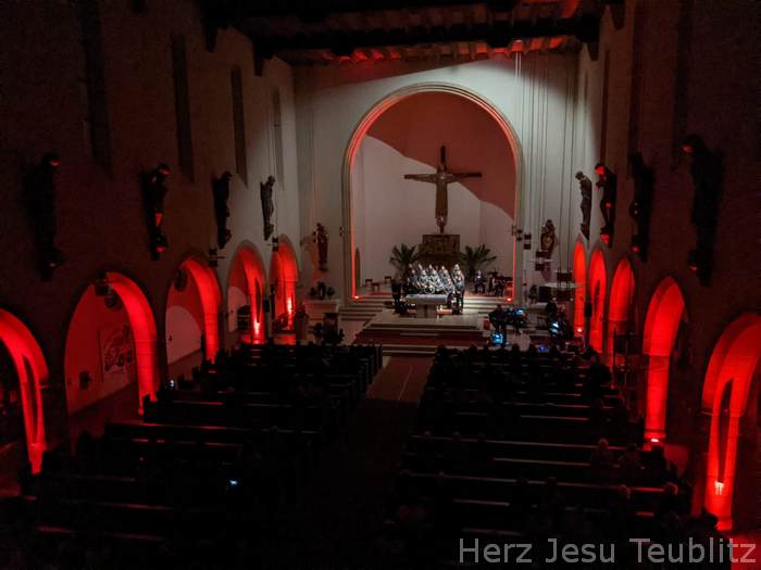 Mit zur einmaligen Atmosphäre der musikalischen Erzählung trug die Beleuchtung der Pfarrkirche bei. Passend zum Lied „Dunkelrot“ färbte sich das Gotteshaus und erstrahlte feuerrot. Auch das große Kreuz in der Apsis spielte eine wichtige Rolle. Am Ende wurde auf dieses der Seiltänzer projiziert und so augenfällig dargestellt, dass eigentlich immer von Gott die Rede war.