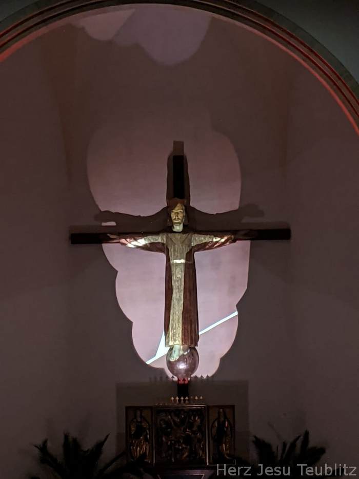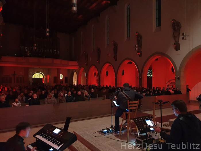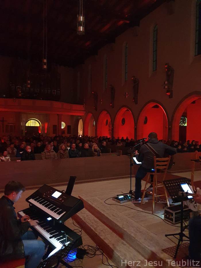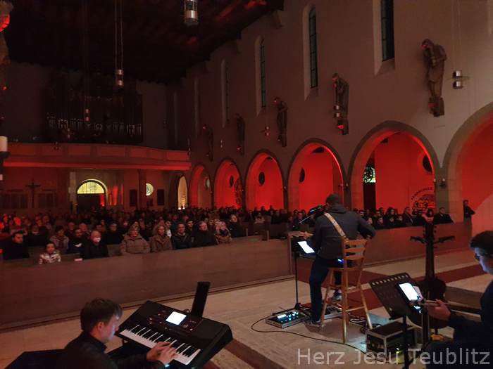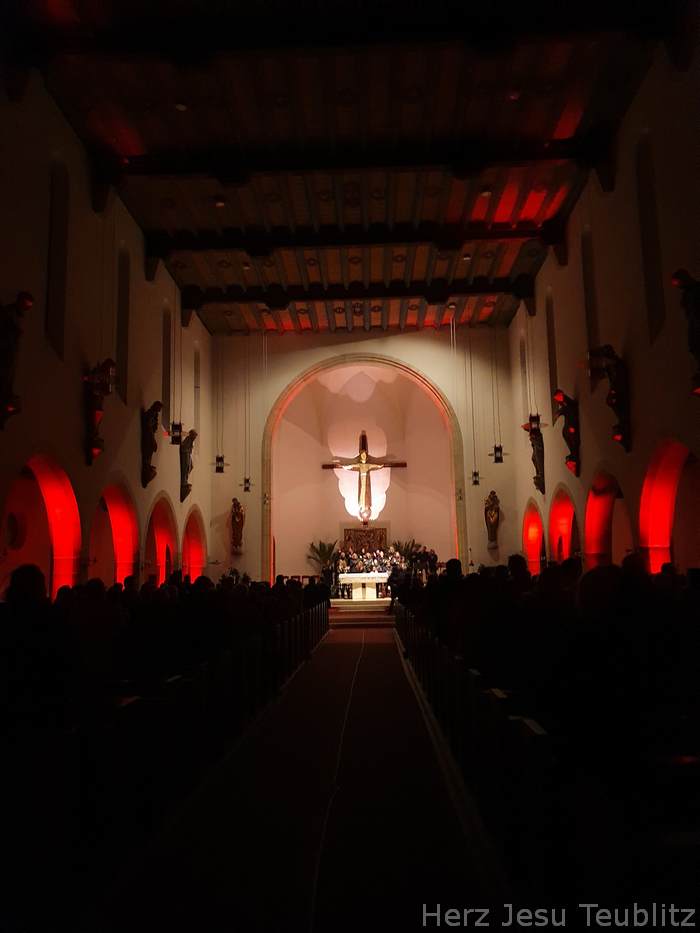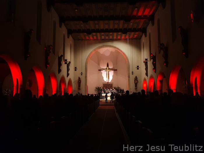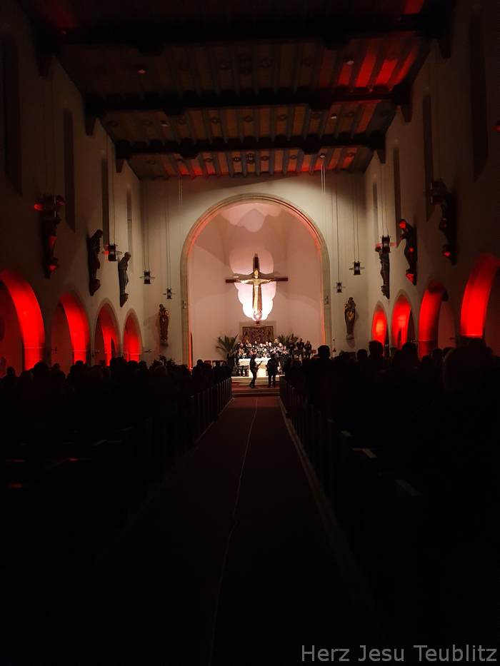 Mit zur einmaligen Atmosphäre der musikalischen Erzählung trug die Beleuchtung der Pfarrkirche bei. Passend zum Lied „Dunkelrot“ färbte sich das Gotteshaus und erstrahlte feuerrot. Auch das große Kreuz in der Apsis spielte eine wichtige Rolle. Am Ende wurde auf dieses der Seiltänzer projiziert und so augenfällig dargestellt, dass eigentlich immer von Gott die Rede war.