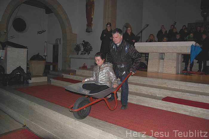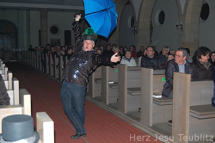 Denn in der Mitte der Aufführung wurde die Geschichte eines Seiltänzers, den Pfarrer Michael Hirmer mimte, erzählt. Er balancierte hoch über einen Marktplatz. Unter großem Staunen seines Publikums nahm der Seiltänzer ein kleines Mädchen mit auf sein Seil und setzte sie dort in eine Schubkarre. „Wie wieso traute sich wohl das Mädchen das zu?“, fragte sich die Geschichte. Schließlich stellte sich heraus, dass der Seiltänzer der Vater des Mädchens war und sie deshalb so großes Vertrauen zu ihm hatte, um mit ihm dieses waghalsigen Manöver auf dem Seil zu wagen.