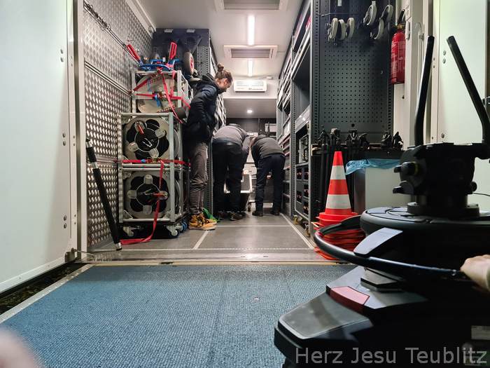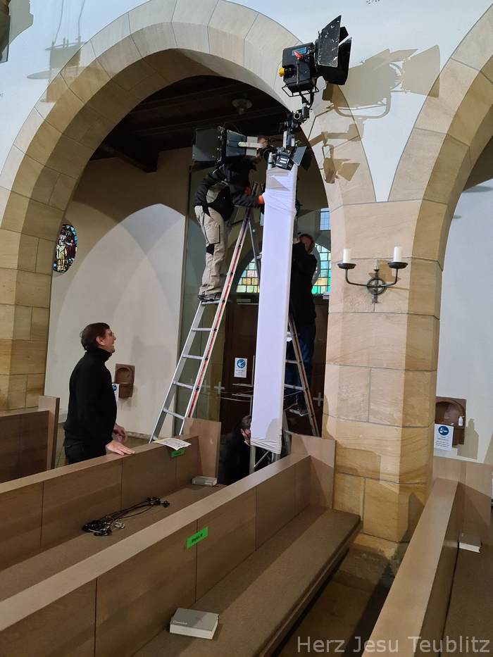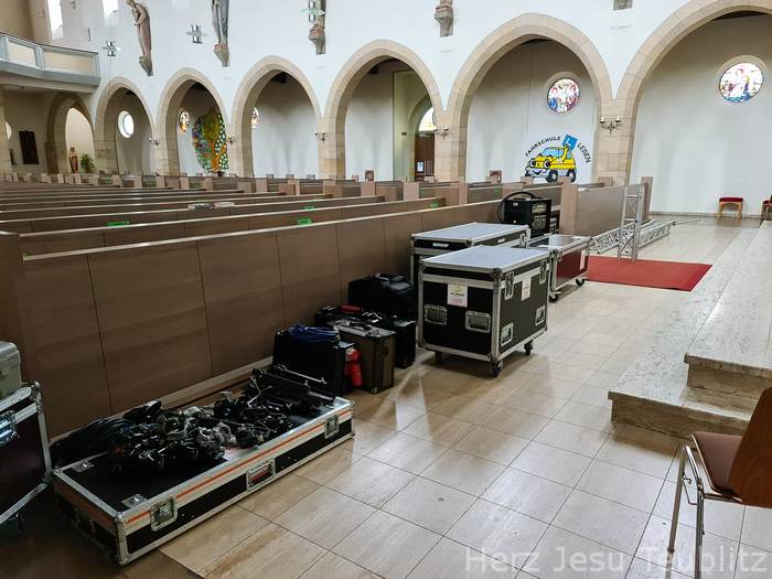 Schon Anfang Oktober gab ein eine ausführliche Vorbesprechung mit allen an der Gottesdienst-Übertragung Beteiligten. Hier wurde auch der Beleuchtungsplan für die Kirche festgelegt. Die Firma FFL-Rieger ist mit sechs Beleuchtungstechniker und einem Beleuchtungsmeister sowie mehreren Tonnen an Equipment im Einsatz, für das eigens LKW gemietet werden mussten.
