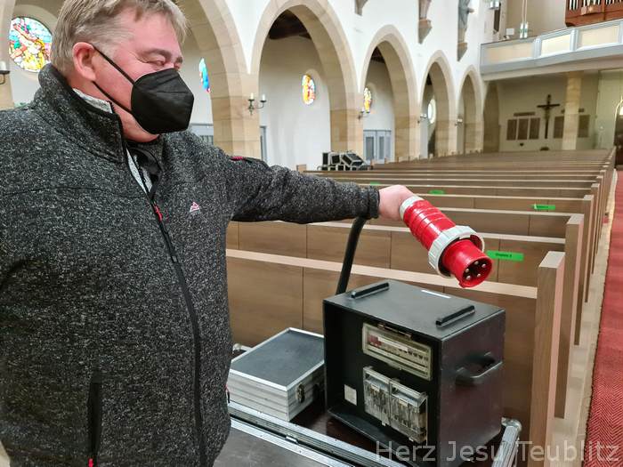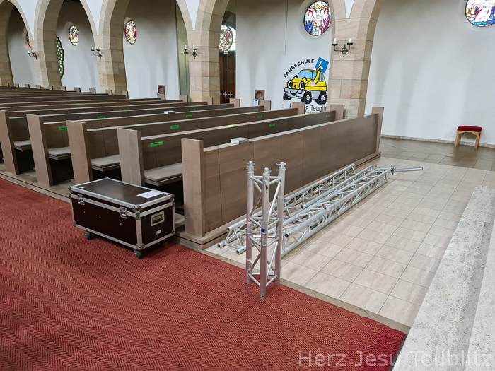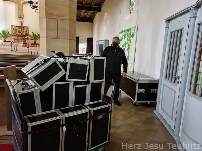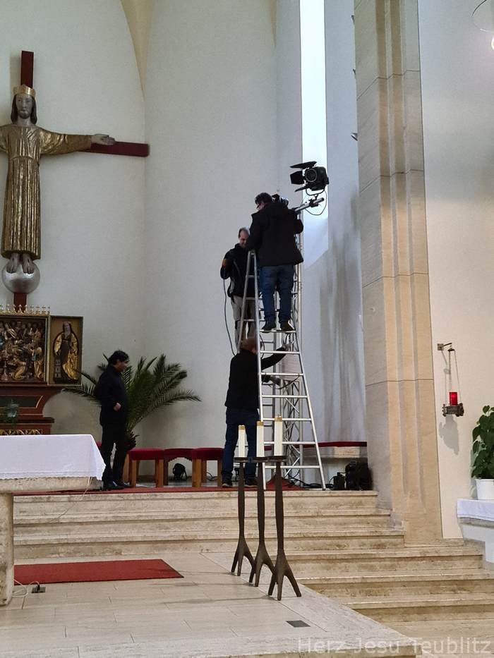 Der Countdown zur TV-Live-Übertragung aus der Teublitzer Pfarrkirche hat begonnen. 48 Stunden vor Beginn des Gottesdienstes, der am 21. November live in BR-Fernsehen übertragen wird, rollten die ersten Trunks mit dem umfangreichem Equipment an. Geleitet werden die Aufbauarbeiten von Produktionsmanagerin Silvia Hechler, die beim Bayerischen Rundfunk für schon für viele Live-Übertragungen verantwortlich war. „Im Produktionsplan ist genau geregelt, wann wer etwas aufbaut oder wann welche Besprechungen oder Vorproduktionen stattfinden.“, erklärt Stefan Weiß, der das Helfer-Team der Pfarrgemeinde koordiniert.