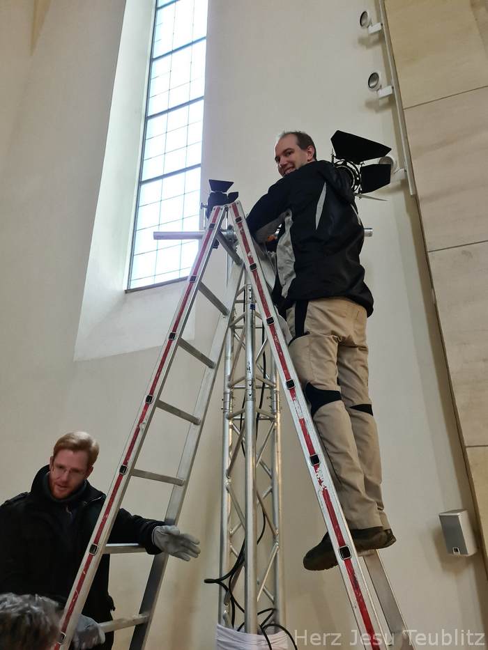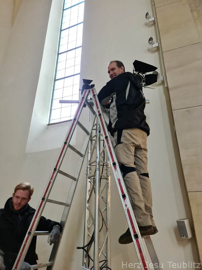 An die fünf Stunden dauerte es die Beleuchtung aufzubauen. Dabei wurden mehrere Kilometer Kabel verlegt. Mesner Günter Karcher und Stefan Weiß verklebten alle Kabel, damit auch niemand darüber stolpert.