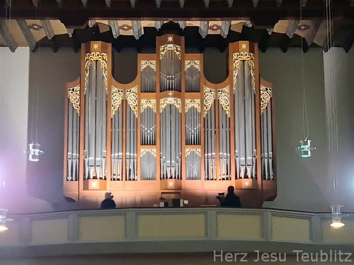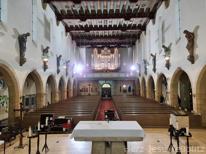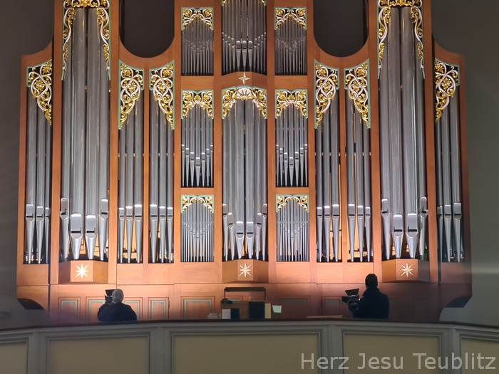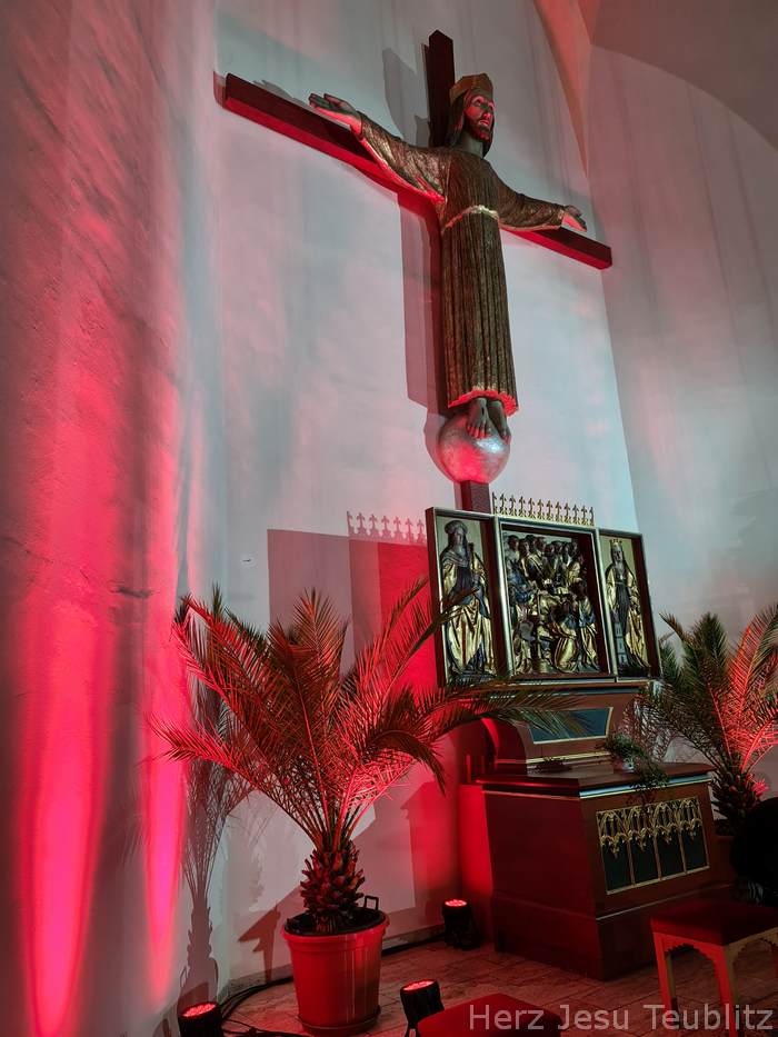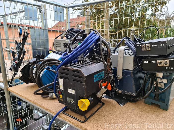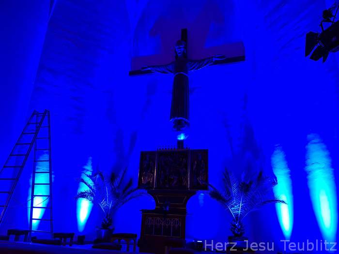 Vier große Lichtmasten stehen im Altarraum und Kirchenschiff. Auf der Empore stehen weitere sechs große Scheinwerfer. Unter der Empore finden sich zwei große Lichtfluter. Mit der roten Beleuchtung der Bögen zu den Seitenschiffen, erfreuten die Lichttechniker vor allem den Pfarrer, der ja bekanntlich ein alter Bayern-Fan ist. Ob das Rot auch während des Gottesdienstes zu sehen sein wird?