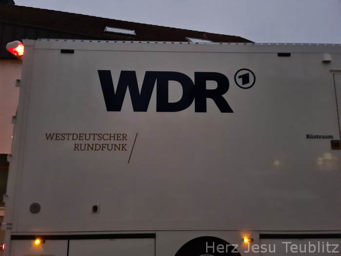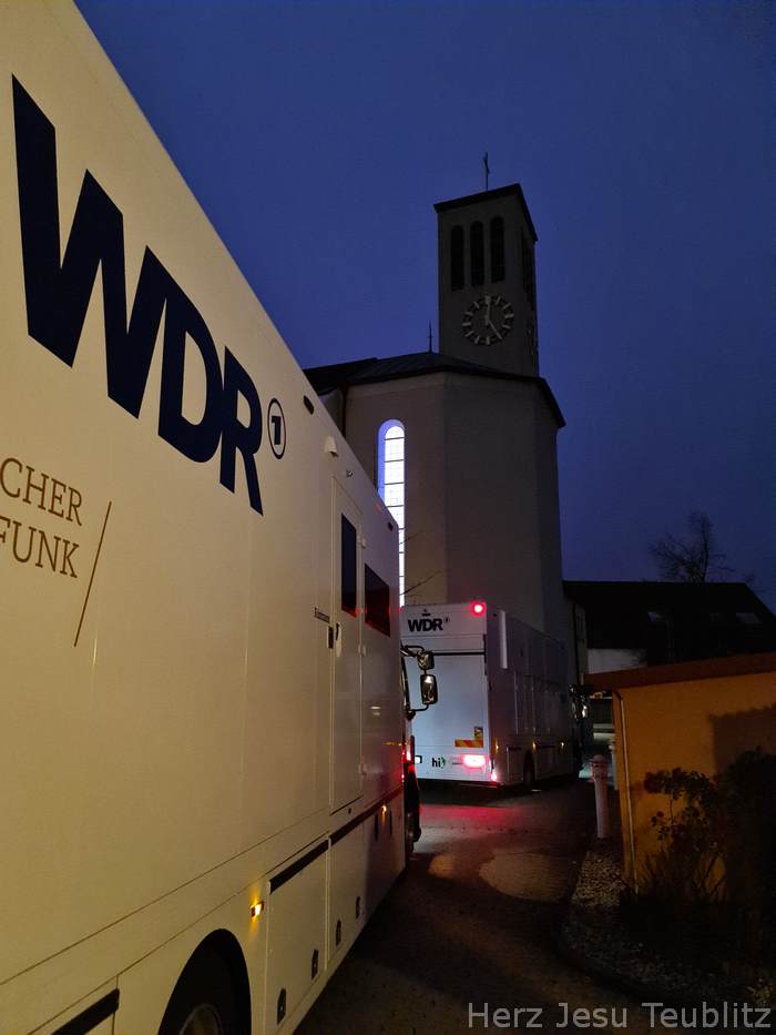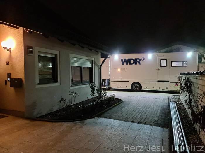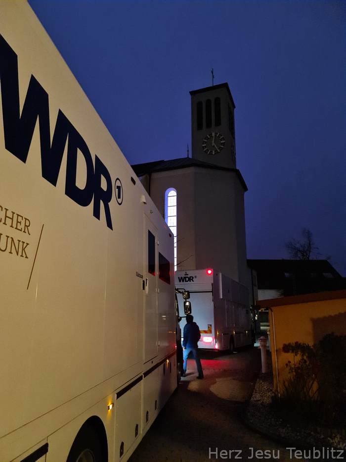 In der Dämmerung wurde es noch einmal spannend. Der große, 12 m lange, über 2,5 m breite und 4 m hohe Übertragungswagen, der vom WDR aus Köln bereit gestellt wird, musste samt Begleit-LKW in die enge Hofeinfahrt des Pfarrhofes geparkt werden. Hinzu kam noch ein 12tonner Rüstwagen. Millimeterarbeit war angesagt. Doch die Übertragungstechnik steht bereit. Sie wird morgen den ganzen Vormittag aufgebaut werden.