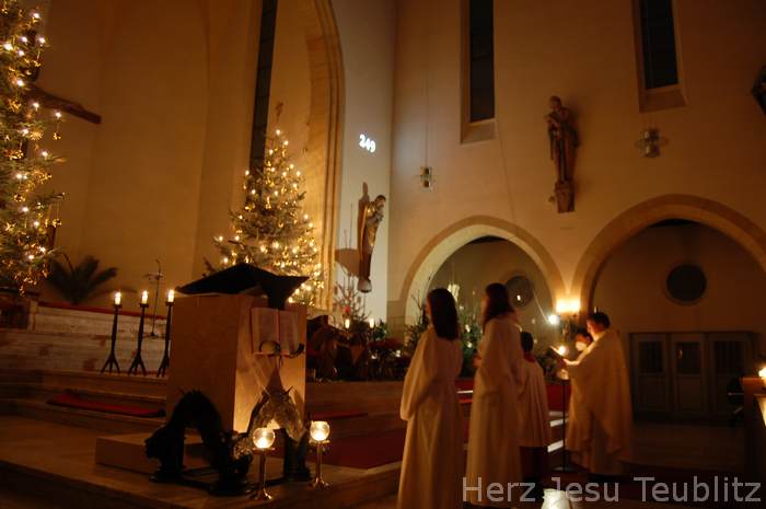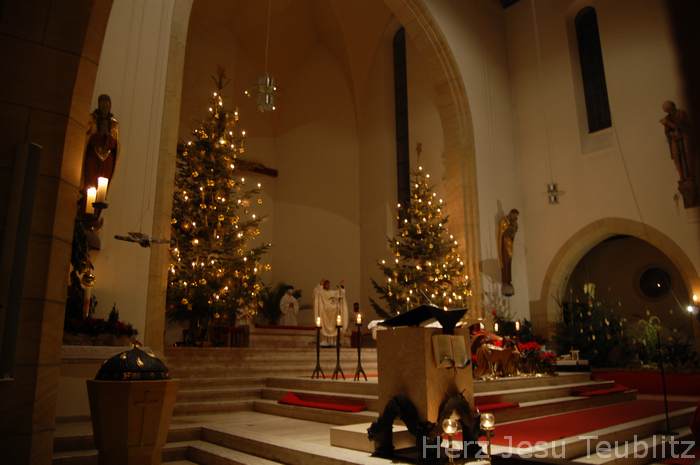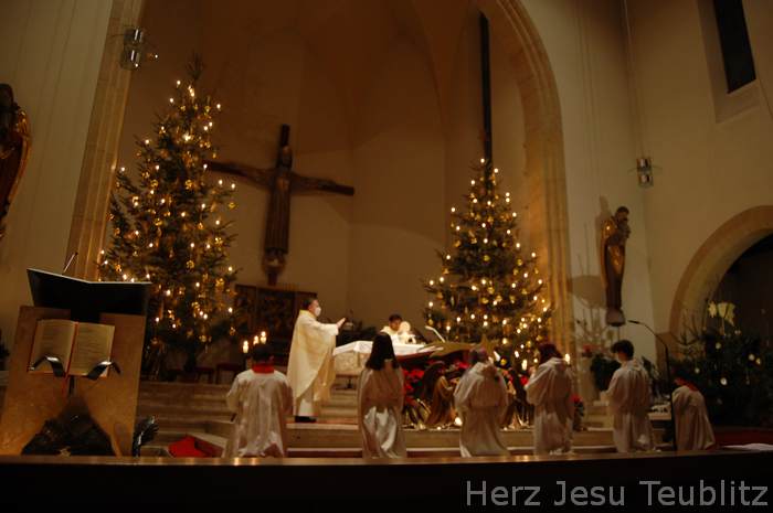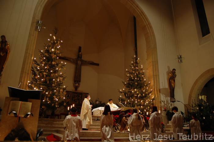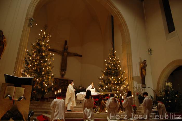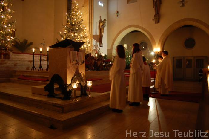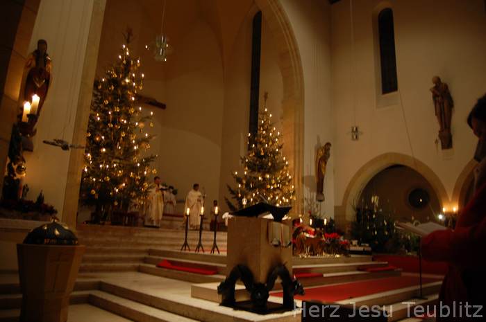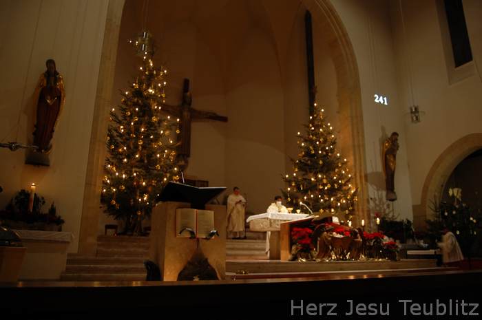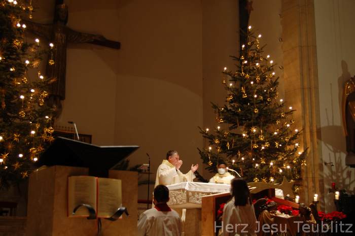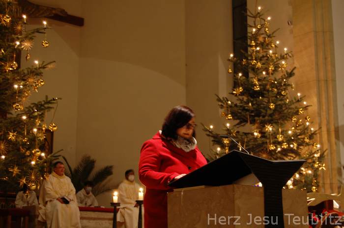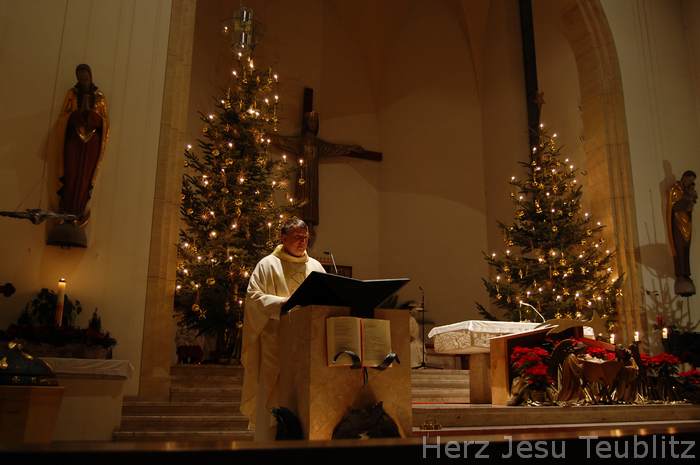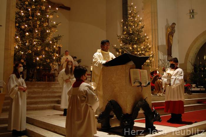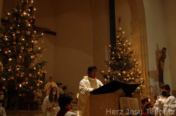 Zwei Christmetten feierte die Pfarrgemeinde Herz Jesu am Heiligen Abend. Die Saltendorfer Mette fand dabei wegen der Corona-Vorgaben um 19 Uhr in der Pfarrkirche statt. Die feierliche Christmitte am Abend wurde durch den Kirchenchor begleitet von einem Orchester musikalisch gestaltet. In seiner Weihnachtspredigt lud Pfarrer Michael Hirmer die Gläubigen ein, vor das Kind in der Krippe zu treten. Kaplan William Akkala zelebrierte die Mette um 19 Uhr.