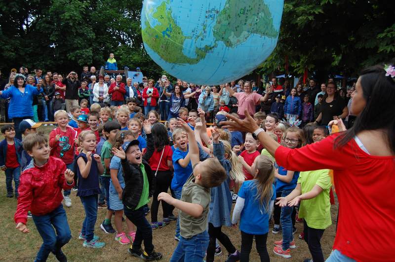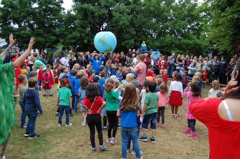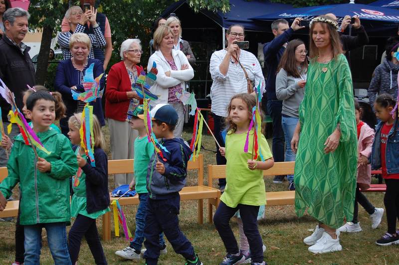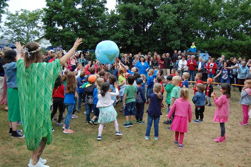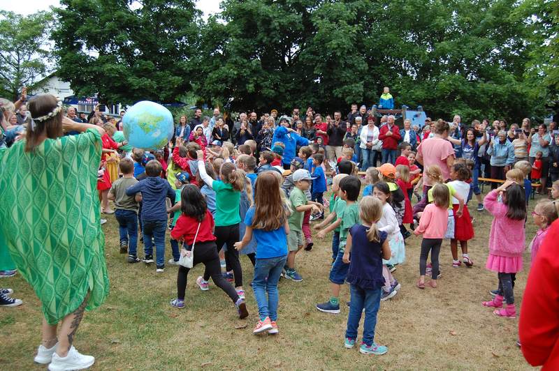 Bei ihrer Begrüßung musste Kinderhausleitung Helga Schmid von Dekan Michael Hirmer noch beschirmt werde, da noch Tropfen vom Himmel fielen. Die Regenpause aber nutzten die Kindergarten- und Kinderkrippenkinder für ein buntes Spektakel. Schon beim Einzug der Kleinen auf die große Spielwiese war klar: Es muss um Farben gehen. Denn jede Gruppe trug eine andere. Blau, rot, gelb, grün, weiß, schwarz und viele mehr tummelten sich im mitten der großen Runde. Dieser Anblick tat nach zwei Jahren Corona-Ausnahmezustand gut. Denn lange durften die Kinder nicht mehr zusammen spielen und wurden mussten streng nach Gruppen getrennt werden. Höhepunkt war, als ein großer mit Luft gefüllter Erden-Ball in die die Mitte geworfen und immer wieder von Klein und Groß in die Luft bugsiert wurde.