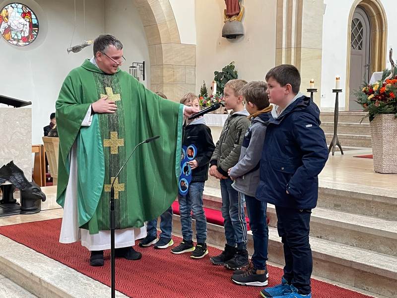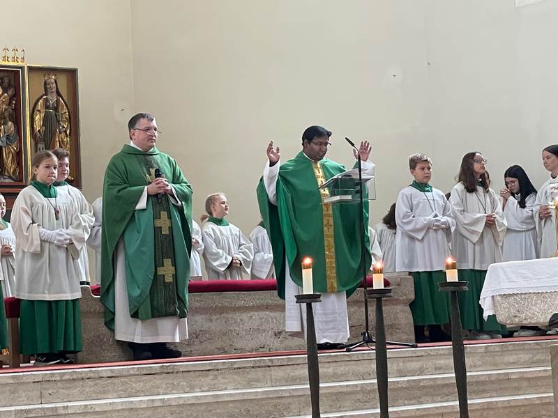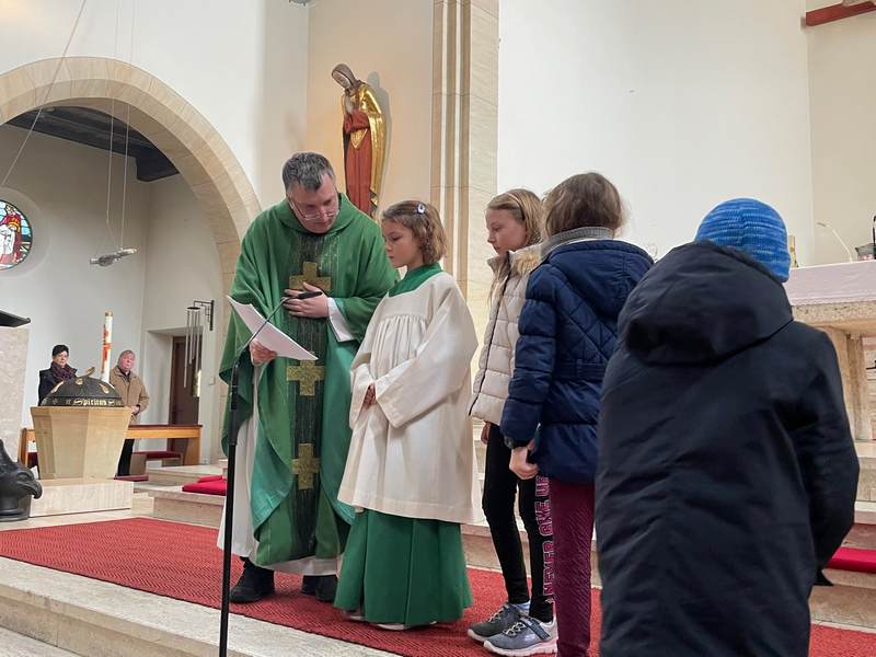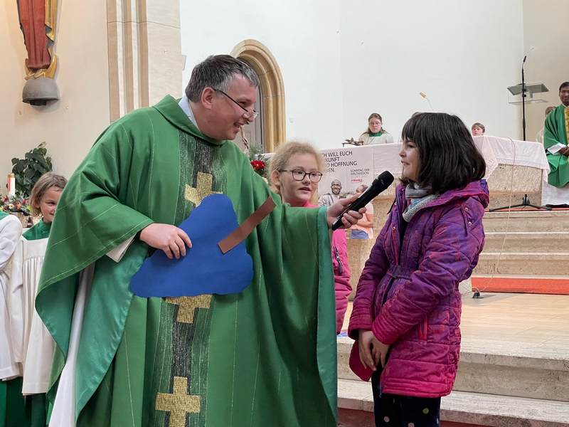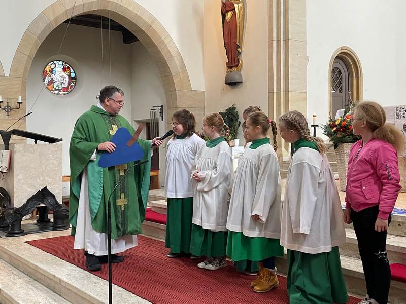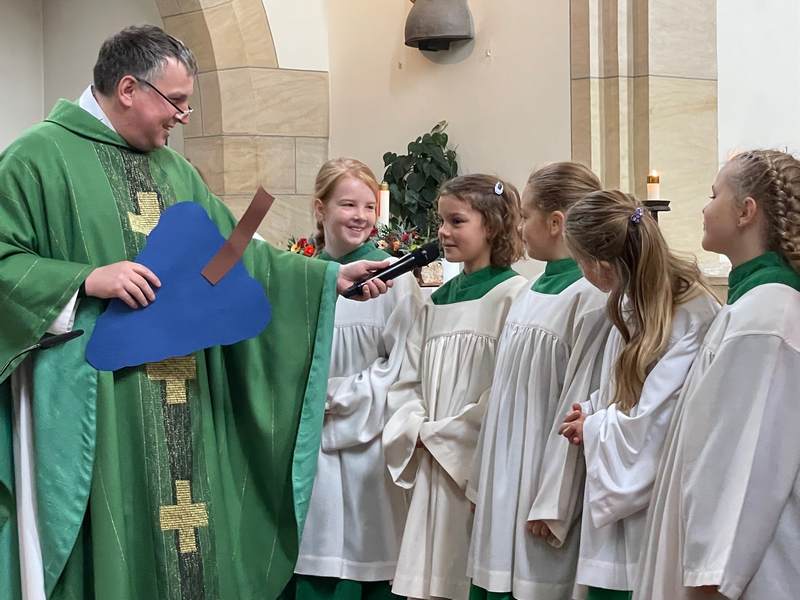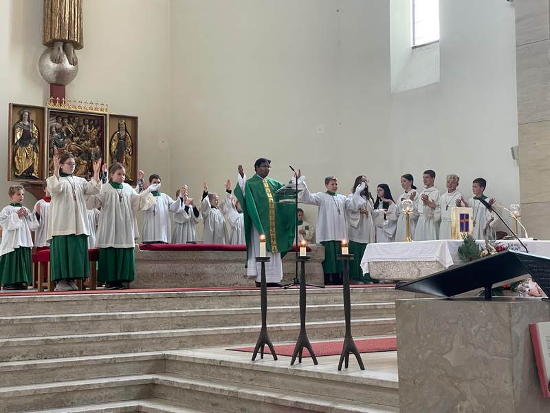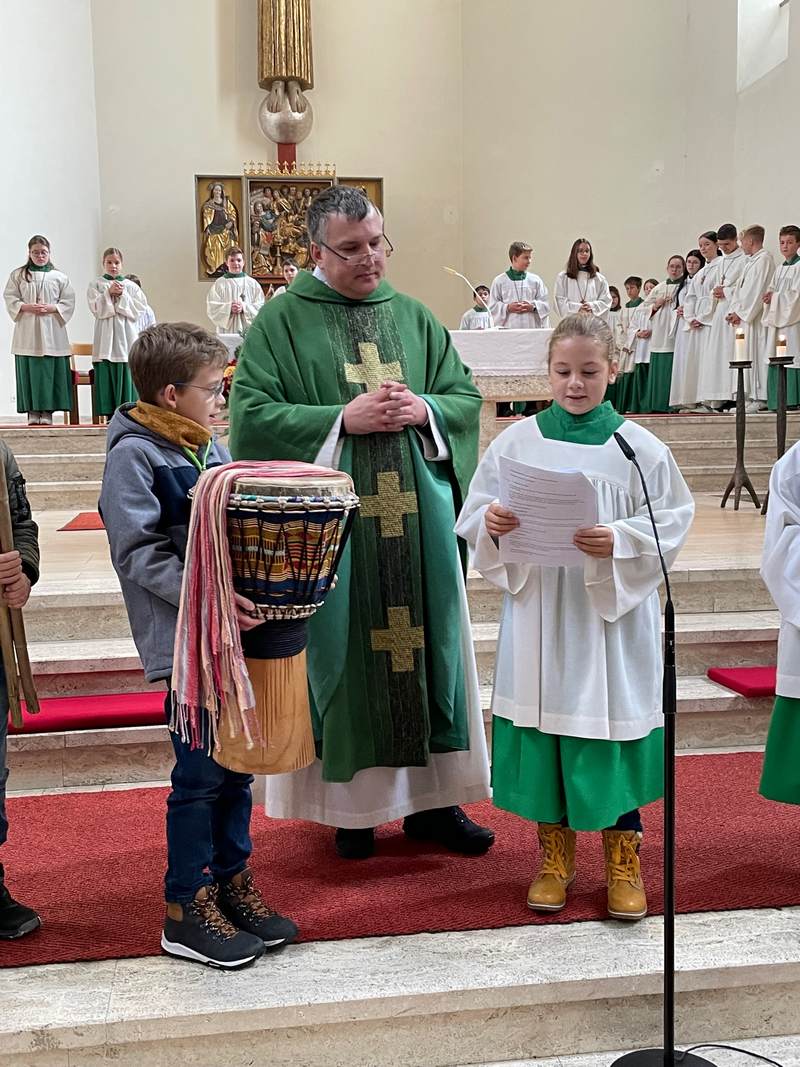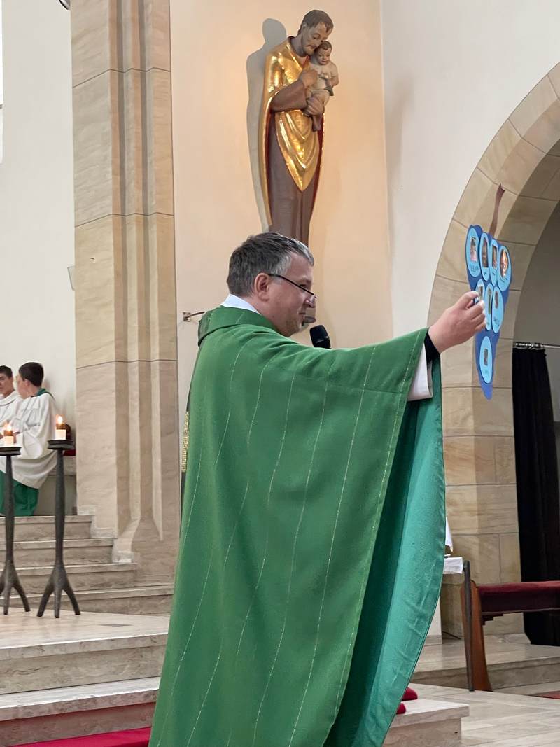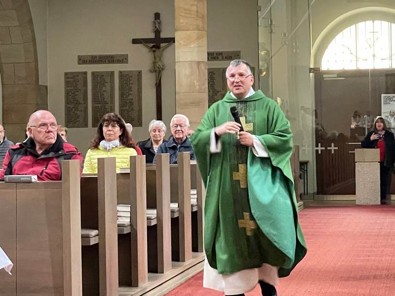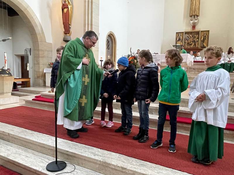 Dabei waren diese aktiv in den Gottesdienst mit eingebunden. Schon gleich zu Beginn galt es die Jubelrufe an Jesus Christus im Kyrie vorzulesen. In seiner Predigt erinnerte der Teublitzer Pfarrer Dekan Michael Hirmer daran, dass weltweit in tausenden von verschiedenen Sprachen täglich Menschen beten. Dabei schritt er den langen Mittelgang ab und fragte die anwesenden Gläubigen, welche Muttersprachen sie denn sprechen. Das Erstaunen war, dass neben Deutsch noch sieben andere Sprachen in der Pfarrgemeinde Teublitz zu Hause sind. „Miteinander sind wir eine große Familie Gottes!“, fasste der Dekan seine Predigt zusammen, „ganz egal welche Sprache wir sprechen, wir sind alles geliebte Kinder Gottes.“