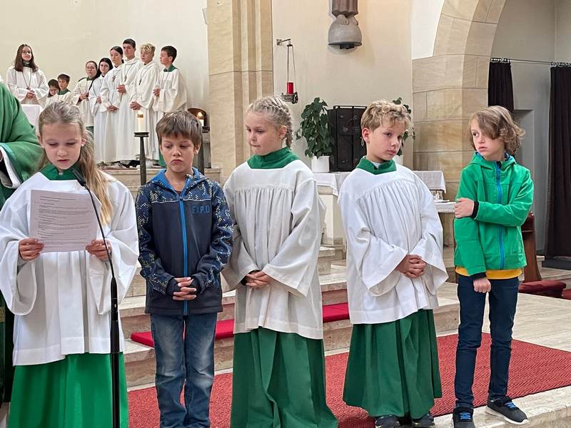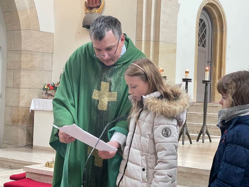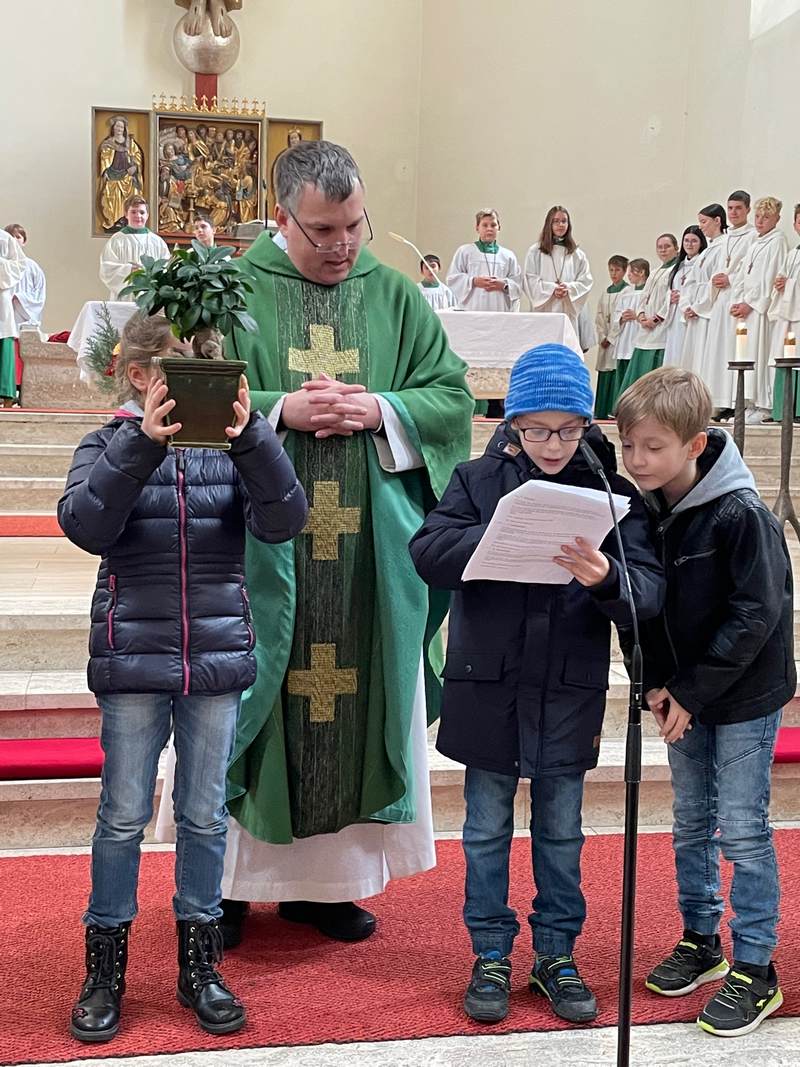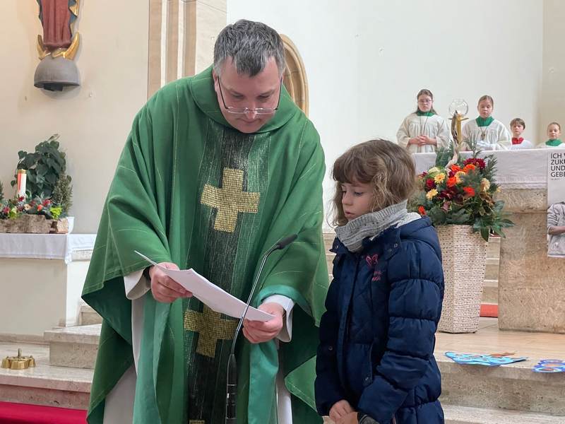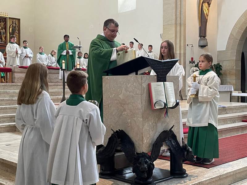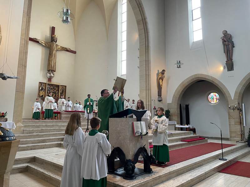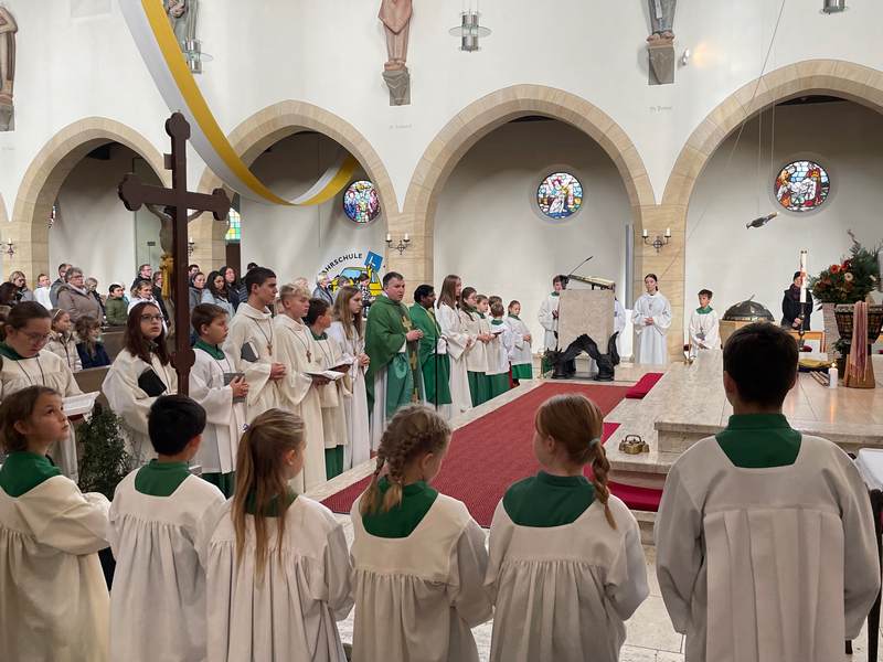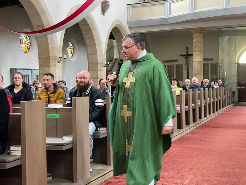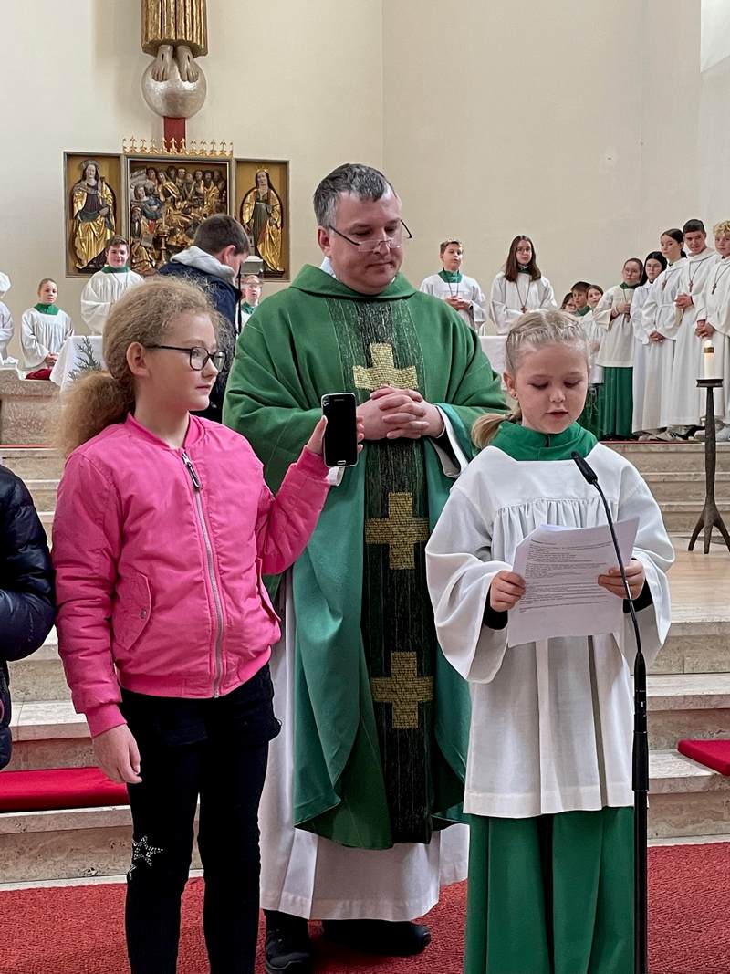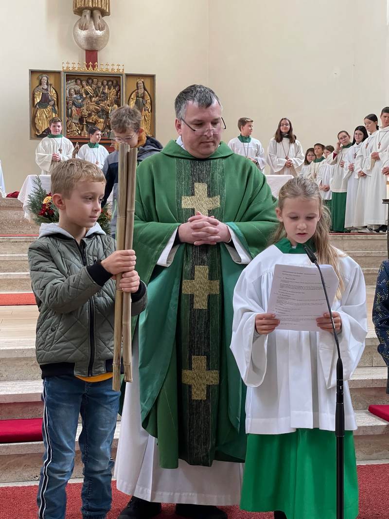 Dabei waren diese aktiv in den Gottesdienst mit eingebunden. Schon gleich zu Beginn galt es die Jubelrufe an Jesus Christus im Kyrie vorzulesen. In seiner Predigt erinnerte der Teublitzer Pfarrer Dekan Michael Hirmer daran, dass weltweit in tausenden von verschiedenen Sprachen täglich Menschen beten. Dabei schritt er den langen Mittelgang ab und fragte die anwesenden Gläubigen, welche Muttersprachen sie denn sprechen. Das Erstaunen war, dass neben Deutsch noch sieben andere Sprachen in der Pfarrgemeinde Teublitz zu Hause sind. „Miteinander sind wir eine große Familie Gottes!“, fasste der Dekan seine Predigt zusammen, „ganz egal welche Sprache wir sprechen, wir sind alles geliebte Kinder Gottes.“
