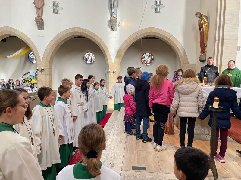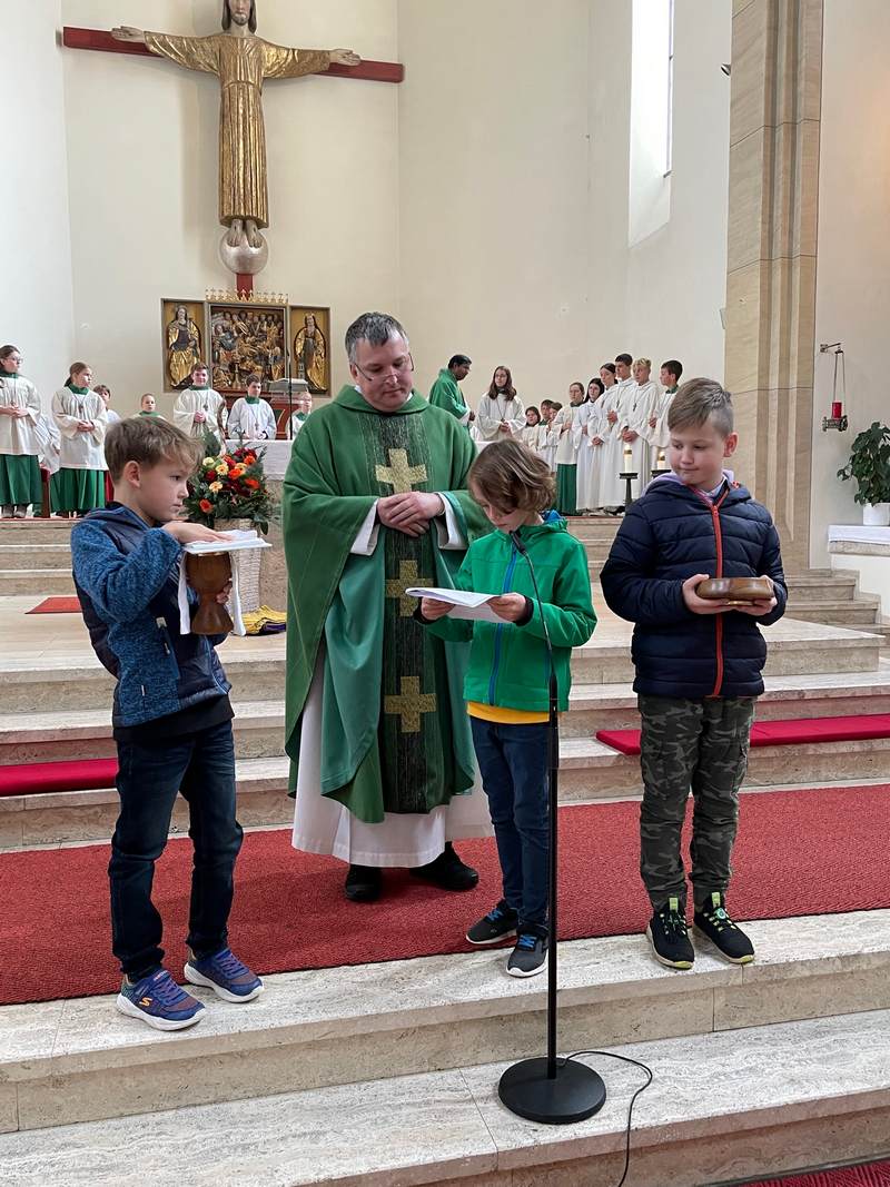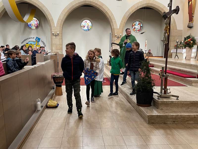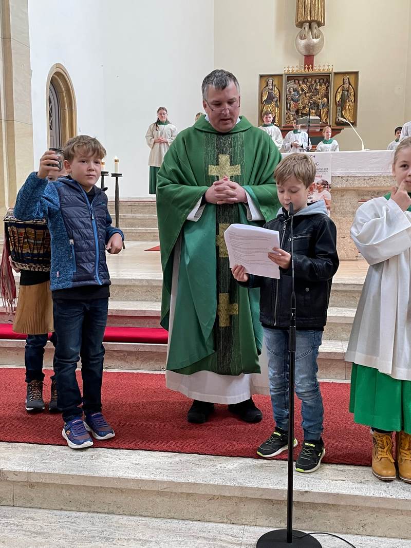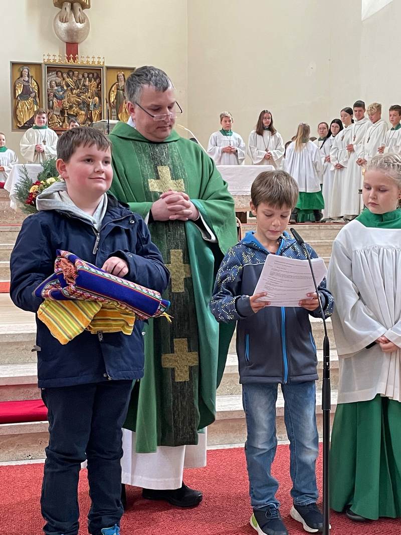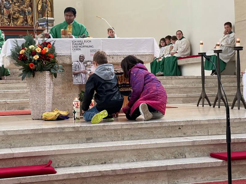 Besonders aufwendig wurde die Fürbitte gestaltet. In Zusammenarbeit mit dem Weltladen Teublitz bereitete Kaplan Akkala eine große Prozession vor, in der die Kommunionkinder viele Symbole zum Altar brachte und dabei Fürbitte besprochen. Besonders beeindruckend war das Hochgebet, bei dem sich alle Kinder um den Altar versammelten.