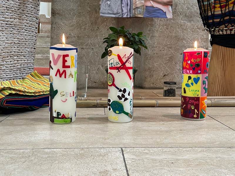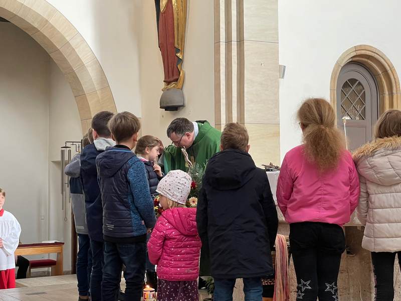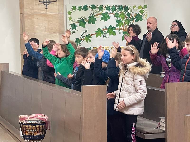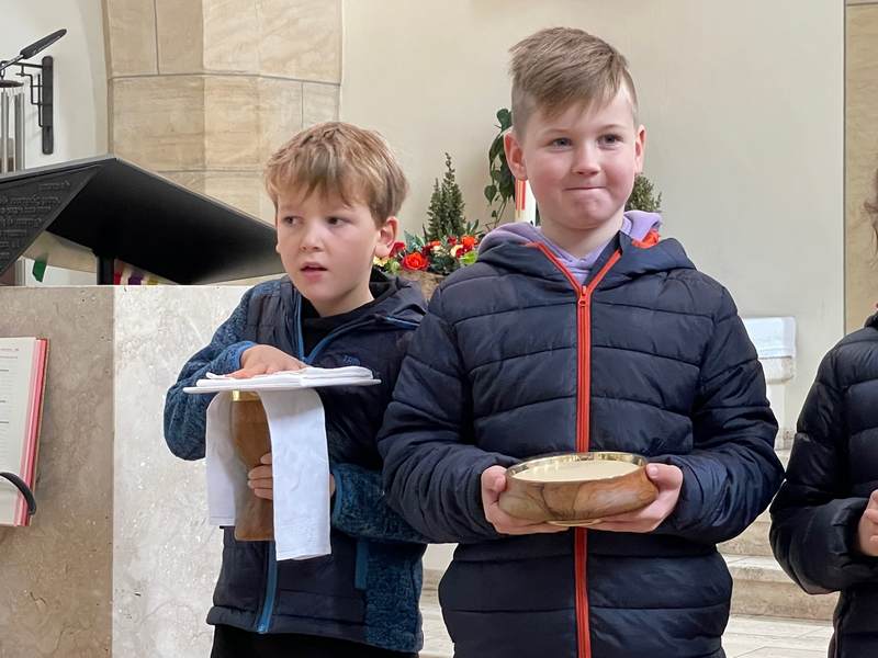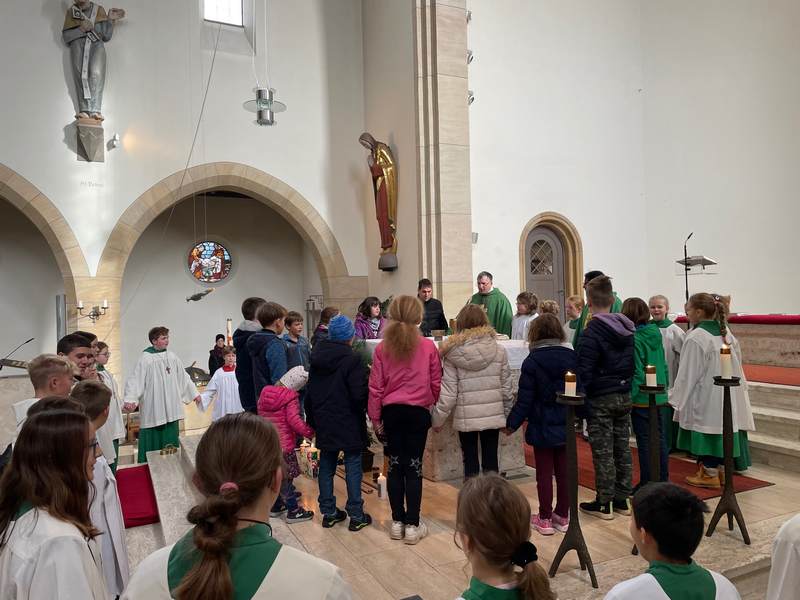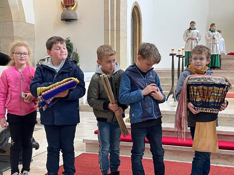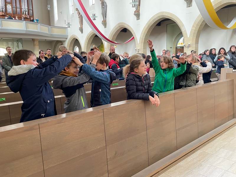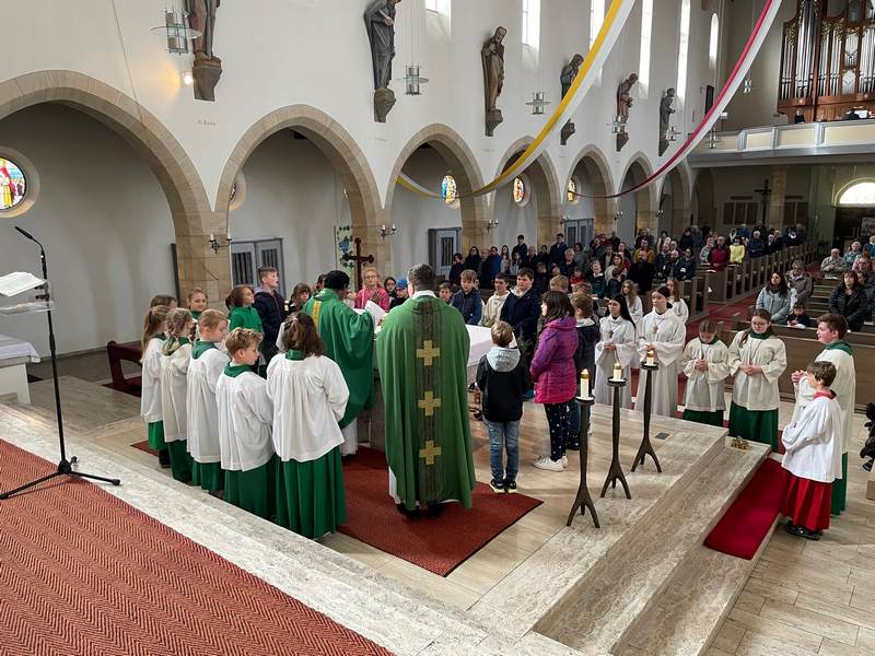 Besonders aufwendig wurde die Fürbitte gestaltet. In Zusammenarbeit mit dem Weltladen Teublitz bereitete Kaplan Akkala eine große Prozession vor, in der die Kommunionkinder viele Symbole zum Altar brachte und dabei Fürbitte besprochen. Besonders beeindruckend war das Hochgebet, bei dem sich alle Kinder um den Altar versammelten.