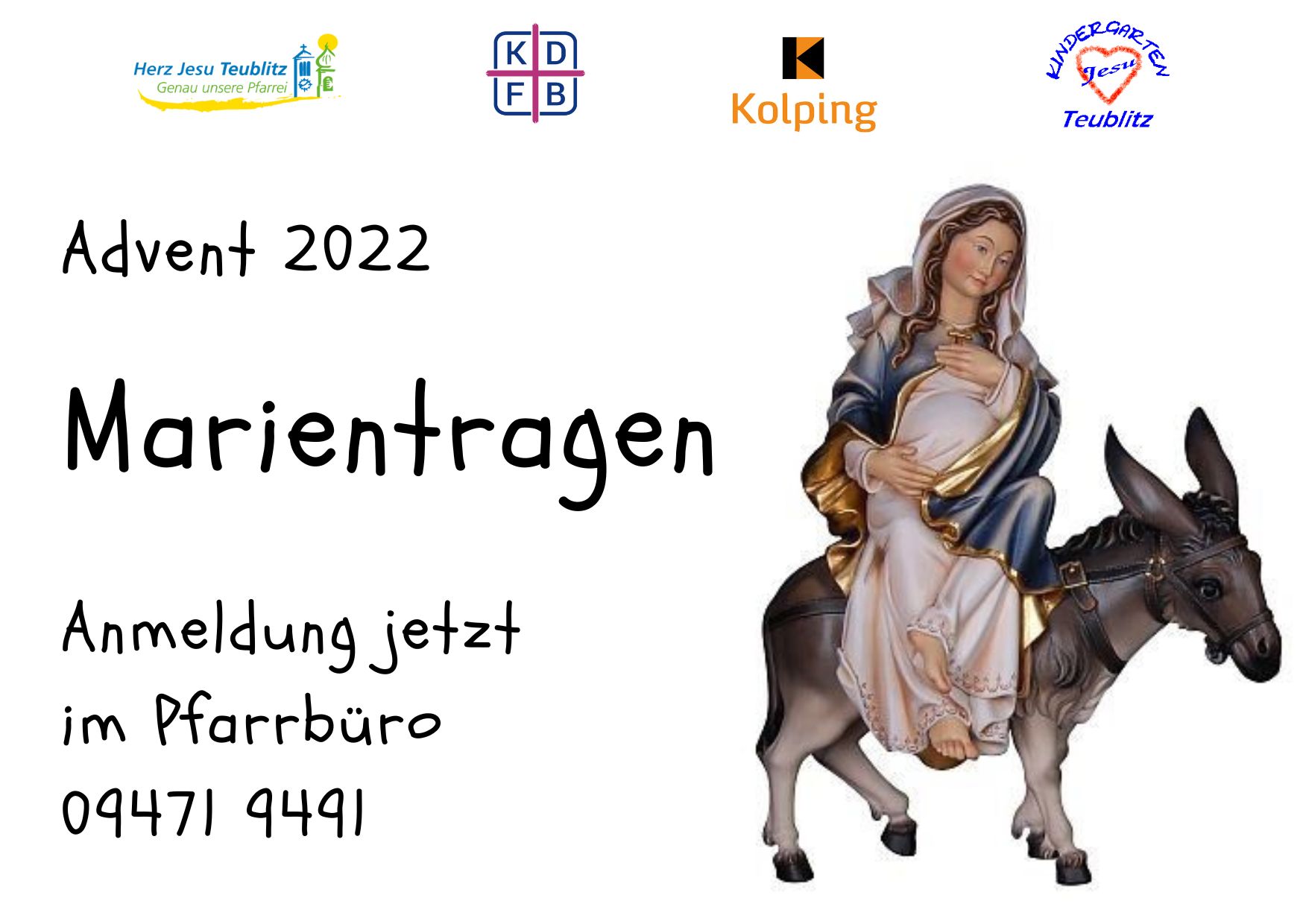 „Dabei geht es letztlich darum, dass wir in einer Zeit des immer größeren Egoismus und der immer größeren Ängste ein Zeichen des Miteinanders und des Füreinanders setzen wollen.“, erklärt Pfarrgemeinderatssprecher Georg Niederalt den Mehrwert des Marientragens für die heutige Zeit. Dabei wird während der ganzen Adventszeit eine Statue einer schwangeren Gottesmutter Maria von Haus zu Haus getragen. „Es war schön, die Gottesmutter am Abend zu empfangen,“ beschreibt Karin Senft ihre Erlebnisse, „gemeinsam haben wir uns in der Familie mit den Kindern und Enkelkindern versammelt, gebetet und einen schönen Abend miteinander verbracht.“